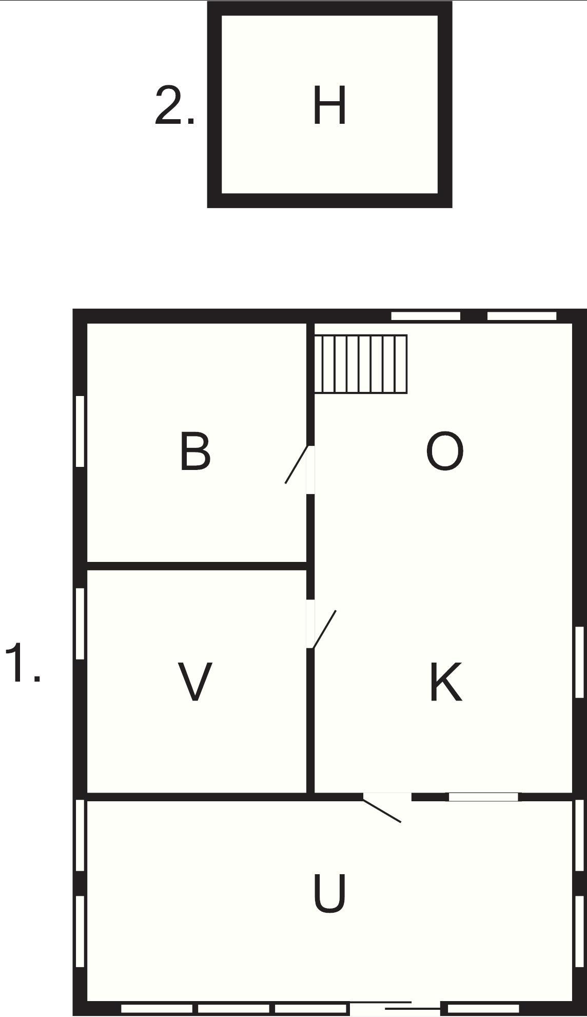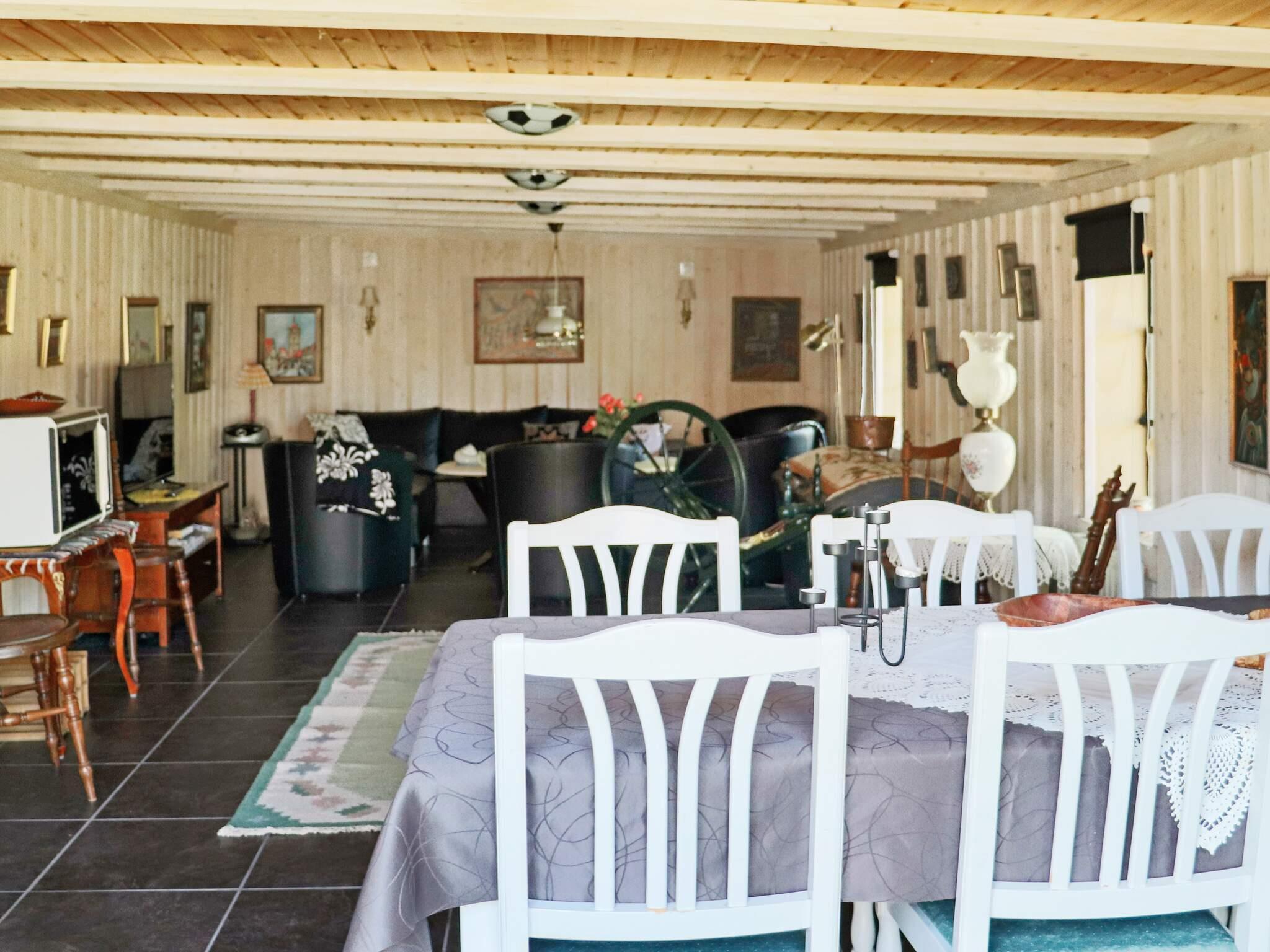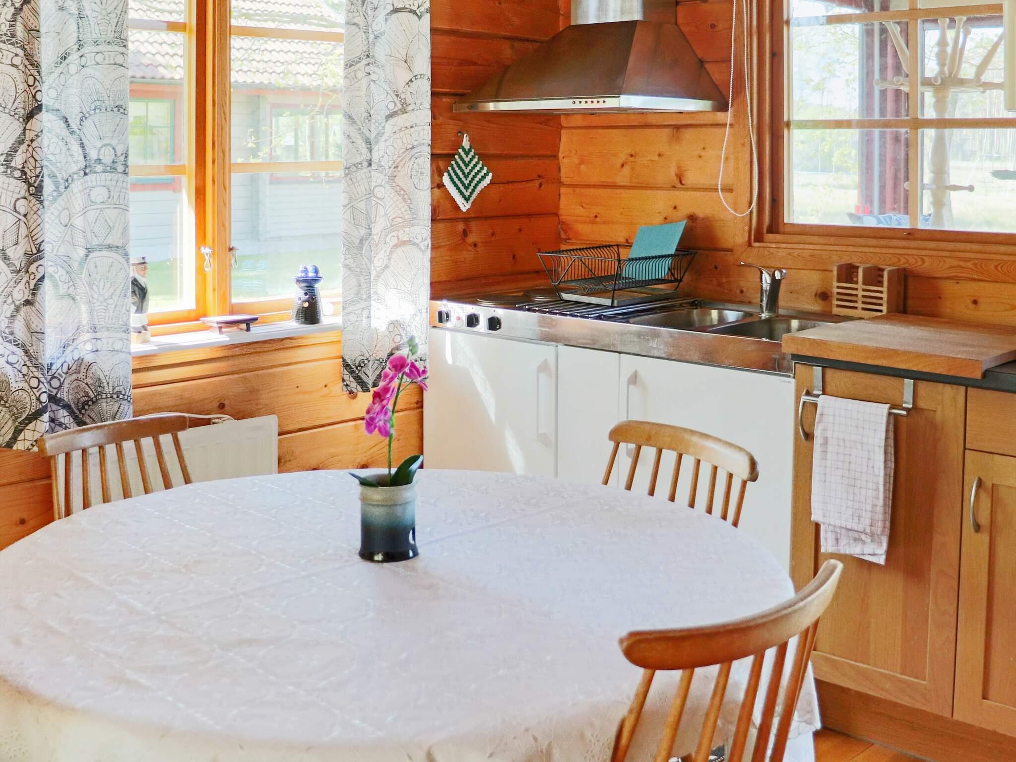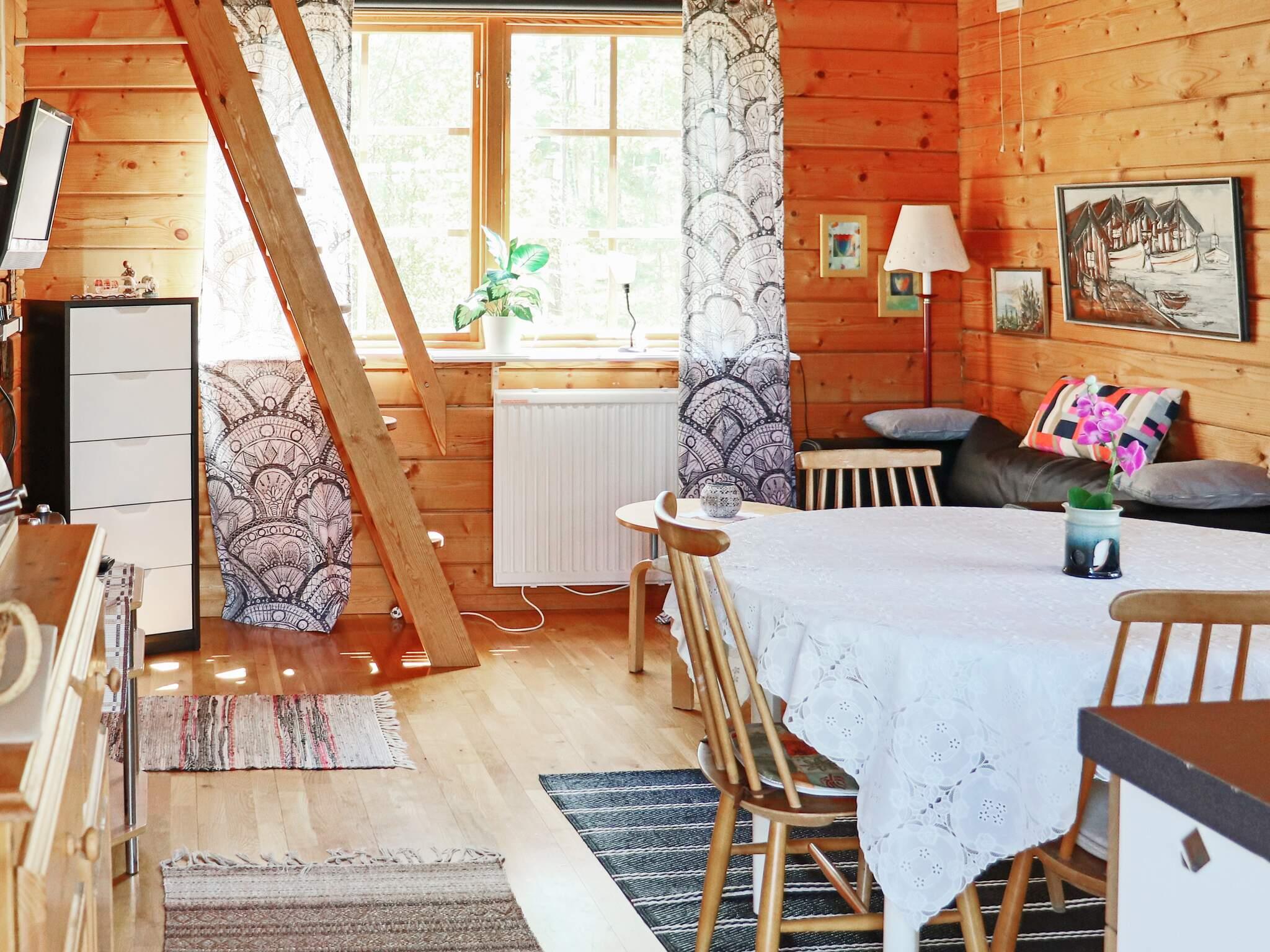 Vid stugans entré har ni ett inglasat uterum med både matbord och utemöbler. Stugans centrala rum är ett vardagsrum med ett öppet kök. Här finns all utrustning och en TV med flera kanaler. Sovrummet har två enkelsängar och badrummet har dusch och tvättmaskin. En brant trappa upp finns ett sovloft med tre enkelsängar i form av bekväma resårmadrasser. Det här gillar barn och ungdomar. Utanför stugan finns utemöbler och grill och på den öppna gräsängen finns både studsmatta och gungor. En bit bort finns ”ladan”, en gemensamhetslokal som ni kan utnyttja i samråd med ägaren. Här finns en lokal med stort matbord, sköna sittmöbler och TV. Intill finns också toaletter och dusch. Stugan ligger intill en camping och ni har fri tillgång till deras lekplats mm. Här finns också en sommarrestaurang och en liten butik.