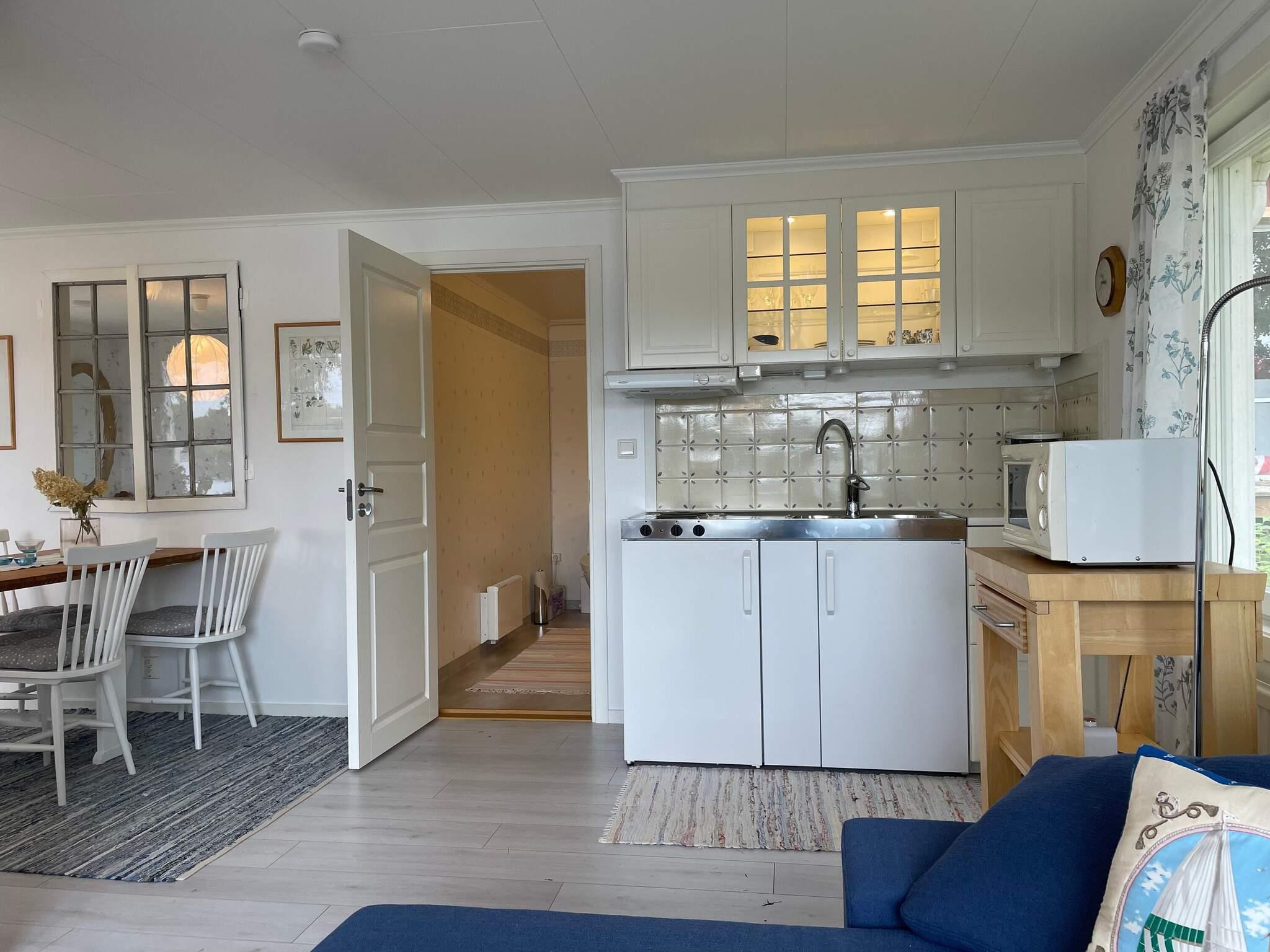 Huset är ljust och mycket hemtrevligt. Passar perfekt för barnfamiljen eller sällskap på 4 personer som vill ha det perfekta läget för bad och närhet till många naturupplevelser. Stugan delar tomt med husägaren som bor i det större gula putshuset framför Ert boende. Ni delar brygga och badplats med husägaren. Du kan köra ner i en liten backe precis utanför huset på grusplan där du välkomnas av storslagen utsikt och härlig gräsmatta. Altanen går längs med ert boende med sittplatser på soldäck och utomhusgrill. Hallen är ljus där matplats, köksdelen och vardagsrummet har en öppen planlösning. Matplatsen har bord och stolar för 4 personer med ett litet fönster in till sovrummet.