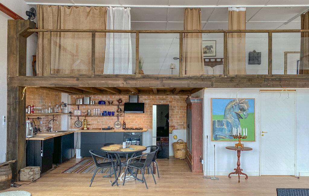 Oplev en uforglemmelig ferie i dette unikke feriehus. Beliggende direkte ved bredden af ??en fjord, kombinerer det industriel charme med en hyggelig boligatmosfære. Lad jer inspirere af det åbne opholdsrums vidde. Højt til loftet, store sprossede vinduer og nænsomt restaurerede detaljer skaber en stilfuld stemning. Slap af i den hyggelige opholdsstue med tæpper og liggestole eller nyd måltider sammen ved det store spisebord. Det åbne, rustikke udseende, men alligevel moderne køkken lægger op til at lave mad sammen. Bagefter kan I slappe af i det åbne galleri på øverste etage, hvorfra I kan overskue rummet.