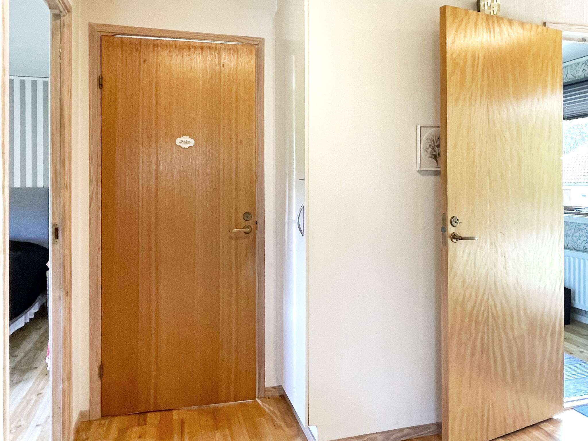 Huset ligger avskilt uppför en liten backe med stora gräsytor perfekt för lek. Till huset finns en härlig inglasad uterum med gott om sittplatser för att inta goda måltider. Du välkomnas in i en mindre hall. Kök och vardagsrum är integrerat i ett med en öppen och enkel planlösning. Till höger av hallen finns två sovrum. Det första har en dag bädd där man kan dra ut madrassen som blir en skön säng på 160 cm. Här finns även leksaker för barnen och sällskapsspel. Det andra har en dubbelsäng på 180 cm med ljus trevlig inredning. Badrummet är också ljust med duschkabin, wc och handfat.