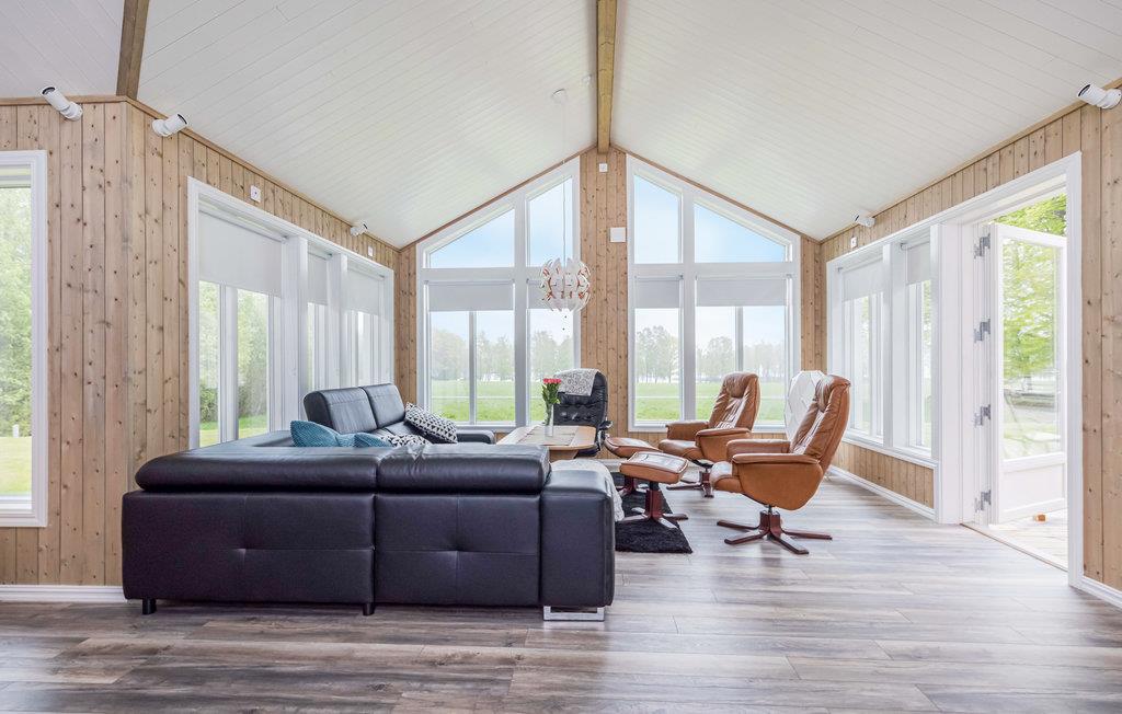 Den rummelige, lyse og den gennemtænkte indretning af jeres feriehus i naturlige omgivelser skaber en hyggelig atmosfære, hvor I straks kan føle jer hjemme. Den rummelige stue med gulv til loft-vinduer giver jer en smuk udsigt over det omkringliggende landskab og søen. Slå jer ned i de komfortable sofaer og nyd den hyggelige varme fra brændeovnen. Det elegante køkken er moderne udstyret og lægger op til at lave mad sammen. Der er plads til, at hele familien kan nyde måltiderne eller planlægge dagen ved det store spisebord, enten i opholdsstuen eller udenfor på terrassen.