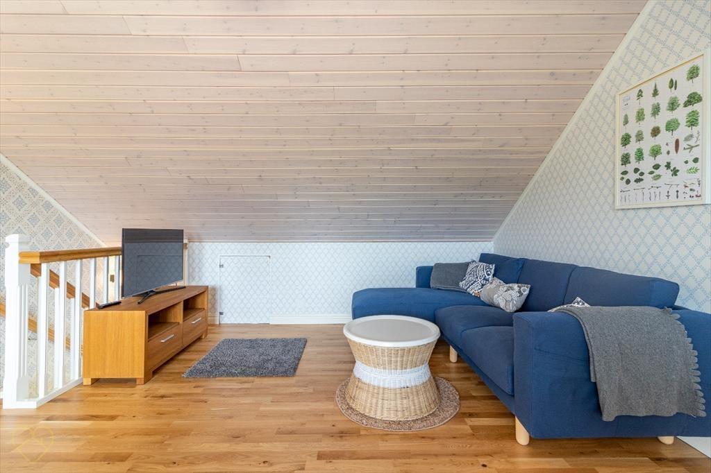 Det nyopførte hus tilbyder cirka 125 m² boligareal fordelt på to etager og har plads til op til 8 personer. I stueetagen finder du en åben entré, en stor stue med sofa, tv og brændeovn samt adgang til den store terrasse med havemøbler og grill. Det åbne køkken har opvaskemaskine og et keramisk komfur med fire kogeplader; derudover findes ovn, emhætte, køle-/frysekombination, mikrobølgeovn og kaffemaskine. I stueetagen ligger desuden tre soveværelser (et med dobbeltseng, to med køjeseng), et flisebelagt badeværelse med toilet og bruser samt et bryggers med vaskemaskine. Via en trappe kommer du til den øverste etage med en anden stue med sofa, tv og stort spisebord; herfra når du det fjerde soveværelse med dobbeltseng samt et andet badeværelse med toilet og bruser.
