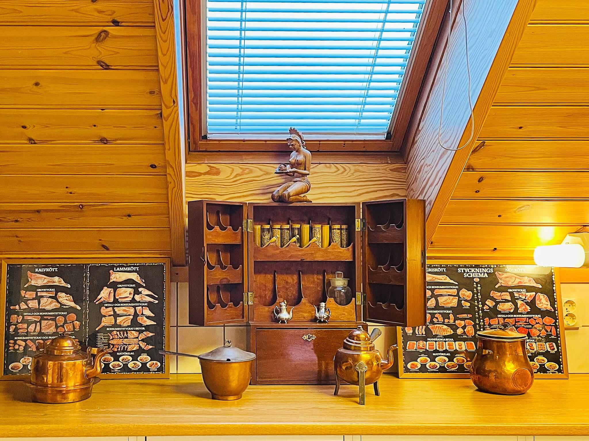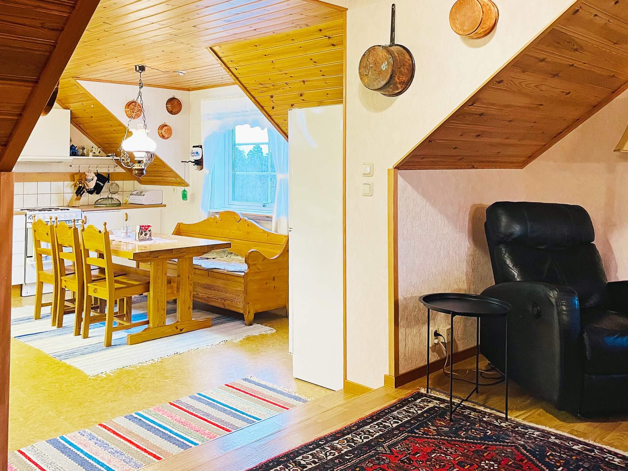 Till vänster av trappen är husets andra sovrum. Sovrummet är stort och har en dubbelsäng på 180 cm med utsikt över hagen och du kan skymta sjön. Intill ligger husets andra badrum med både duschkabin, badkarl, wc och handfat. Det stora vardagsrummet är hemtrevligt och med varm känsla. En kamin finns att tillgå för kyliga kvällar. Här uppe ser du sjön nedanför genom fönstren. Med en liten trappavsats och öppen planlösning kommer man ner till köksdelen. Köket är stort och här fattas inget. Ett välutrustad kök med gott om tillbehör och matplats. De två köksborden kan flyttas ihop om man önskar.