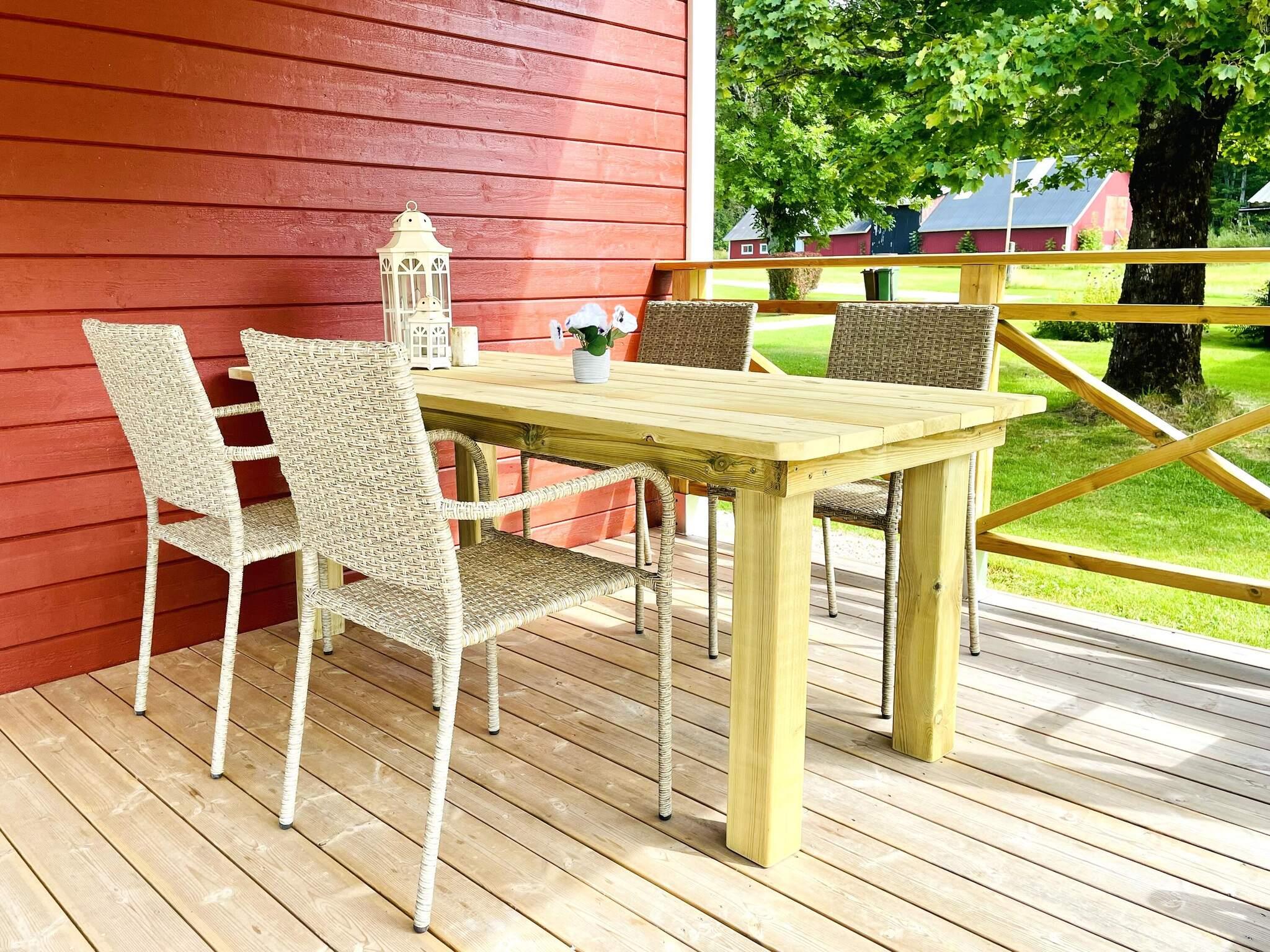 Altanen bjuder på ett matbord, stolar och en kolgrill – den självklara platsen för sommarens middagar och långa kvällar. Här kan du njuta av morgonkaffet medan du blickar ut över ängarna och kanske får du sällskap av rådjur, räv eller till och med skogens konung – älgen! Föredrar du skuggan, finns en mysig terrass under tak på framsidan. På övervåningen väntar två rymliga sovrum. Det ena har en bekväm dubbelsäng (180 cm), det andra har flera bäddar: två enkelsängar (120 cm & 90 cm) samt en bäddsoffa som enkelt blir en dubbelsäng (160 cm). Här finns även ett allrum med soffgrupp och TV, samt ytterligare ett badrum med WC och tvättställ .