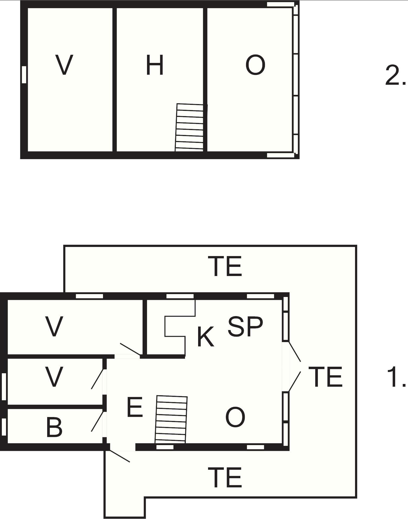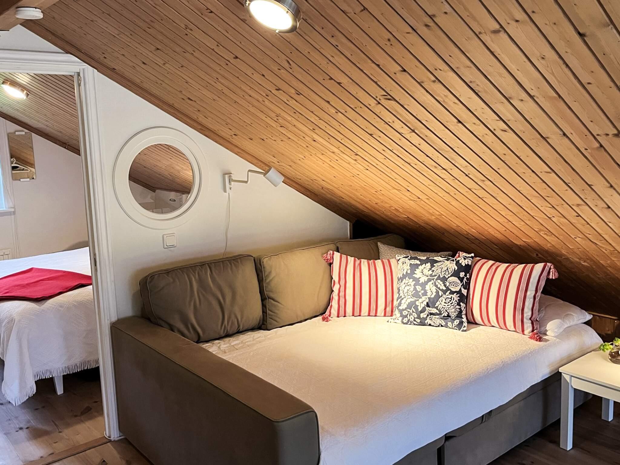 På övervåningen finns ett sovrum med två enkelbäddar samt ett öppet sovrum/sovloft/vardagsrum med en bäddsoffa som bäddas upp till en 140cm bred bädd.