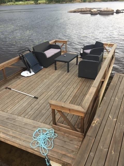 Som prikken over i’et: en møbleret, flydende ponton med motor, som I kan tøffe ud på søen med som en tømmerflåde.