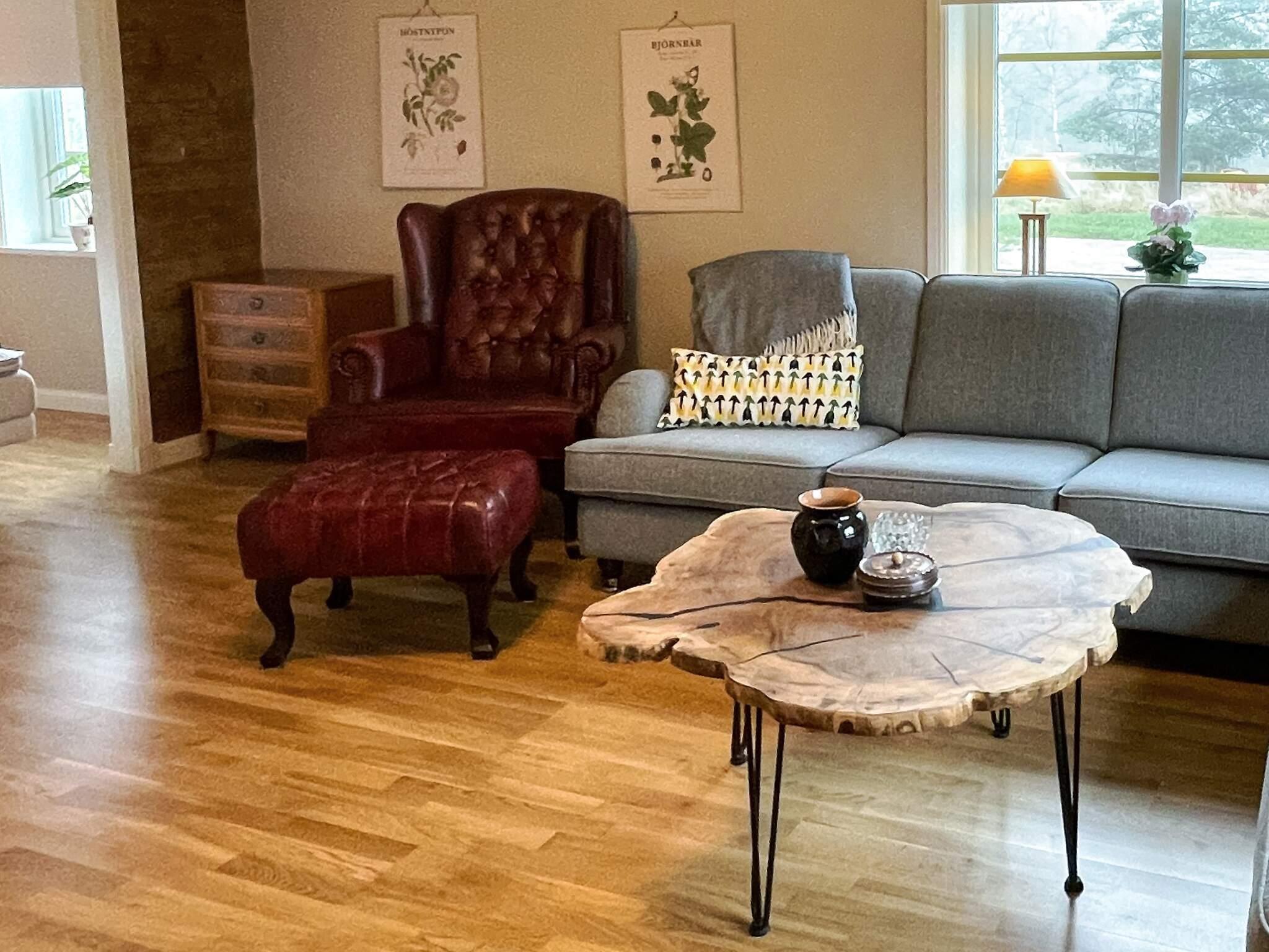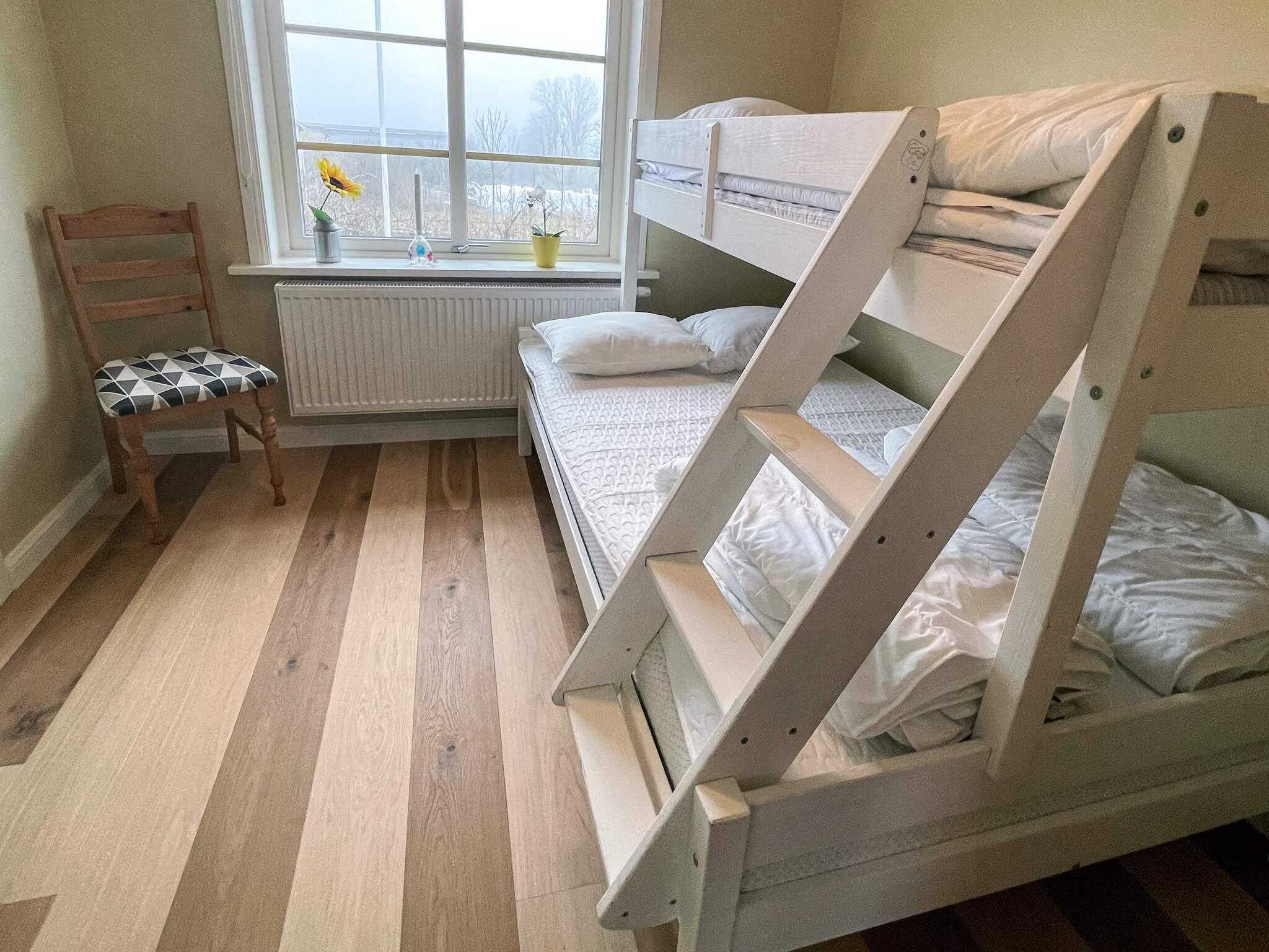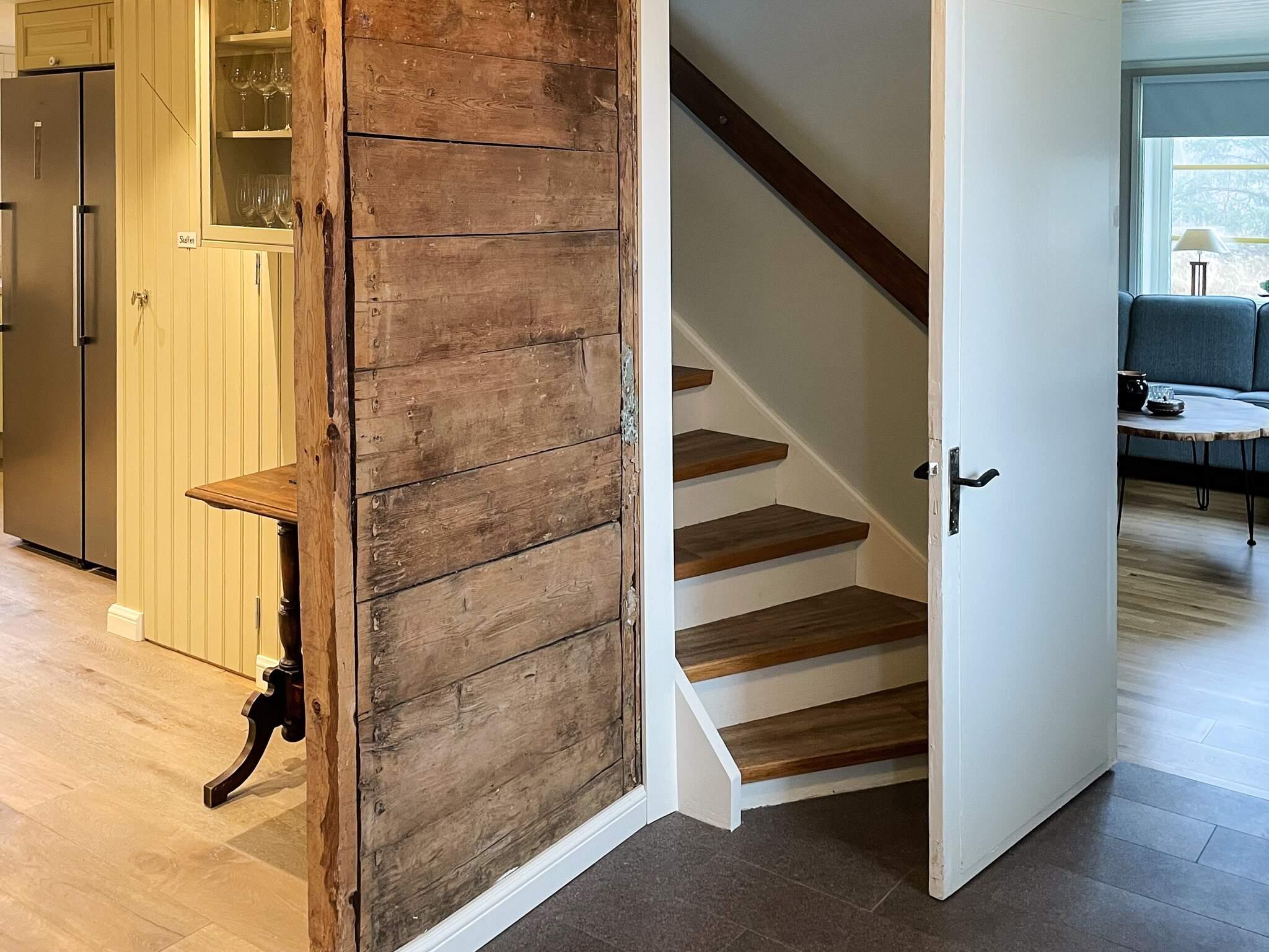 I entrén på husets baksida finns gott om plats för av hängning av ytterkläder och skor. I öppen planlösning ligger det fullutrustade köket i hjärtat av huset. Stora sällskapsytor med matbord som har plats för alla och soffgrupp framför kaminen. På nedervåningen finns också ett sovrum med bubbelsäng, hörnsoffa och TV. Badrummet är väl tilltaget och har både dusch och tvättmaskin. Trappan från hallen leder upp till övervåningens hall som har sittmöjligheter och vacker utsikt över skog och åkrar. Härifrån ingång till samtliga sovrum. De två största rummen har dubbelsäng med elektriska ställbara bäddar och en enkelsäng vardera. Det ena dessutom med spjälsäng för den allra minsta gästen. De andra två sovrummen har en våningssäng vardera med dubbel bädd nederst och enkel överslaf. Därav finns det plats för tre personer även i dessa mysigt inredda sovrum. Ytterligare ett rymligt badrum på övervåningen har dusch utöver wc och handfat tillsammans med en bra hyllförvaring för dina hygienartiklar.
