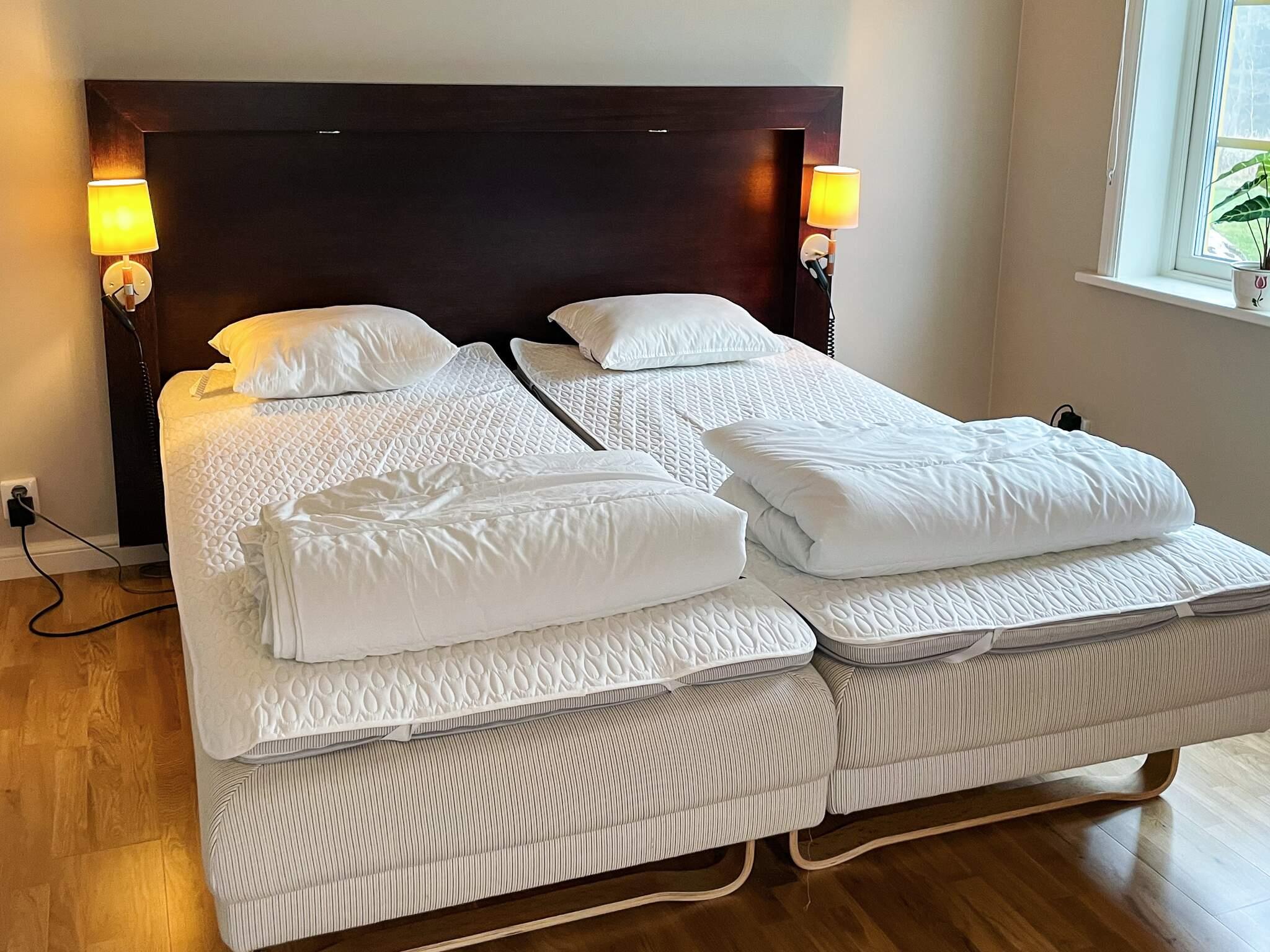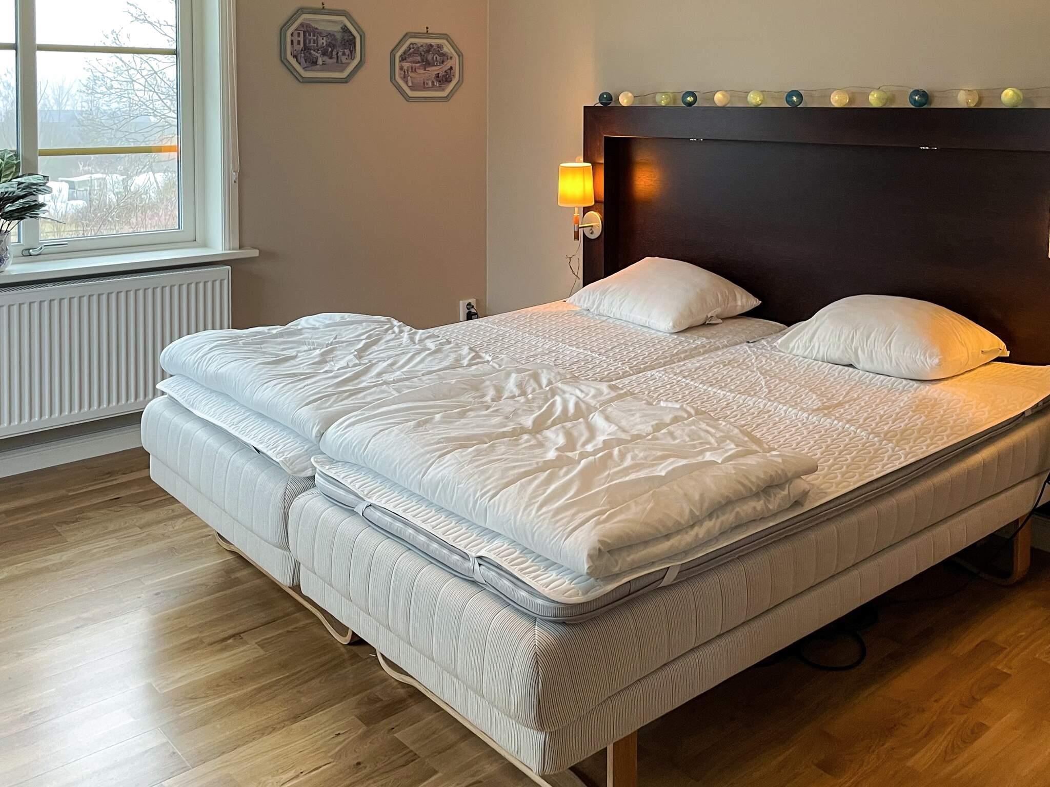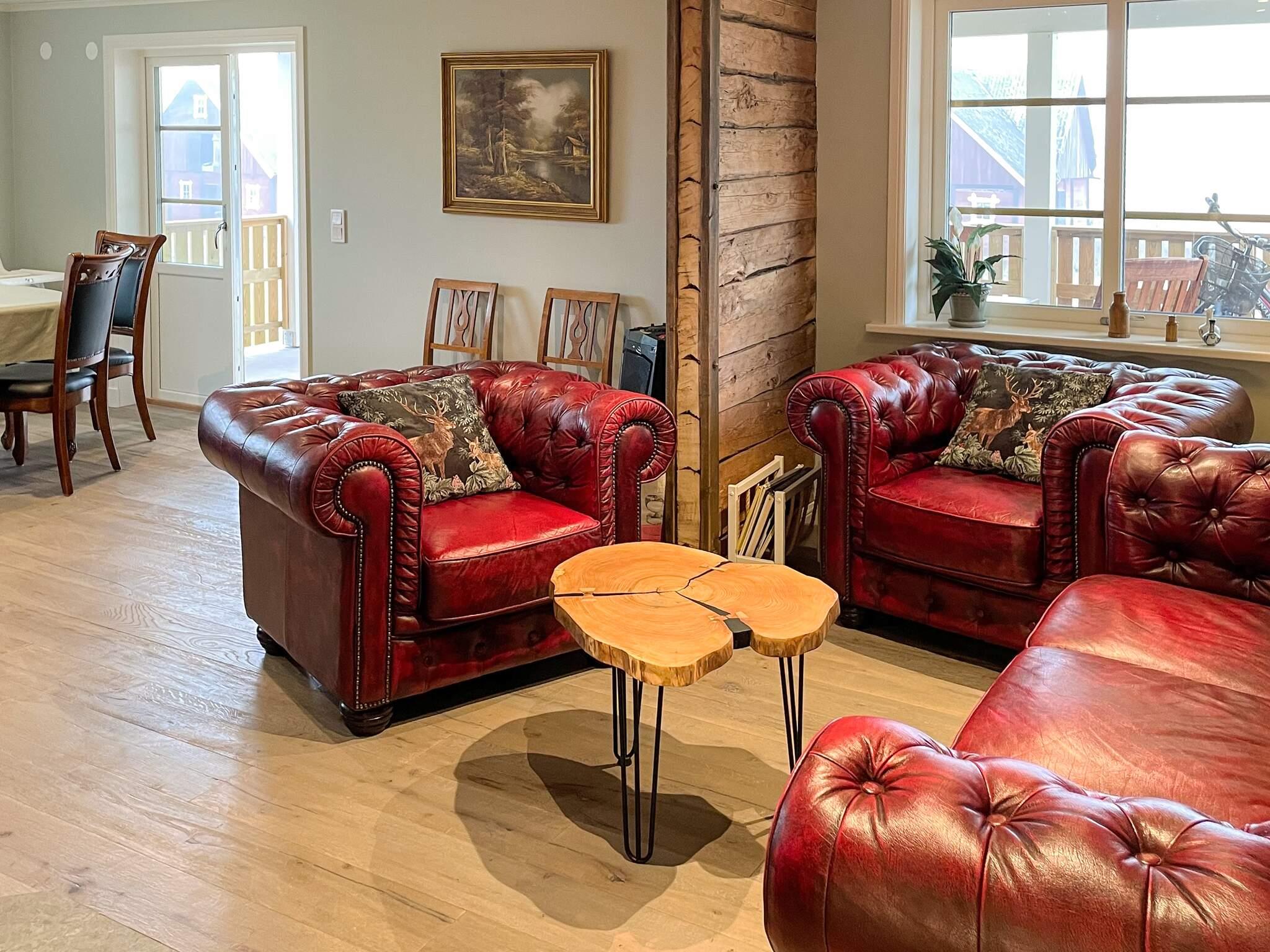 I entrén på husets baksida finns gott om plats för av hängning av ytterkläder och skor. I öppen planlösning ligger det fullutrustade köket i hjärtat av huset. Stora sällskapsytor med matbord som har plats för alla och soffgrupp framför kaminen. På nedervåningen finns också ett sovrum med bubbelsäng, hörnsoffa och TV. Badrummet är väl tilltaget och har både dusch och tvättmaskin. Trappan från hallen leder upp till övervåningens hall som har sittmöjligheter och vacker utsikt över skog och åkrar. Härifrån ingång till samtliga sovrum. De två största rummen har dubbelsäng med elektriska ställbara bäddar och en enkelsäng vardera. Det ena dessutom med spjälsäng för den allra minsta gästen. De andra två sovrummen har en våningssäng vardera med dubbel bädd nederst och enkel överslaf. Därav finns det plats för tre personer även i dessa mysigt inredda sovrum. Ytterligare ett rymligt badrum på övervåningen har dusch utöver wc och handfat tillsammans med en bra hyllförvaring för dina hygienartiklar.