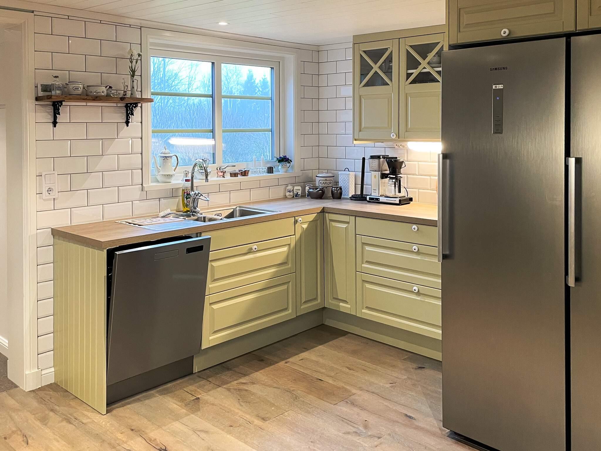 Køkken: el-komfur, køle-frys, mikroovn, kaffemaskine, opvaskemask., vand fra brønd
