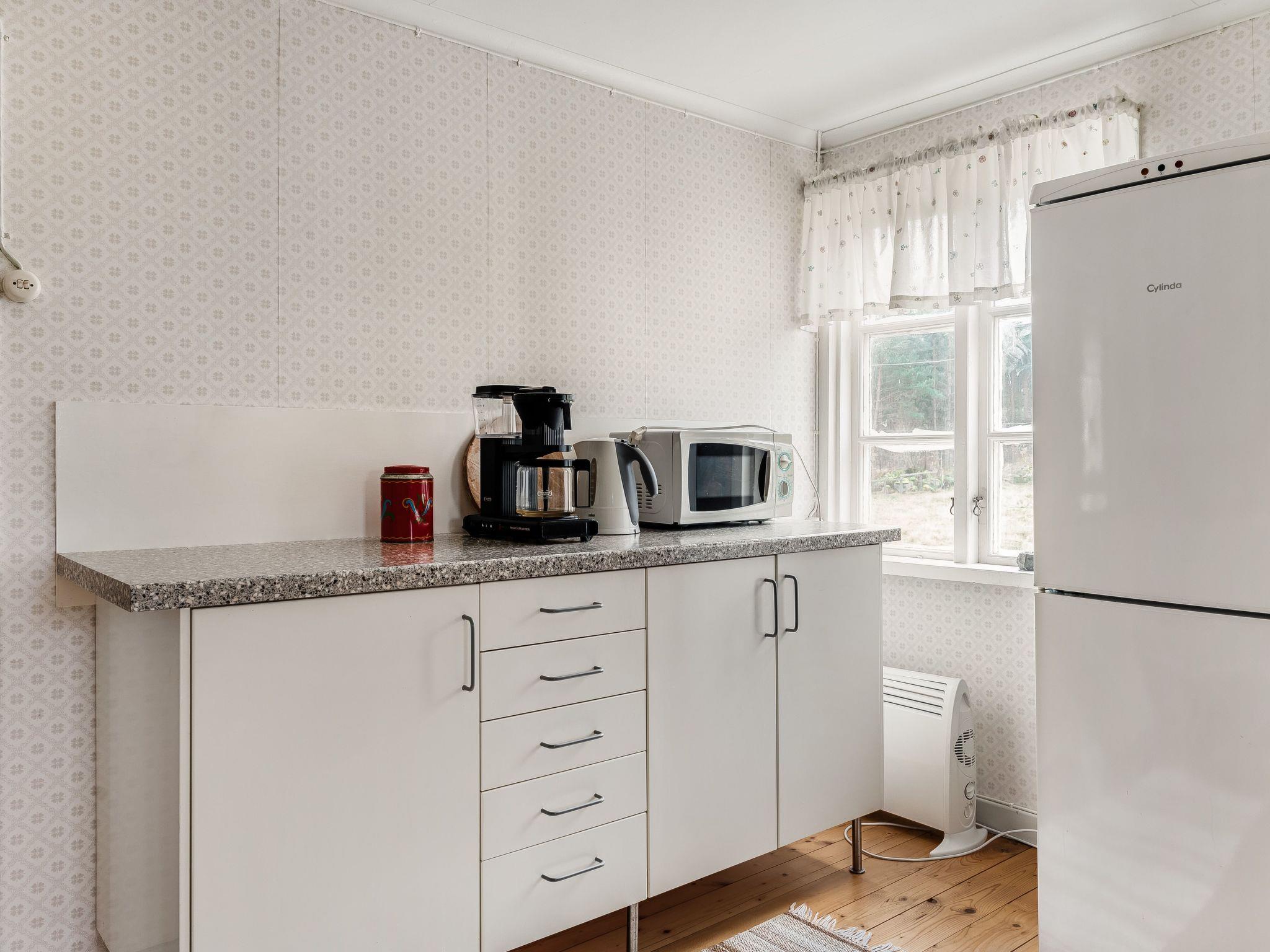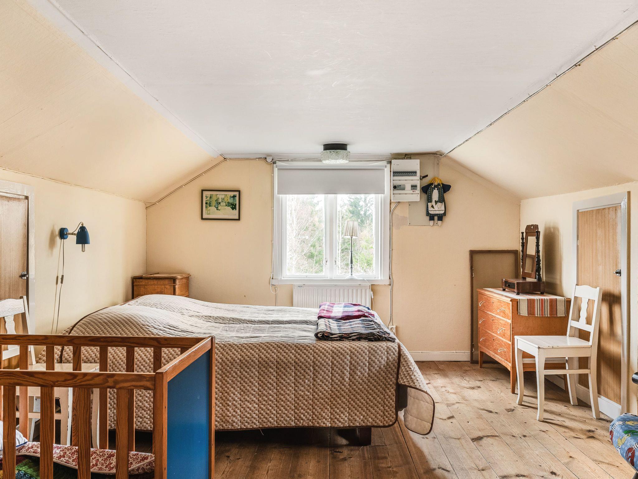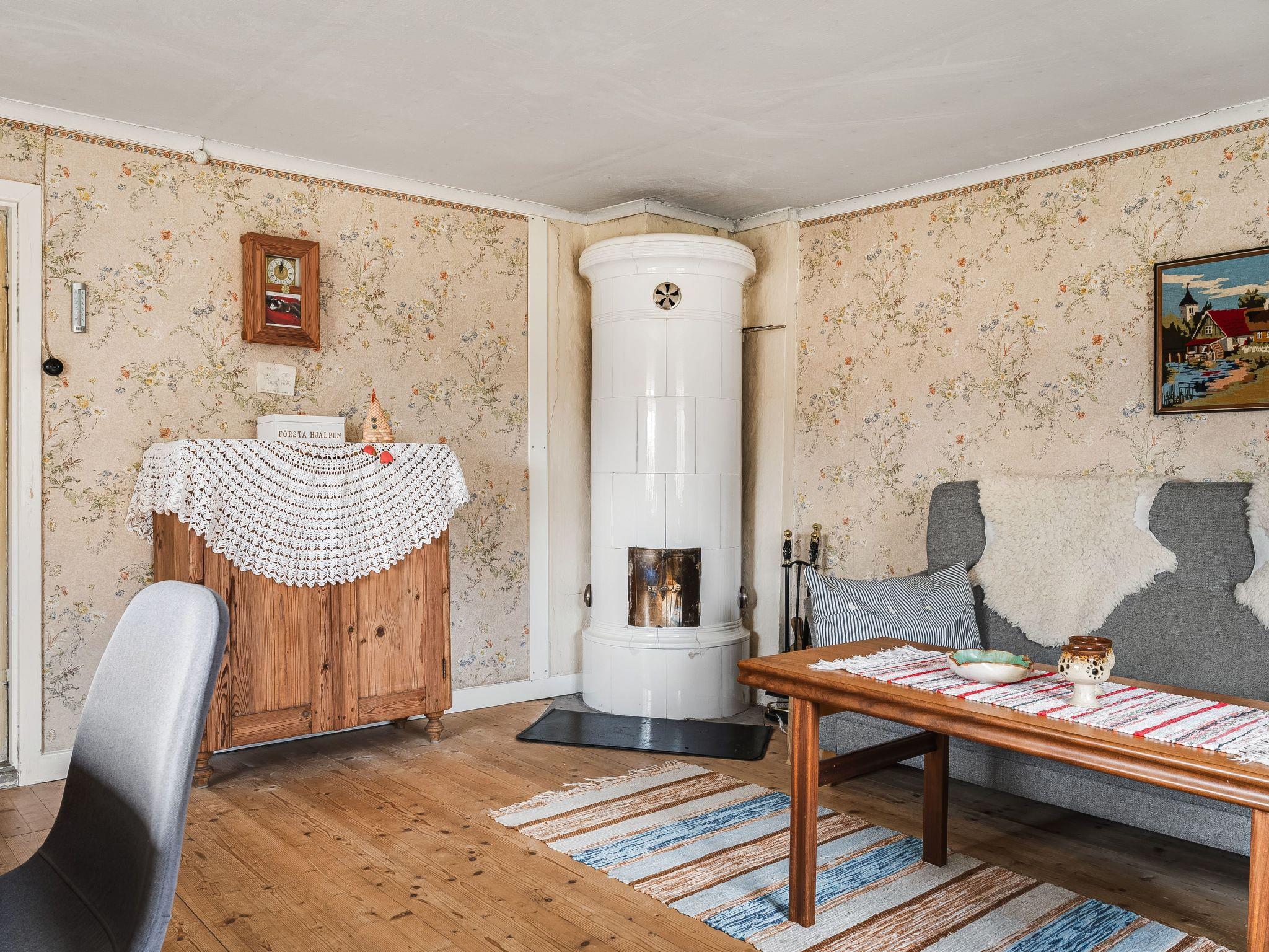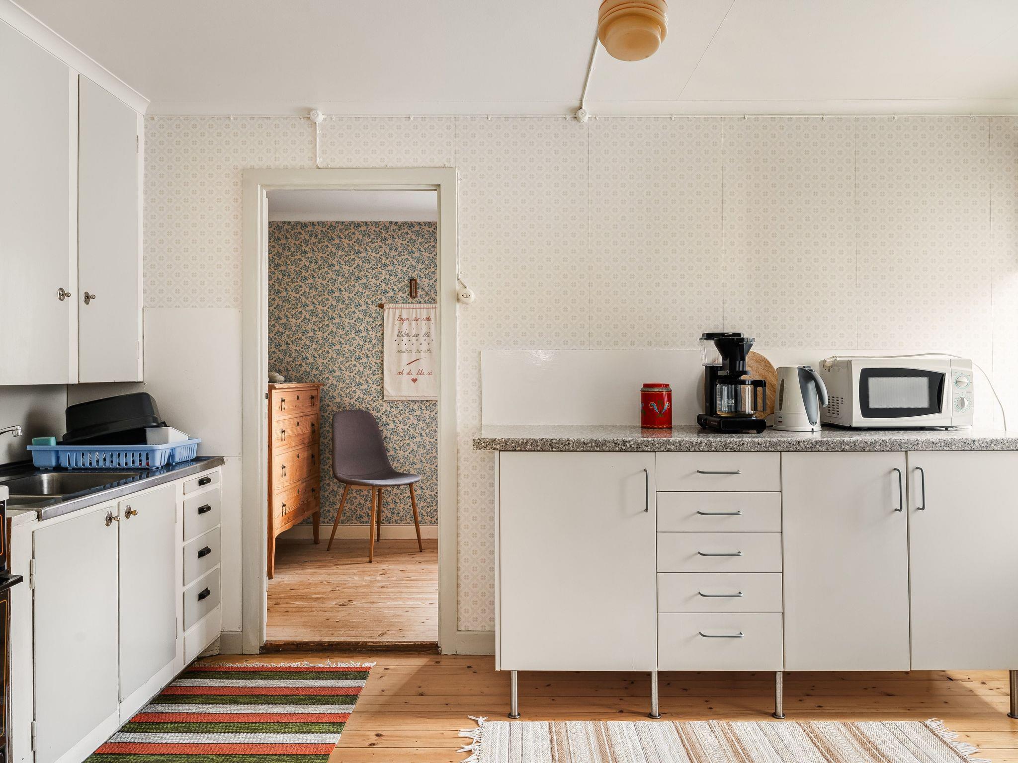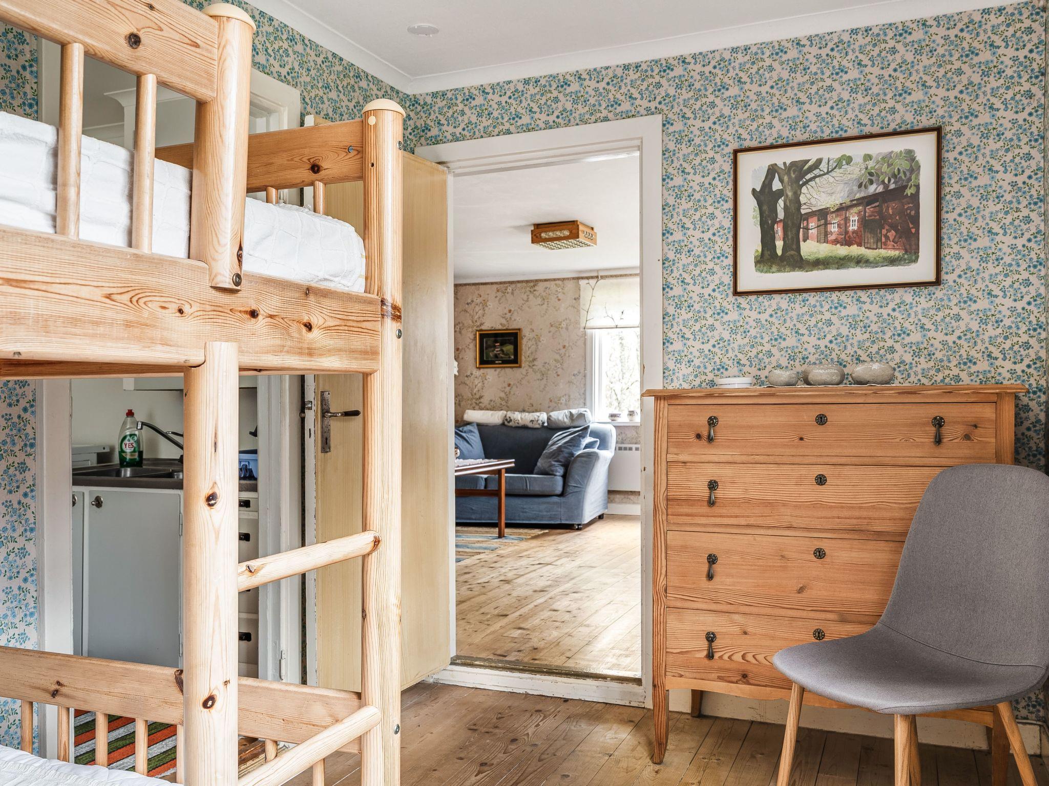 "Mjuamåla", 3-room house 78 m2 on 2 levels. Bright, practical furnishings: living/dining room with dining table, satellite TV, CD-player and tiled stove. 1 open room with 1 x 2 bunk beds (90 cm, length 200 cm). Kitchen (3 hot plates, oven, toaster, kettle, microwave, freezer, electric coffee machine) with Scandinavian wood stove (only for decoration). Shower/WC. Electric heating. Upper floor: 1 room with 1 double bed (2 x 90 cm, length 200 cm). Entrance hall with 2 beds (90 cm, length 200 cm). Wooden floors. Terrace furniture, barbecue (portable), sitting area. Facilities: washing machine, children's high chair, baby cot. Please note: non-smoking house. Smoke alarm, fire extinguisher. Freezer approx. 60 l.