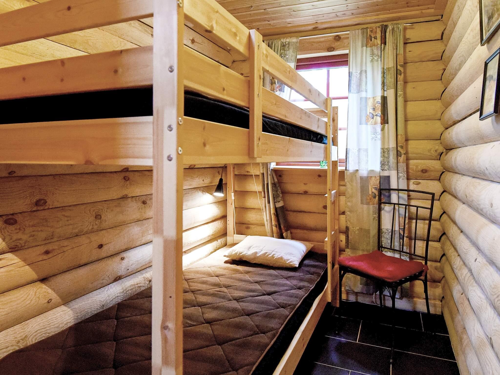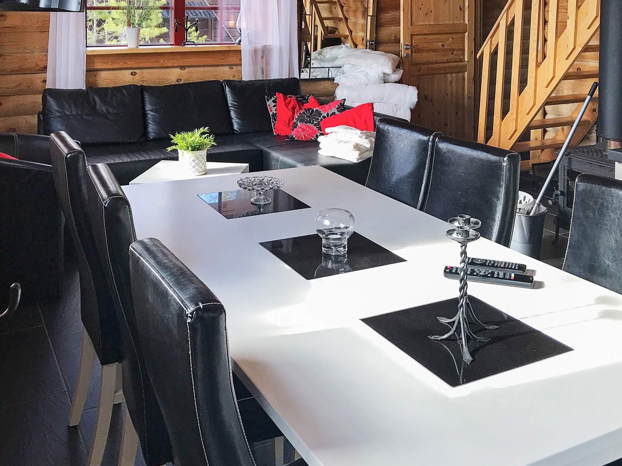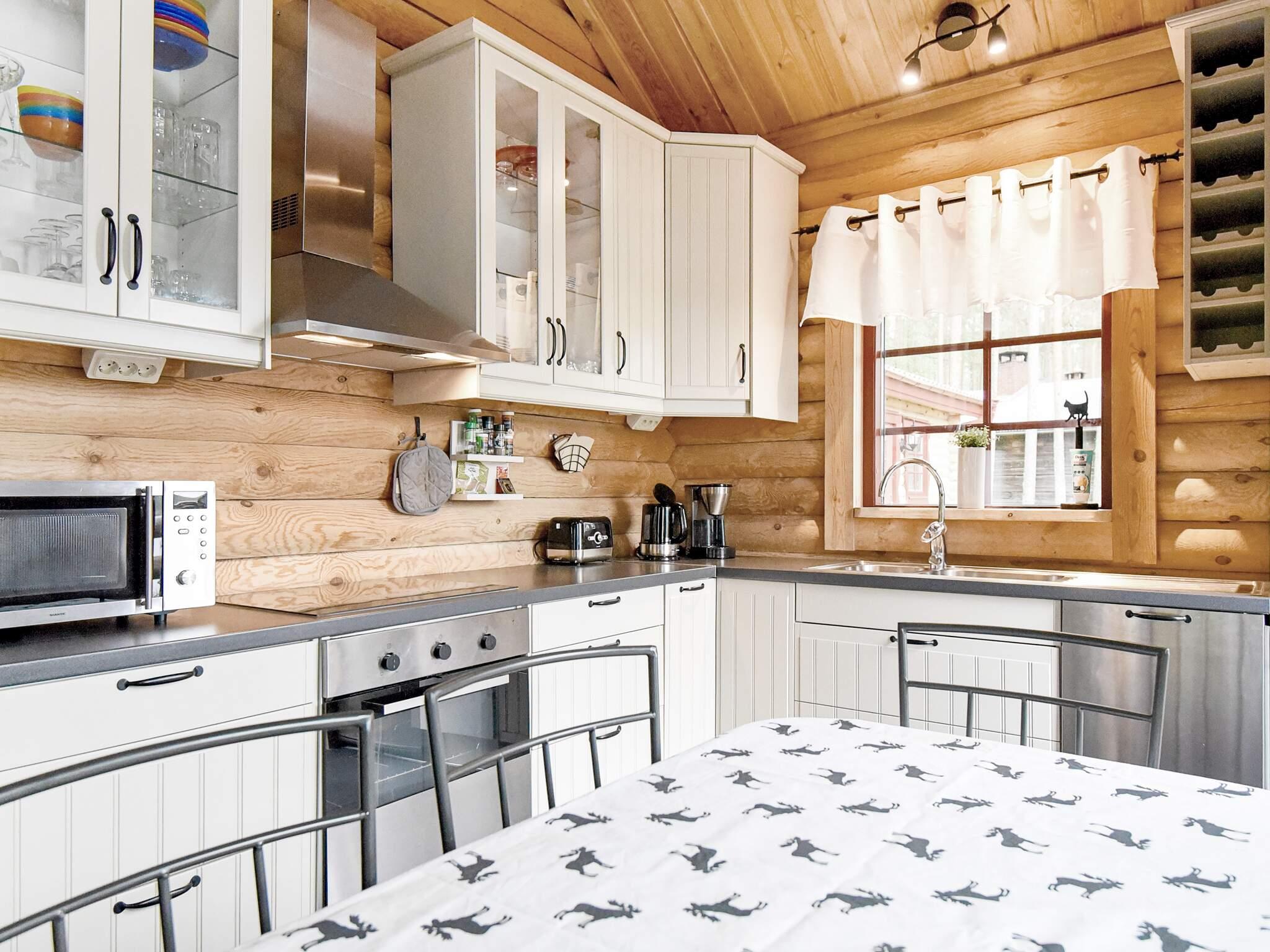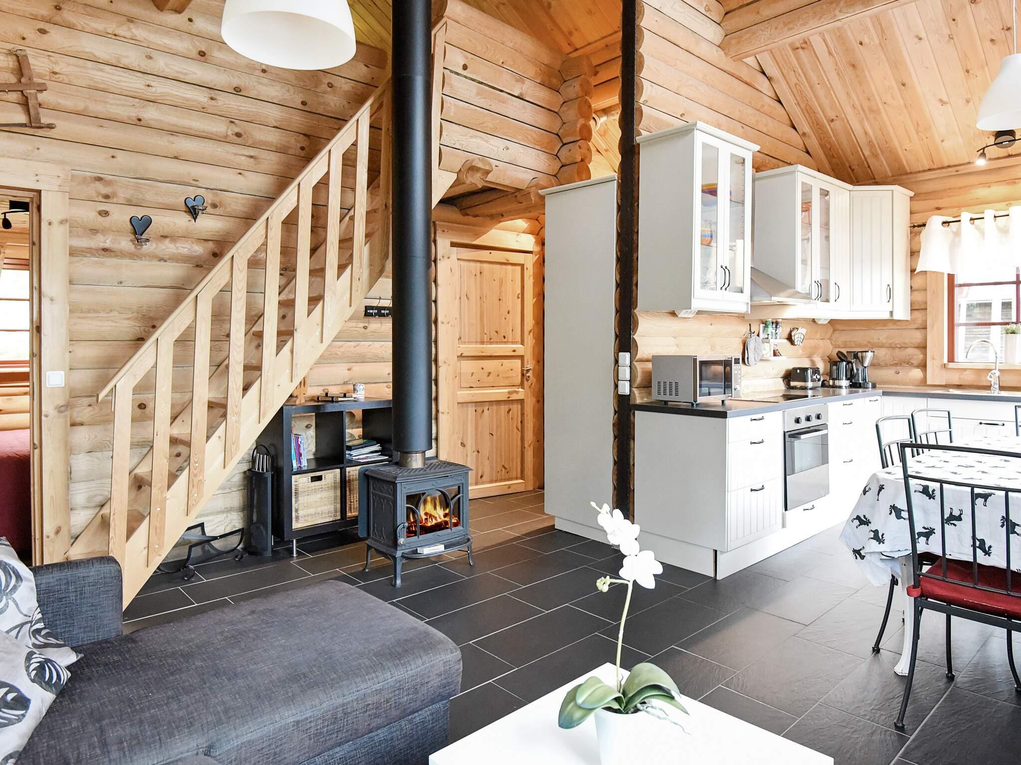 Det är öppen planlösning mellan vardagsrum och kök med tak som når ända upp till nock. Ett modernt kök med spishäll och varmluftsugn. Utgång finns direkt från köket till altanen med fin sjöutsikt. Där kan ni med fördel sitta och njuta av atmosfären. Inne i stugan finns värmande braskamin för kyligare kvällar. TV med ett 40-tal svenska och engelskspråkiga kanaler. Det är helkaklat badrum med duschkabin. Uppe på sovloftet finns två ordentliga resårmadrasser så ni ligger skönt även där uppe.