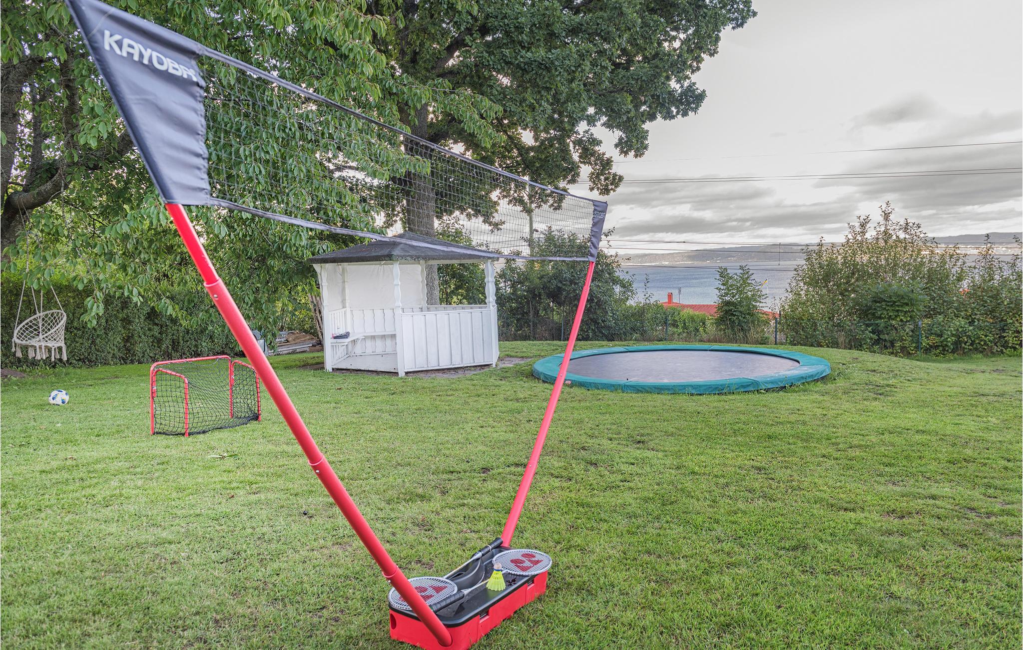 I har en stor grund med trampolin nedgravet i jorden, gynge, fodboldmål, badmintonnet og pavillon. Der er en filmskærm og projektor og også et 65-tommers TV med mange kanaler.