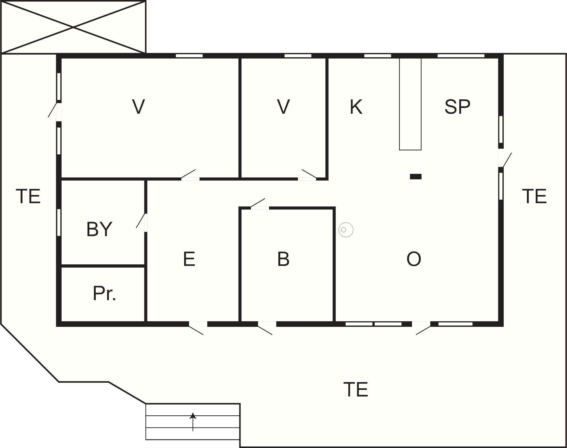Køkkenafd.: Høj stol, el-komfur, køle-frys, mikroovn, emhætte, kaffemaskine, vand fra brønd