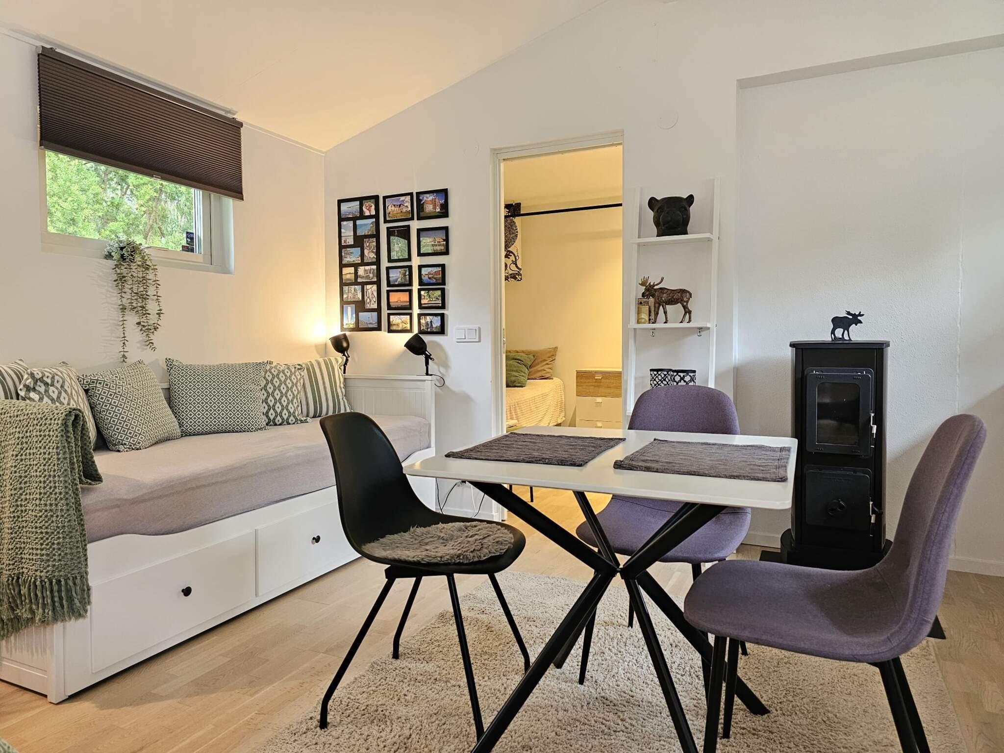 Stugan är modernt renoverad och inredd med 2 bekväma designsängar, en liten matplats och kök med liten braskamin, spis, ugn, micro och kyl/frysfack och plats för ett par barstolar. En bäddsoffa fungerar både dagtid som sittplatser och görs lätt om till två enkelbäddar. I den lilla solvalkoven finns ytterligare en enkelsäng samt den moderna toalett med WC och dusch.