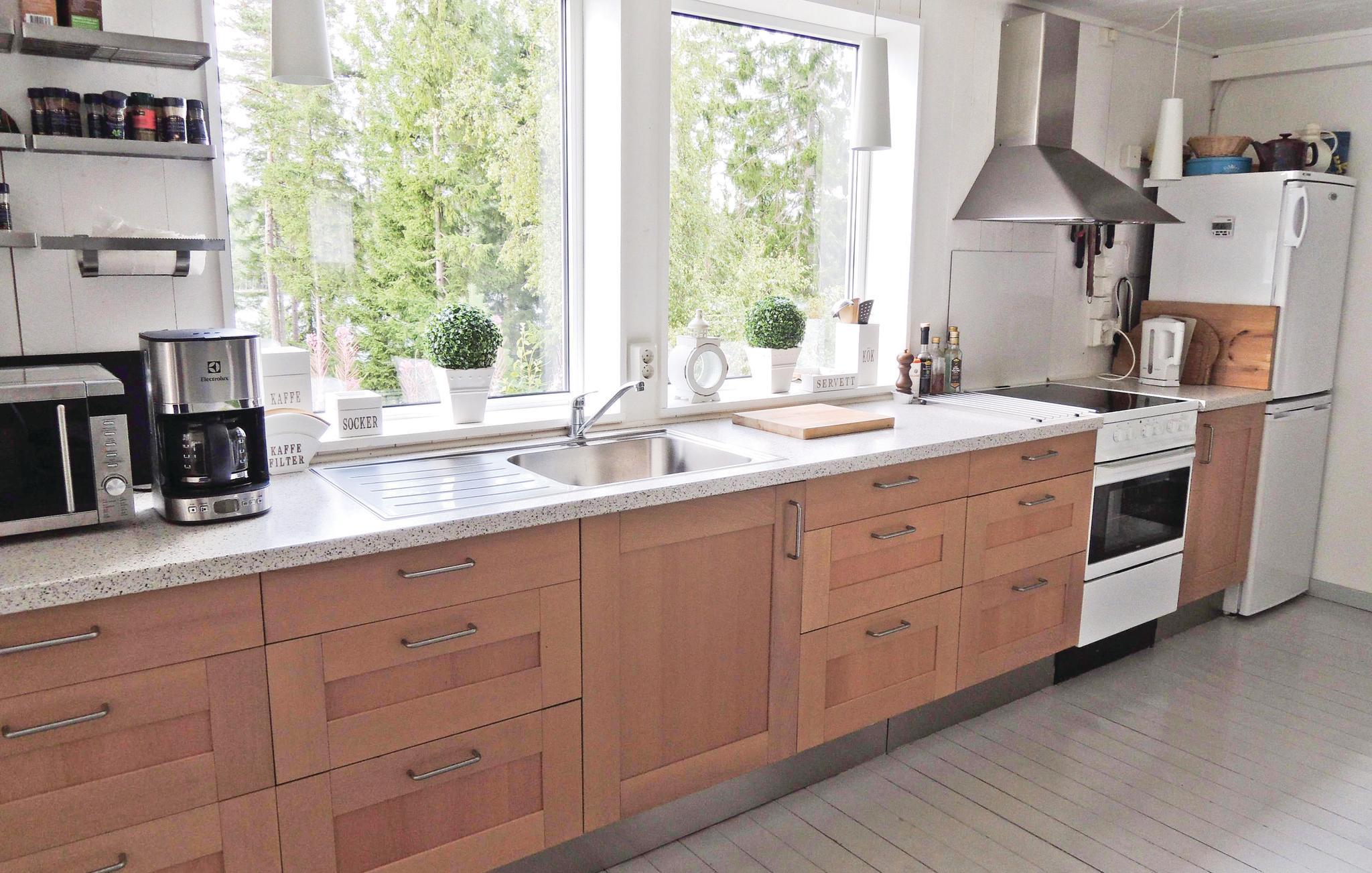 I en rolig og afsides beliggenhed ved Näversjön inviterer dette lyse og hyggelige feriehus jer til at nyde en ferie i naturen med venner eller familie. Store vinduer tilbyder udsigt over søen og skovene. Glæd jer til hyggelig madlavning og hyggelige måltider, snak om svundne tider ved den knitrende pejs eller find sammen om en spændende film i den komfortable sofagruppe.