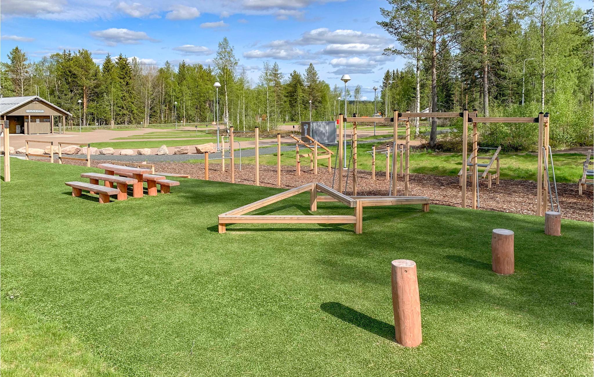 Tag familie og venner med til denne rummelige ferielejlighed i den nederste etage af et stort hus, hvor I kan tilbringe en afslappende, men spændende ferie hele året rundt. Det stilfuldt indrettede spisekøkken inviterer til fælles madlavning og hyggelige måltider, og det bliver hurtigt feriens naturlige mødested. Planlæg jeres ture eller slap af sammen i sofaen. I har en vidunderlig udsigt over floden, og I kan klargøre jeres fiskegrej på en af de tre terrasser. Der er forskellige udendørs lege og gynger til rådighed. På skråningen ud mod floden kan I måske se en bæver arbejde eller svømme i vandet om aftenen. Også hjorte eller elge viser sig sommetider på gården eller på markerne. Om vinteren kan I være heldige at se nordlys. Lad børnene lege på den store legeplads foran huset og nyd lækker grillmad på en af terrasserne.