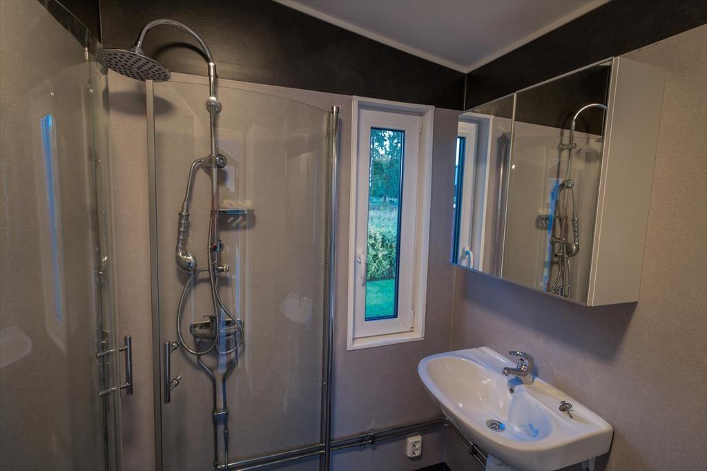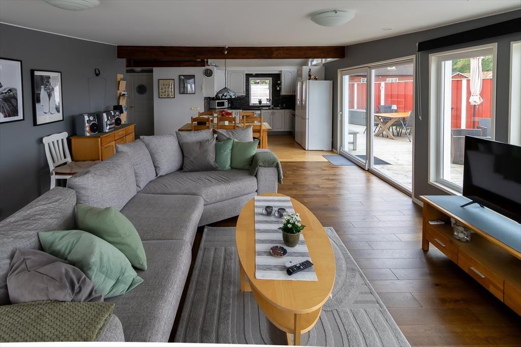 Hovedhuset byder på et dejligt åbent opholds-, spise- og køkkenområde. Køkkenet er fuldt udstyret med 4-plades keramisk kogeplade, opvaskemaskine og køle-/fryseskab. I stuen kan du slappe af på den store sofa samt bruge TV og WiFi. Badeværelset har bruser, toilet og vaskemaskine. Fra opholdsområdet er der adgang til vinterhaven med hjørnesofa. Derudover er der en stor træterrasse med siddepladser, borde og liggestole – perfekt til varme sommerdage. Ved egen badebro ligger et robåd med elmotor klar.