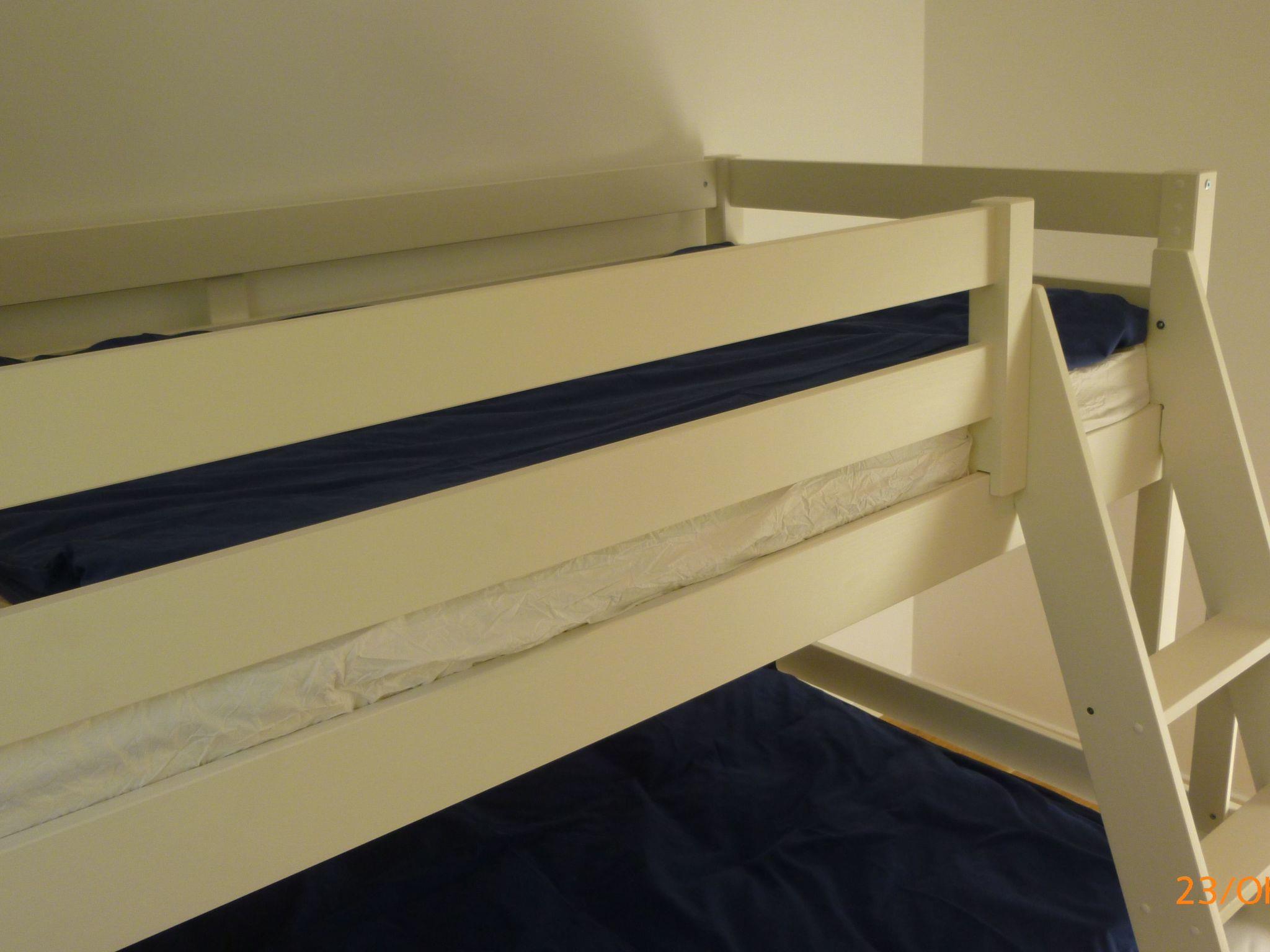 Please bring your own bed linen! Double bed 180x200cm (2 single mattresses) and bunk bed top 90x200cm bottom 140x200cm.