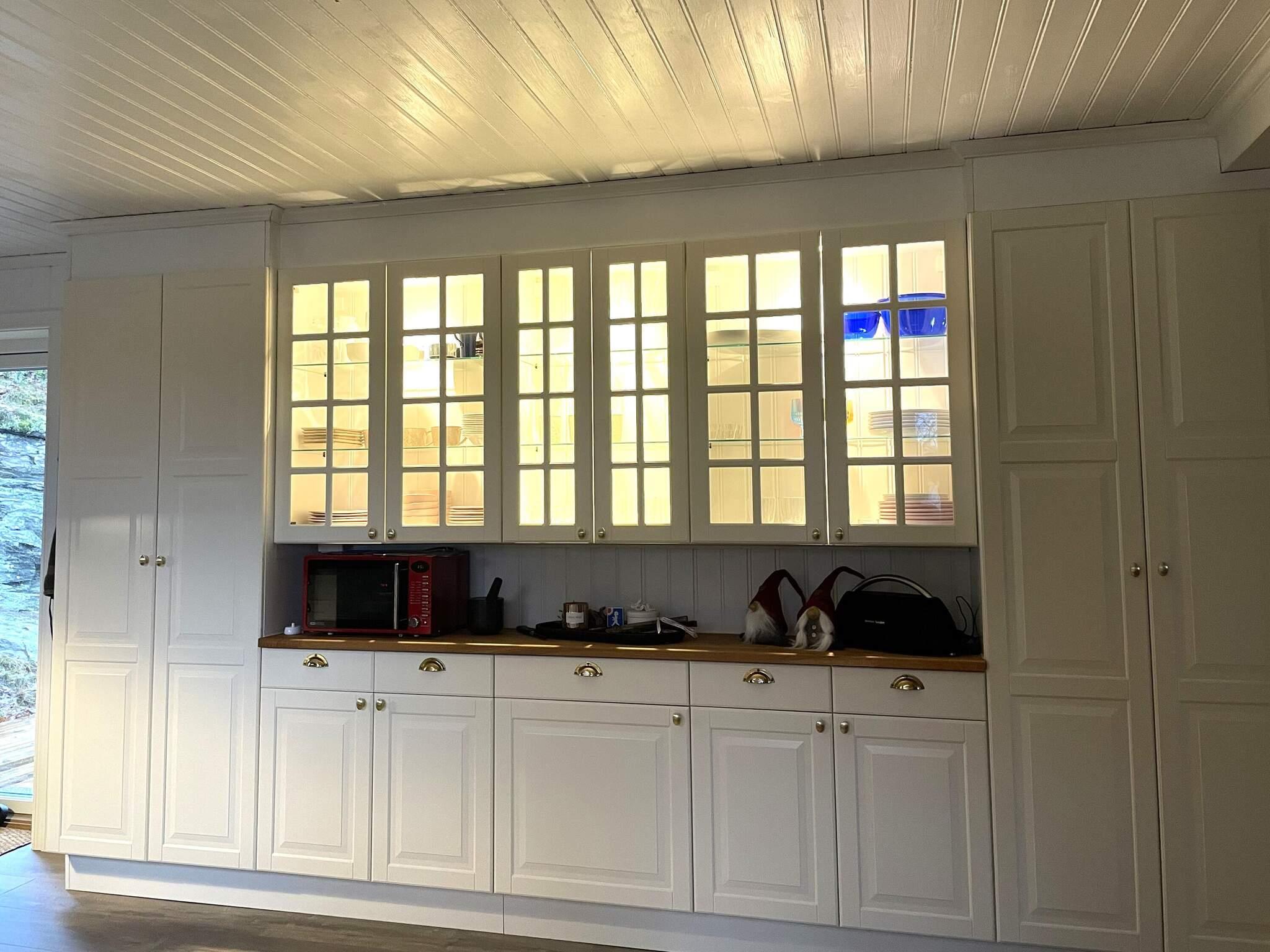 Køkkenafd.: Høj stol, køle-frys, mikroovn, induktionskomfur, emhætte, kaffemaskine, opvaskemask., vand fra brønd