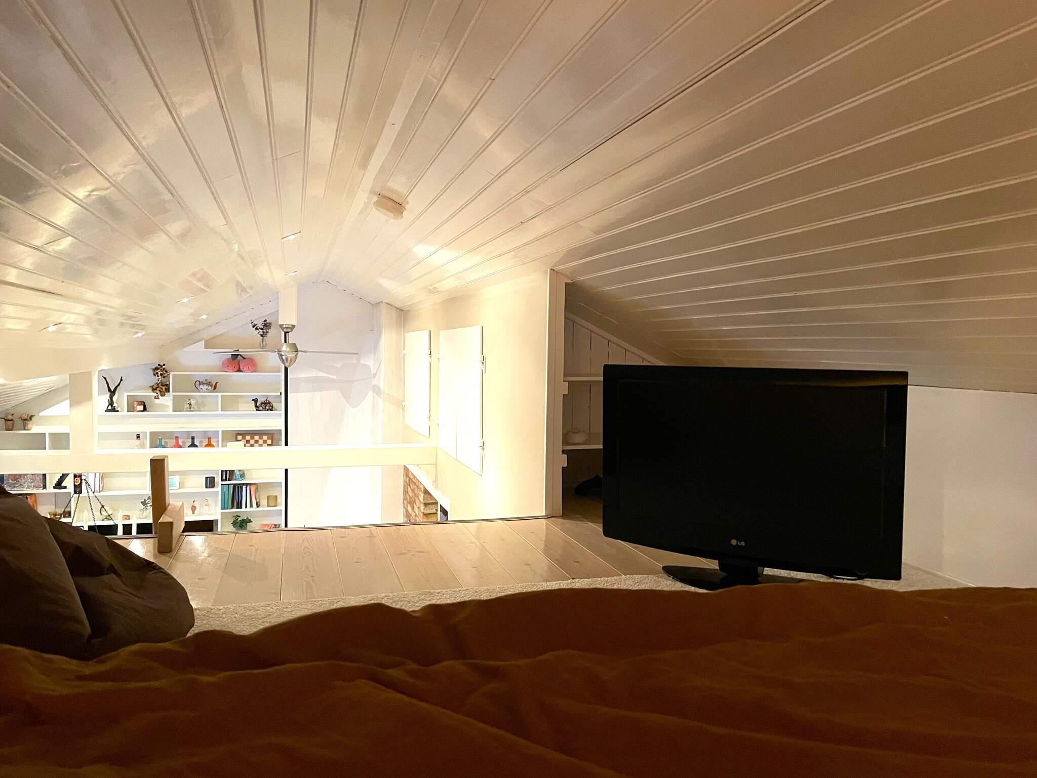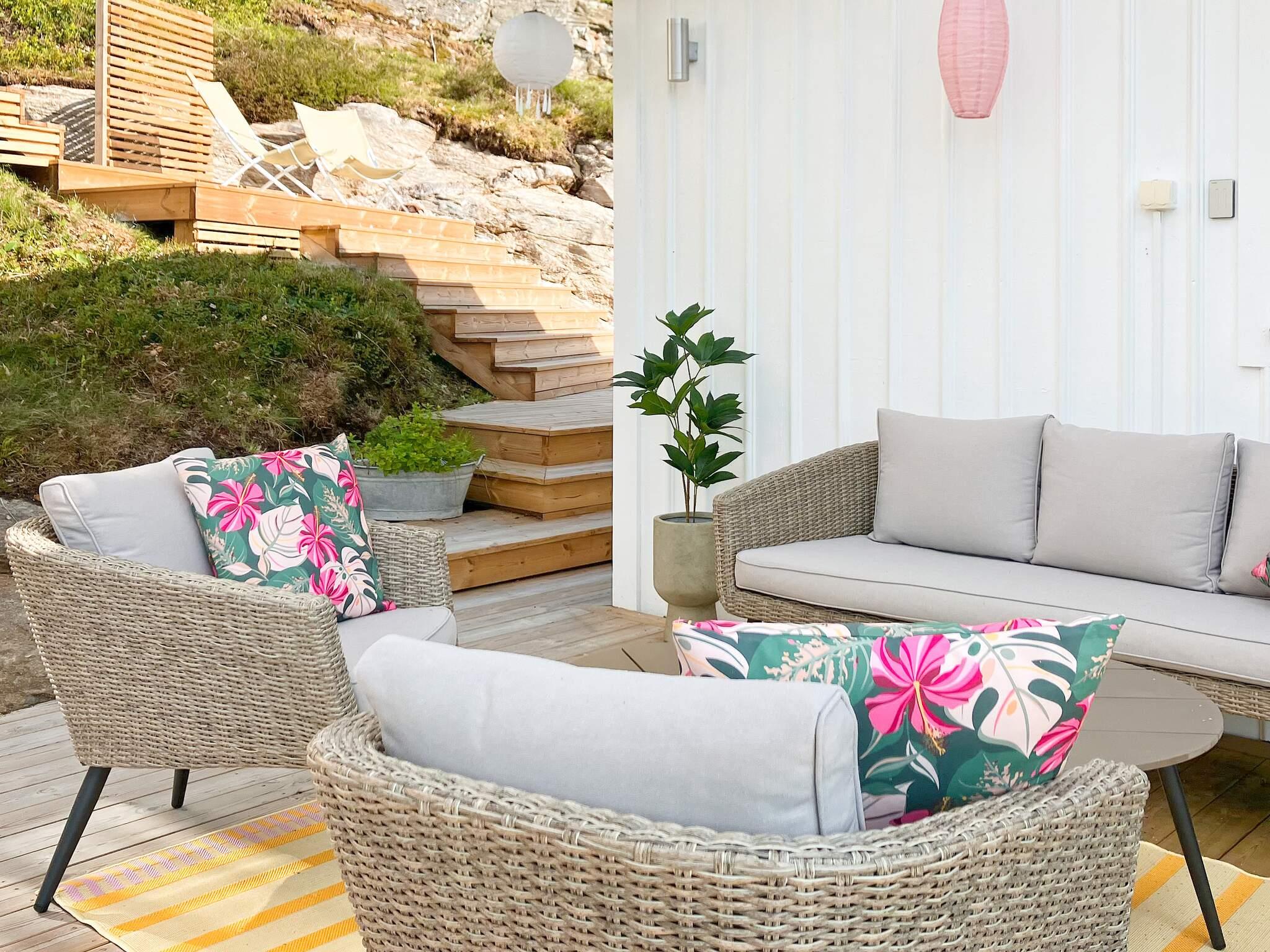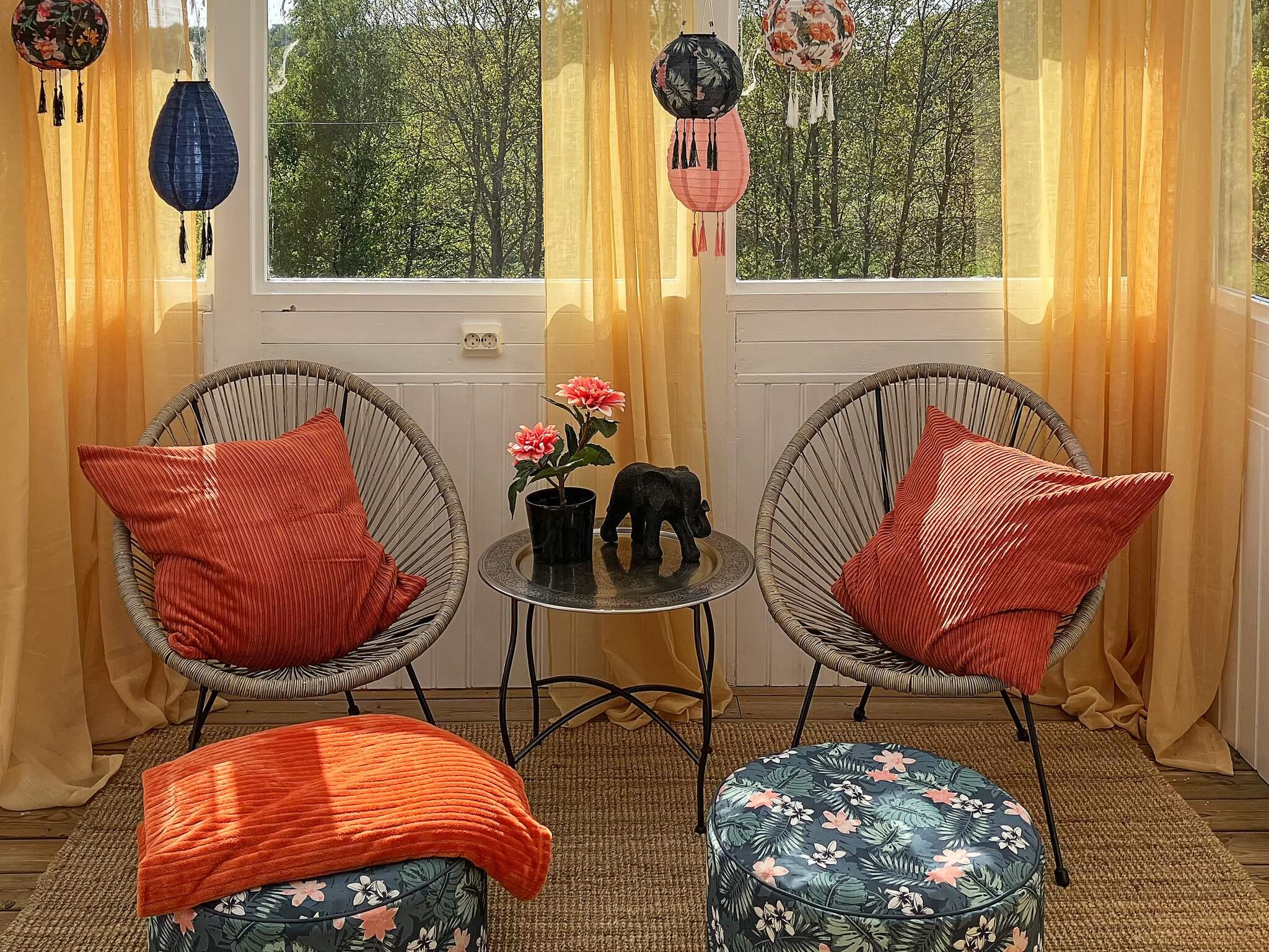 Du välkomnas in i via uterummet med trevlig sittgrupp. Hallen är avlång med utrymme för att hänga av sig. Intill ligger det större sovrummet med en säng på 180 cm. Rakt fram är badrummet som är ljust och modernt. Här finns dusch, wc och även tvättmaskin och torktumlare. Till vänster öppnar det stora härliga vardagsrummet upp sig med skön inredning och öppet upp till nock. Maffig tegelvägg bjuder Er in till köksdelen som är ljus. Här finns också bord med sittplatser för 4-6 personer. Det finns också en liten fin alkov för avlastning/skrivstund/arbetsplats intill det fina köket. Loftet upp når man i brant stege från vardagsrummet. Här uppe är ett skönt kryp-in med en dubbelsäng och tv med chromecast som är tillgängligt. Du kan koppla upp dig till Ert egna konto via Netflix, ej husägarens.