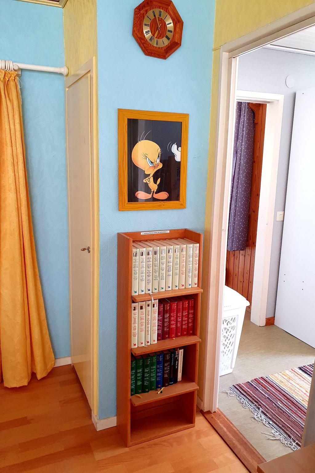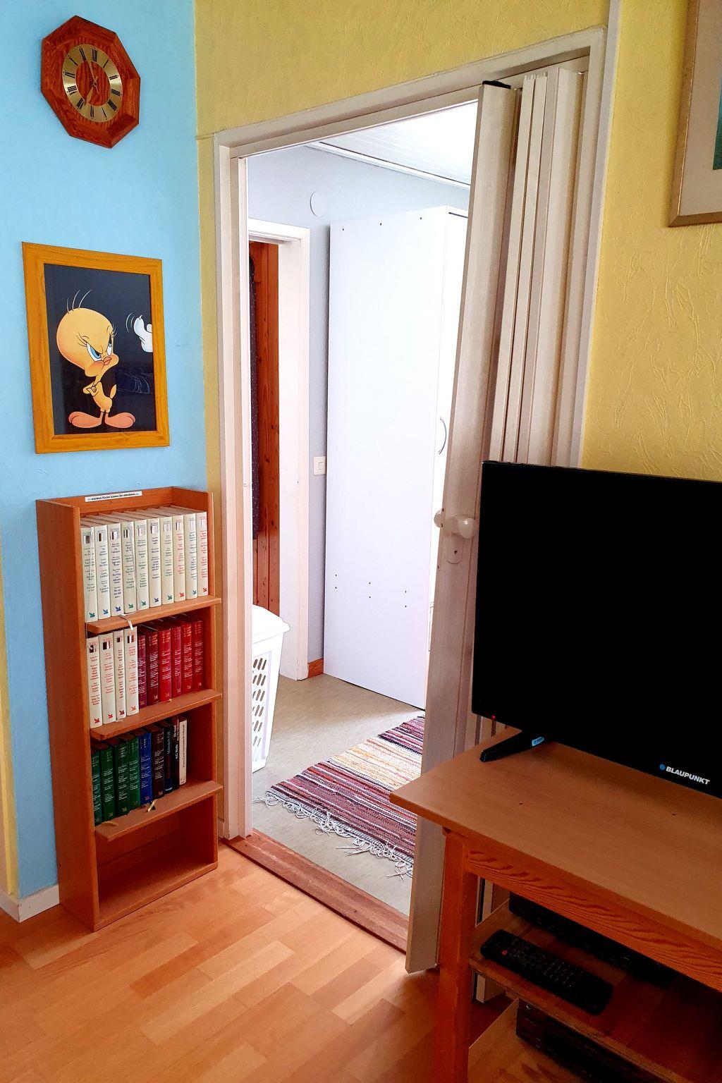 Each room has an electric radiator. The children’s room has a bunk bed (80 x 200cm) and the other bedroom has a double bed (180 x 200cm). The living room has a fireplace and satellite TV. The bathroom provides a WC, shower and washing machine. The kitchen provides everything you need, including a fridge and freezer compartment, toaster, oven, stove, microwave, kettle and coffee machine. There are enough hand and bath towels, so you do not necessarily have to bring your own.