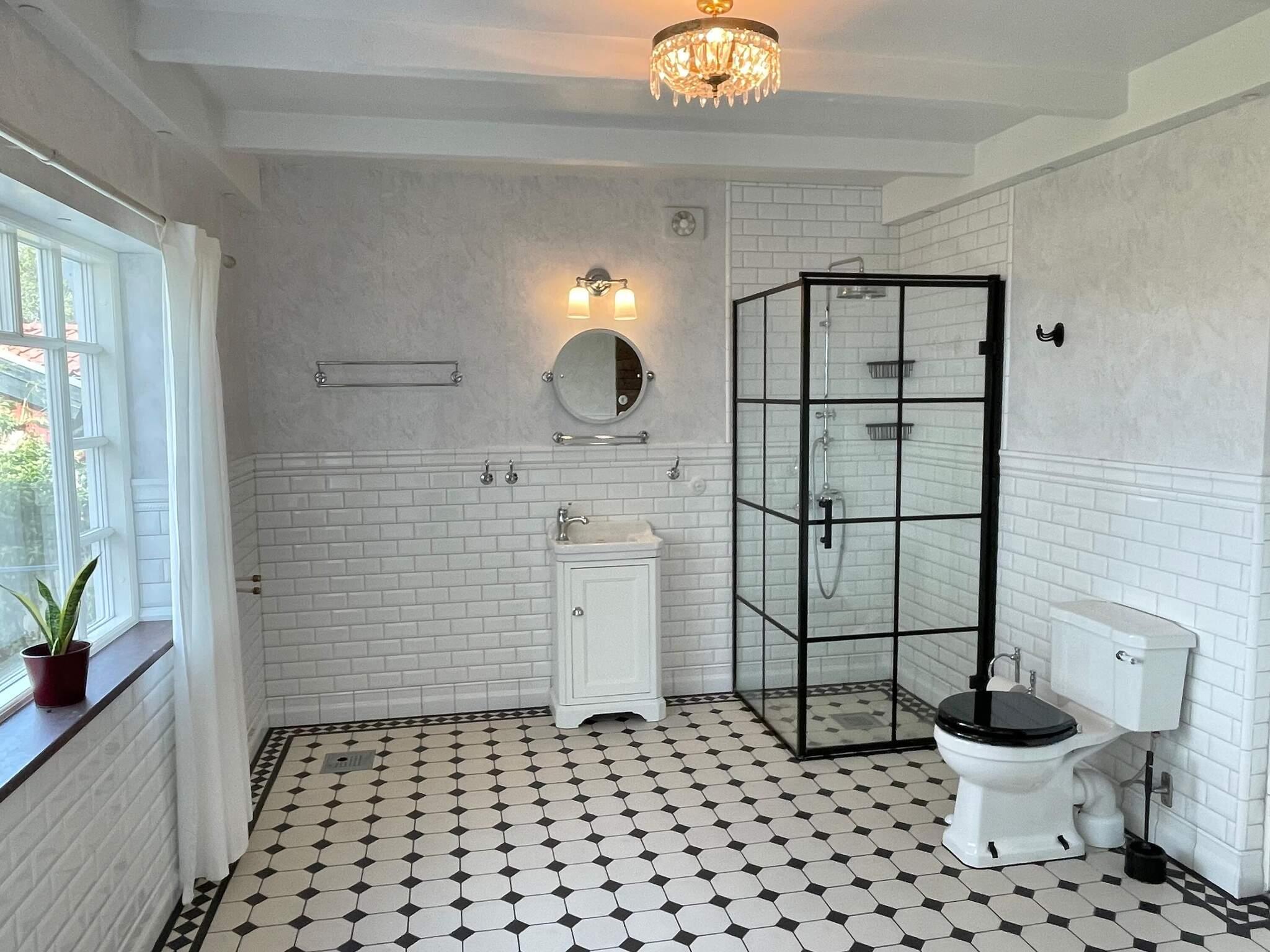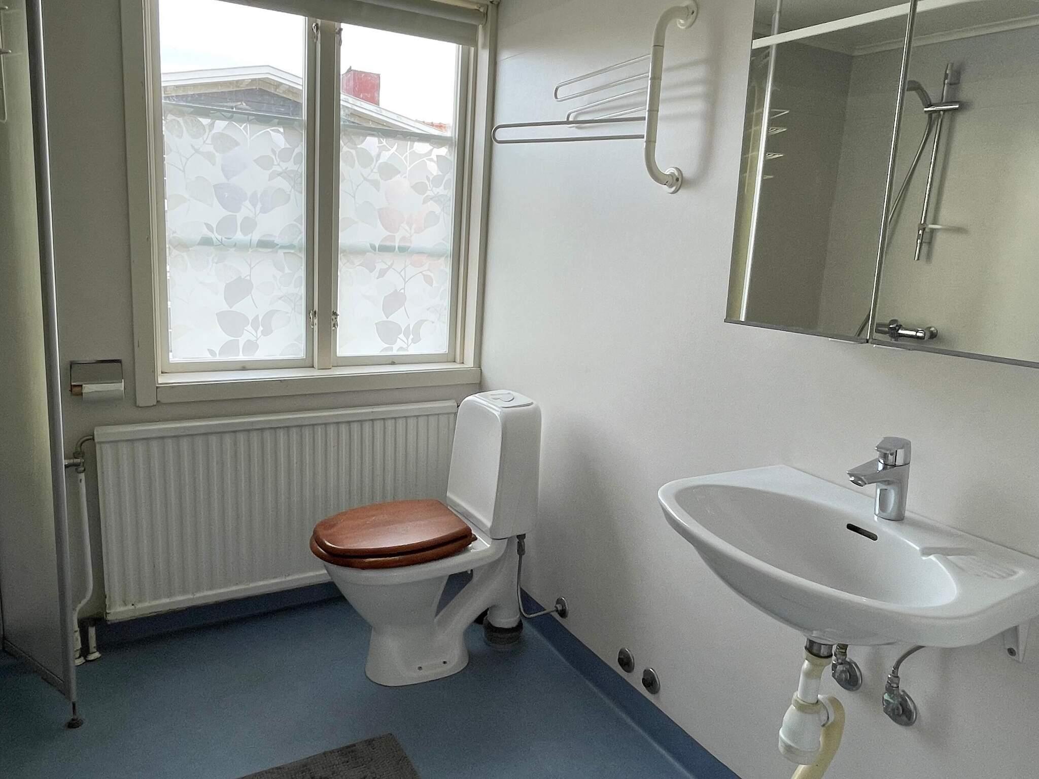 Ni har två badrum. Det stora badrummet på undervåningen är underbart vackert med havsutsikt. Det på övre plan är av lite äldre standard. Det finns wc, handfat och dusch i båda badrummen. Ingång till badrummet på nedre plan är via sovrummet med dubbelsäng.