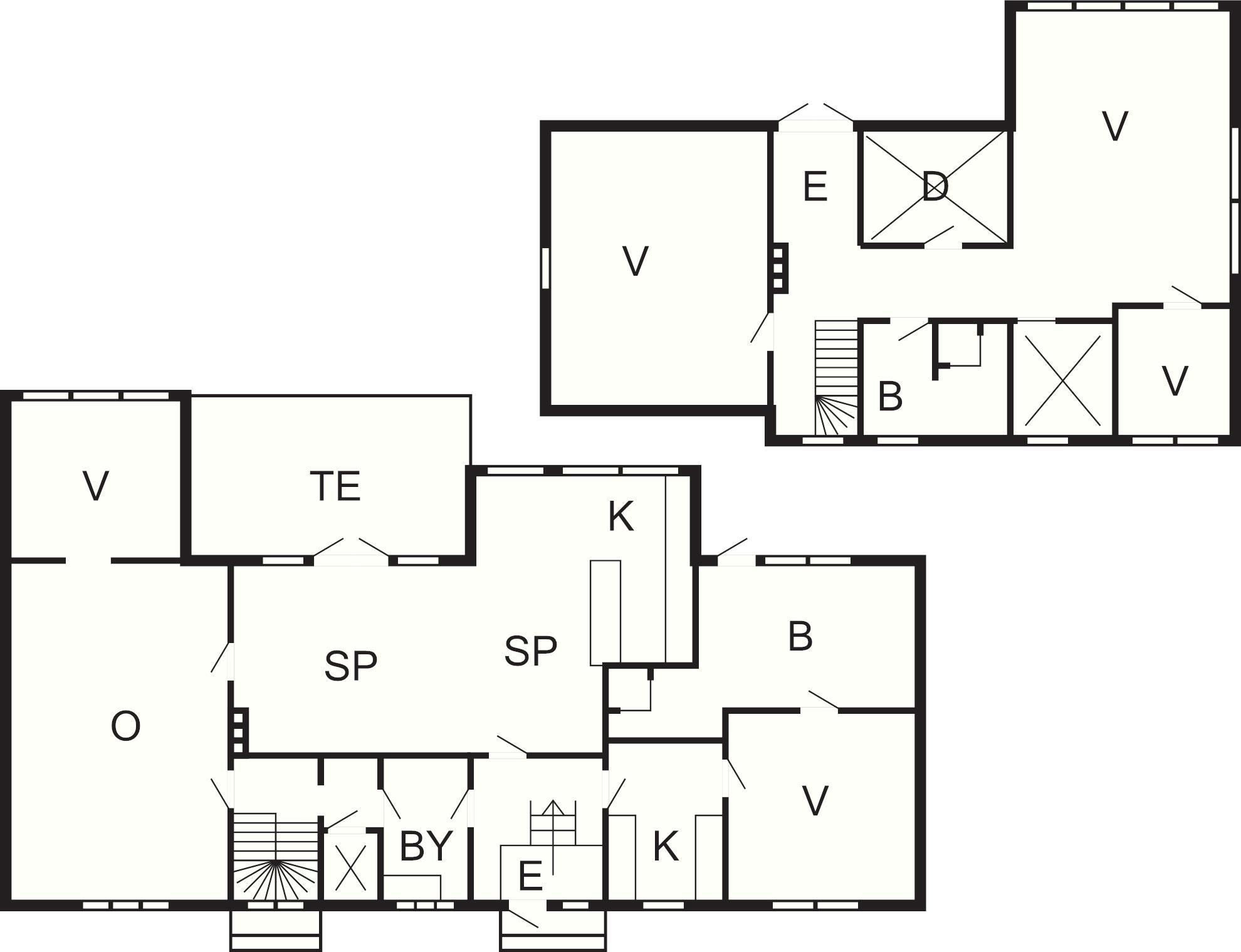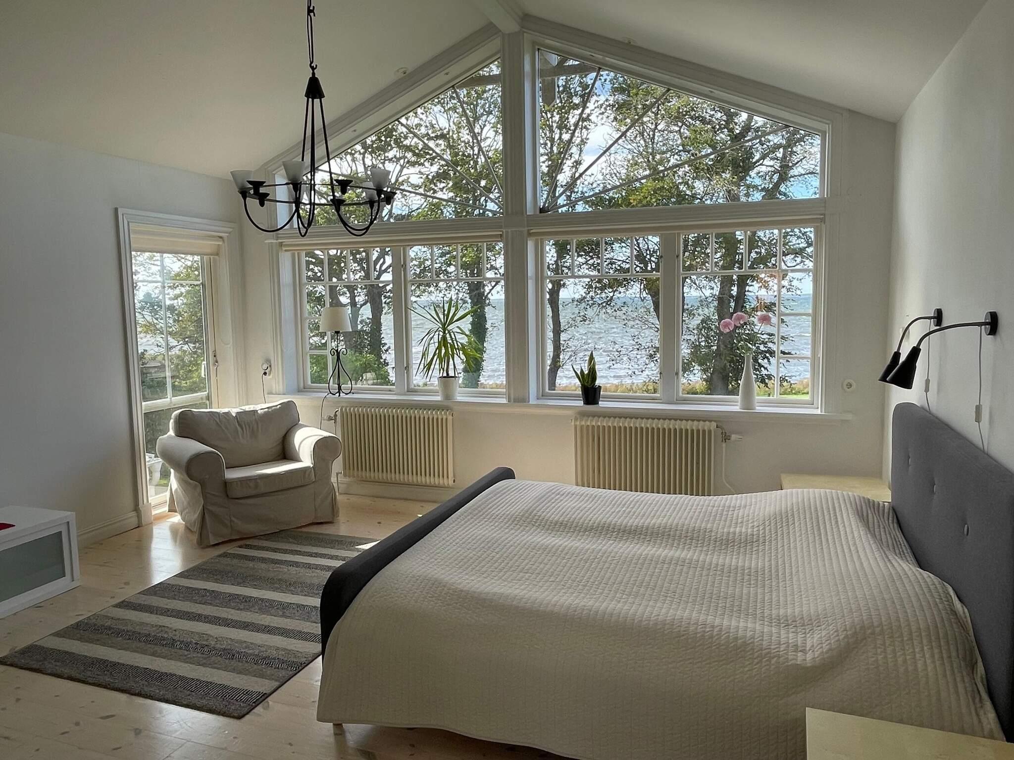 Ni sover i fem sovrum, varav två finns på undervåningen. I det ena sovrummet finns en dubbelsäng. Det andra sovrummet som är utrustat med två enkelsängar har hög takhöjd, bjälkar i taket samt havsutsikt