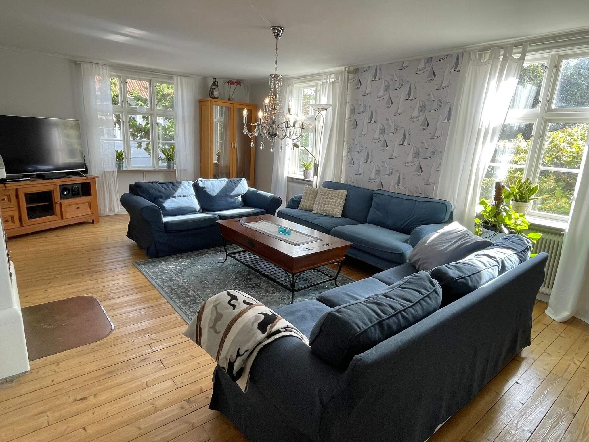 Vardagsrummet är ljust och trevligt med en bekväm soffgrupp framför tv:n.