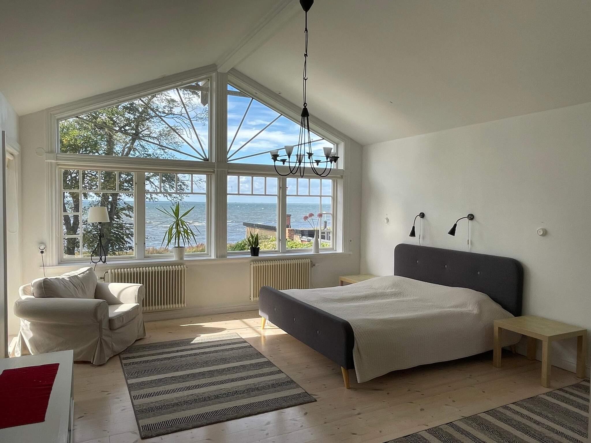 På ovanvåningen finns tre sovrum. I det vackra stora sovrummet med fönsterpartier ut mot havet finns en dubbelsäng. Notera att det inte går att stänga till det sovrummet. Det finns ytterligare ett vackert sovrum med dubbelsäng där taket är öppet upp till taknock. I det tredje sovrummet på övervåningen finns det två enkelbäddar (80cm). För att ta sig till det sovrummet passeras ett av de andra sovrummen.