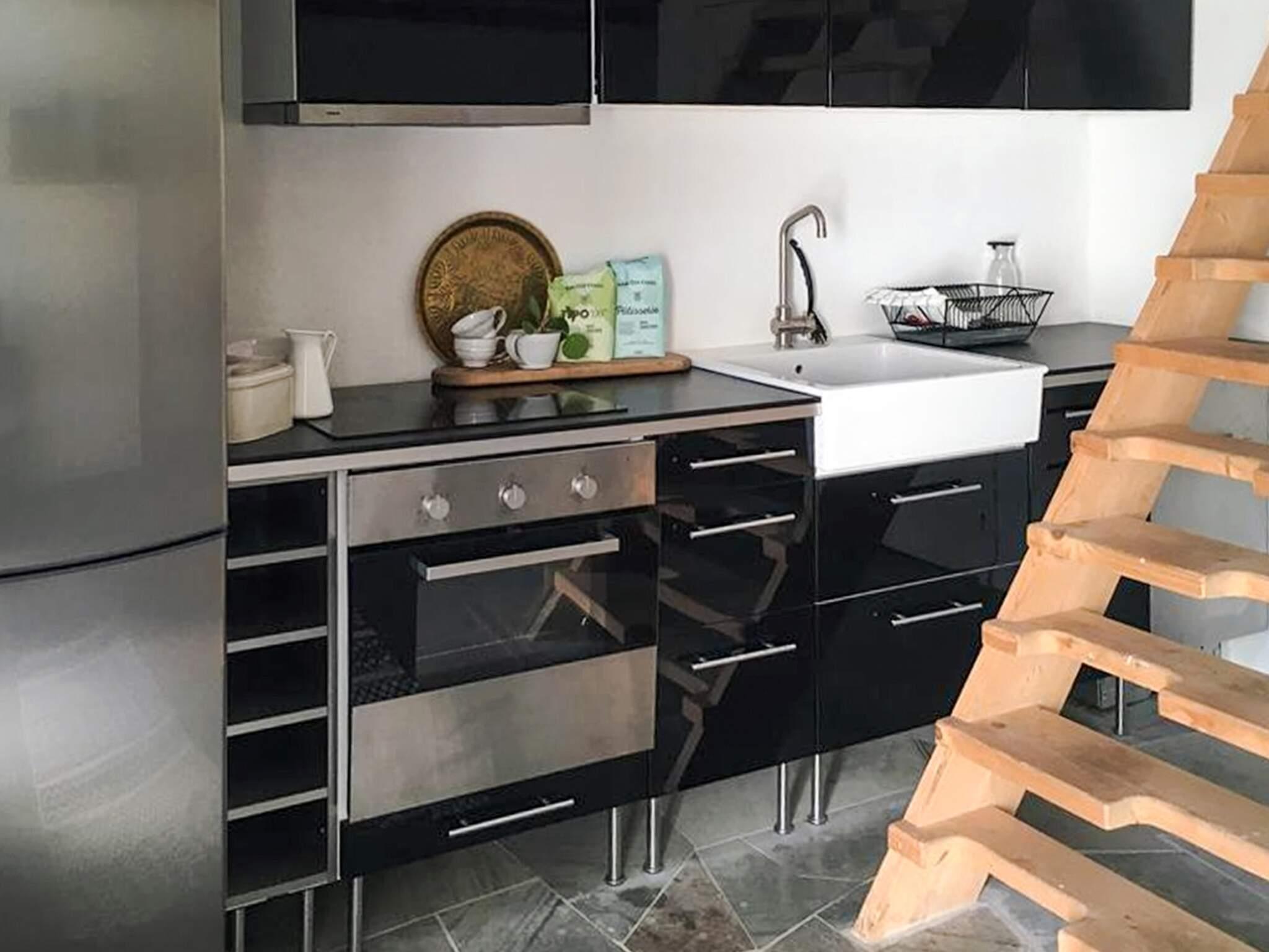 Køkken: El-komfur, køleskab, mikroovn, kaffemaskine, opvaskemask., vand fra brønd