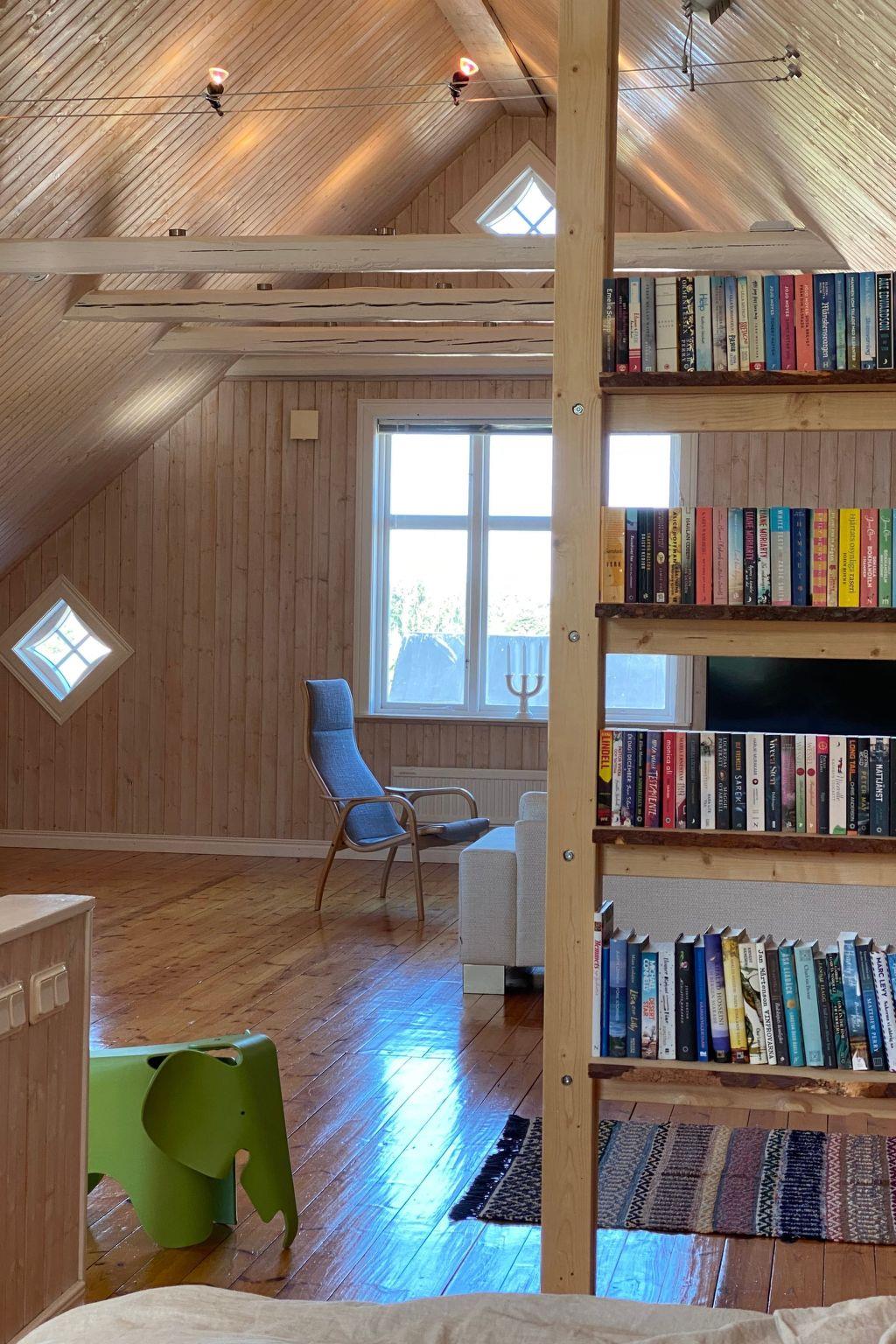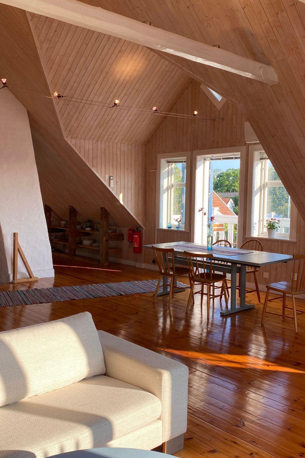 Treat yourself to a break in our high-quality holiday flat in Stora Frö on the sunny island of Öland. Perfectly furnished for up to 4 people, this flat offers the ideal retreat for couples and young families who want to discover the beauty of Öland and southern Sweden. Here you will find peace and comfort in the midst of beautiful nature, which has a beneficial effect on body, mind and psyche. The flat is located in the attic of the former village shop. The intermediate floor has been removed so that you can look up to the gables with open beams - this results in an open loft-like room with 80 square metres of living space and even more floor space. The bathroom is located in the spacious entrance area one floor below and is conveniently separated from the living room and bedroom. The rest of the lower floor (shop) is not used, so you have the entire building to yourself.