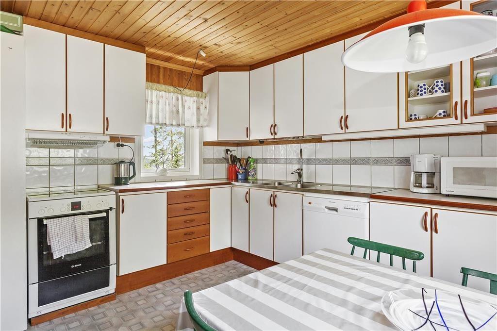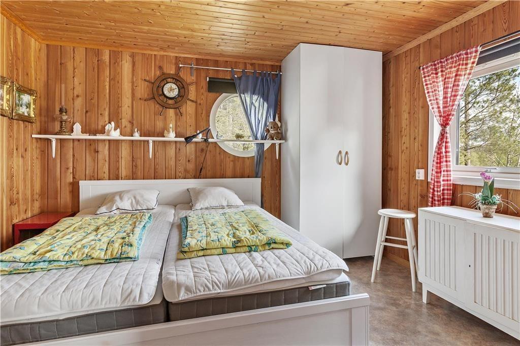 Det velisolerede feriehus har et boligareal på ca 96 m². Fra en lille, overdækket veranda kommer man ind i en rummelig entré med garderobe. Til venstre er to soveværelser, et med en køjesenge, og et med en dobbeltseng. Fra entréen er der også adgang til en hyggelig stue med spisebord, brændeovn, flere siddemuligheder, to sovesofaer, tv og talrige pusle- og brætspil. Fra stuen er der udsigt til søen nedenfor og udgang til terrassen med havemøbler og grill. Ved siden af stuen er et stort badeværelse med bruser, toilet, håndvask og vaskemaskine. Herefter kommer køkkenet, udstyret med el-komfur og ovn, køleskab med fryseboks og mikroovn. Huset har koldt og varmt vand fra egen brønd og opvarmes med varmepumpe. En robåd ligger til rådighed ved søen. Ved ønske, kan der lejes en tremmeseng til et barn.