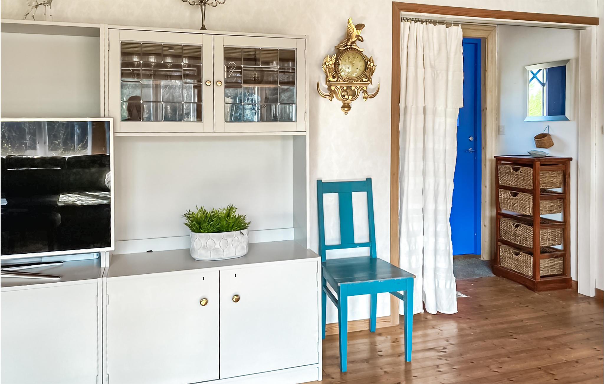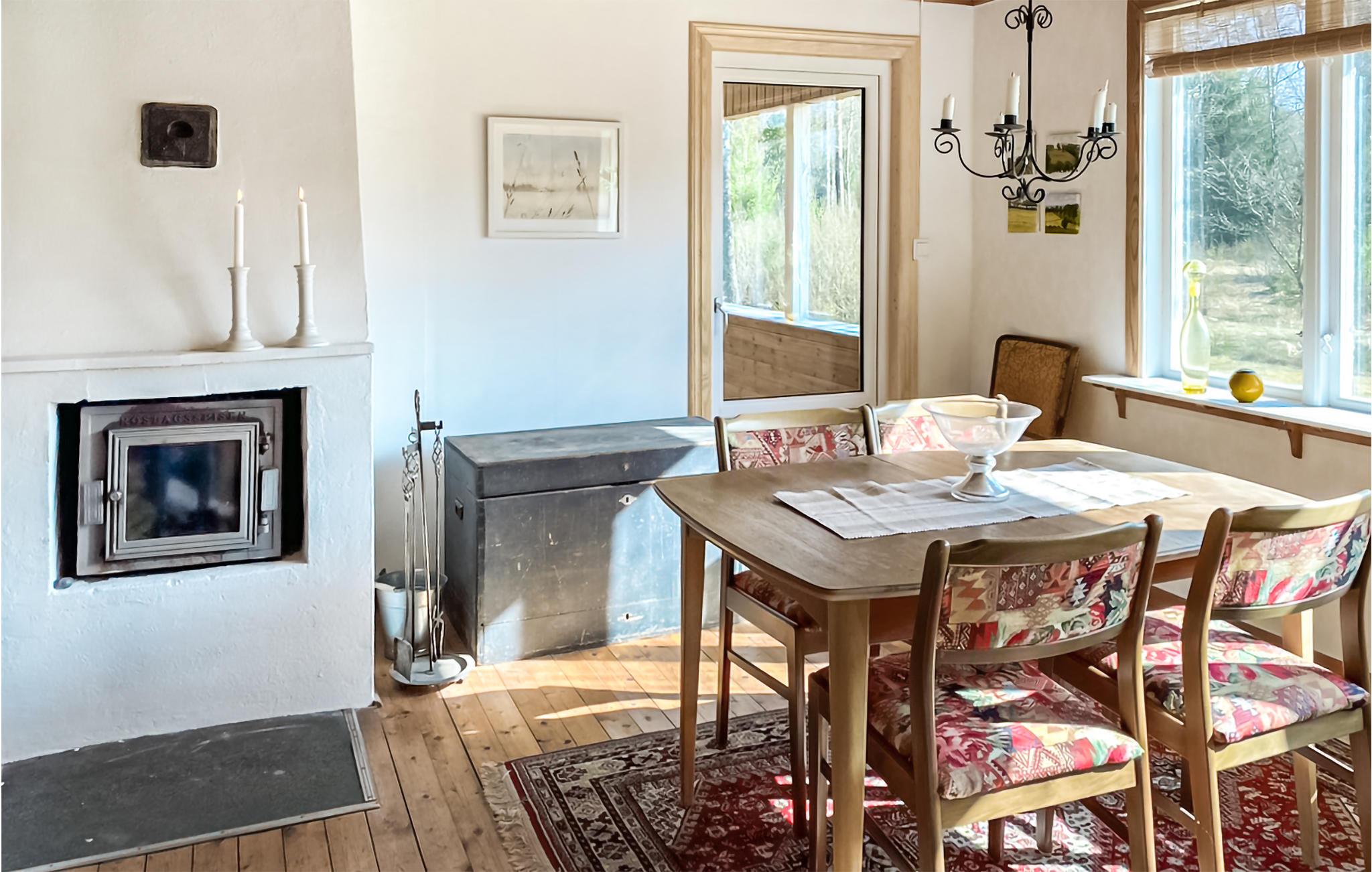 Nyd udsigten over dammen, som I kan skimte fra den overdækkede terrasse. Dette hyggelige træhus ligger tæt ved en skov og er udstyret med grill, pejs og bålplads, så I kan afslutte milde sommeraftener med nygrillet fisk og et glas vin, mens I nyder roen i dette miljø. Føl jer godt tilpas i stuen i dette hus, som lokker med en landlig atmosfære og komfortable møbler.