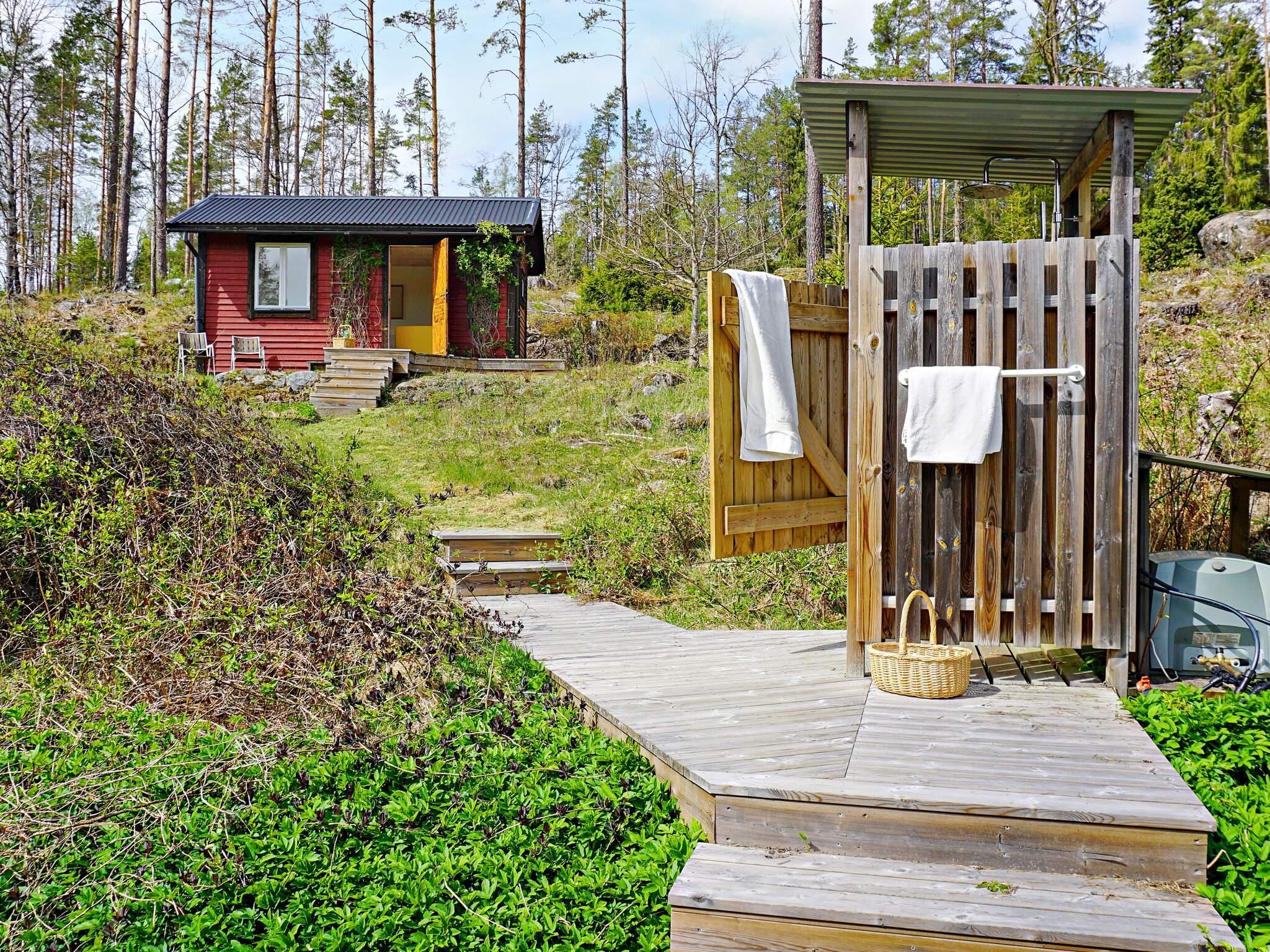 Via köket når ni den träbelagda gången som leder er till dusch och annex på 15 kvm. Här duschar ni ute med varmvatten, tänk vilken härlig känsla att njuta av en varm dusch ute i det fria! Trevligt annex med två enkelsängar och soffa. På gaveln når ni WC med handfat. Huset går på solenergi.