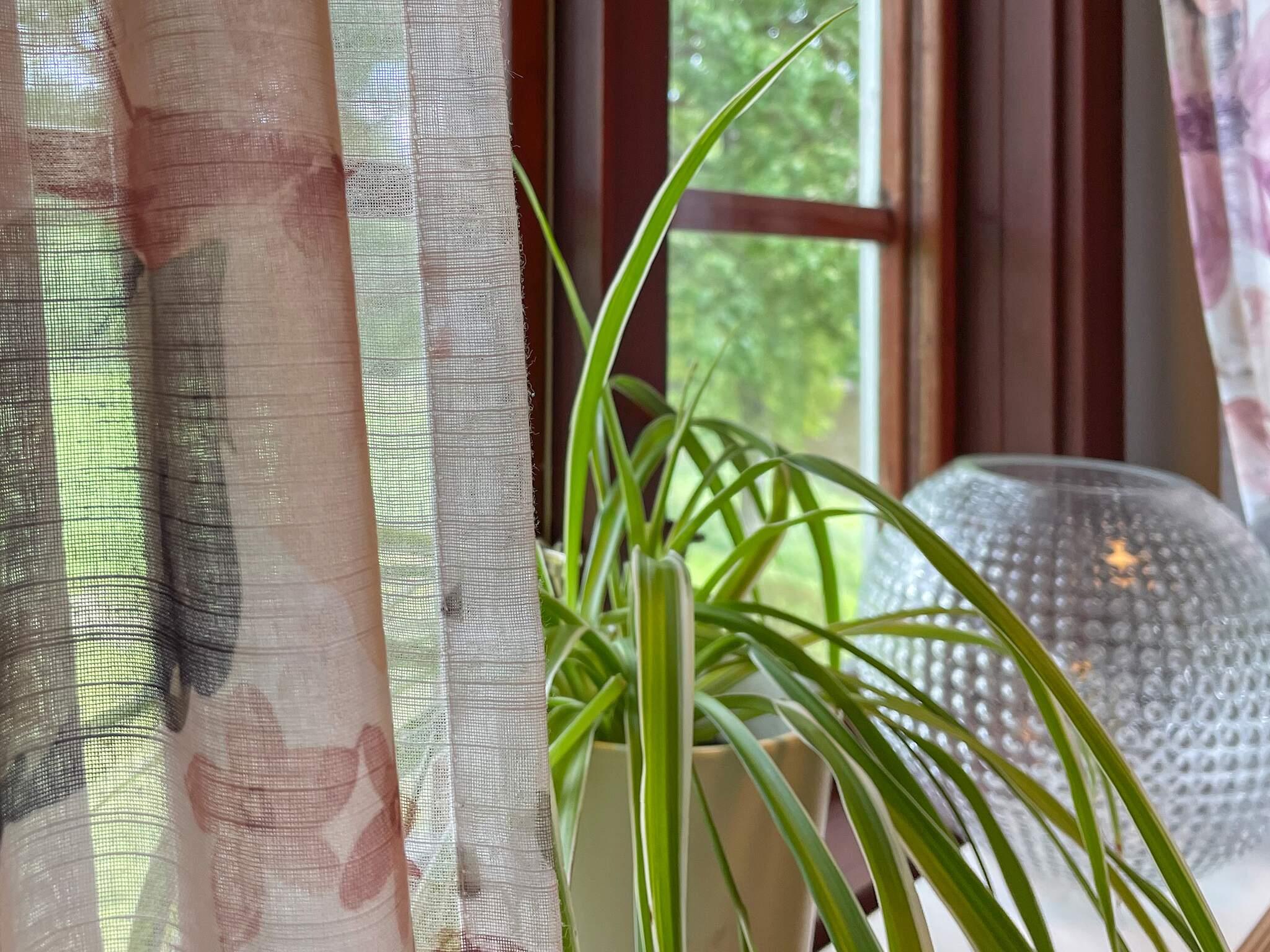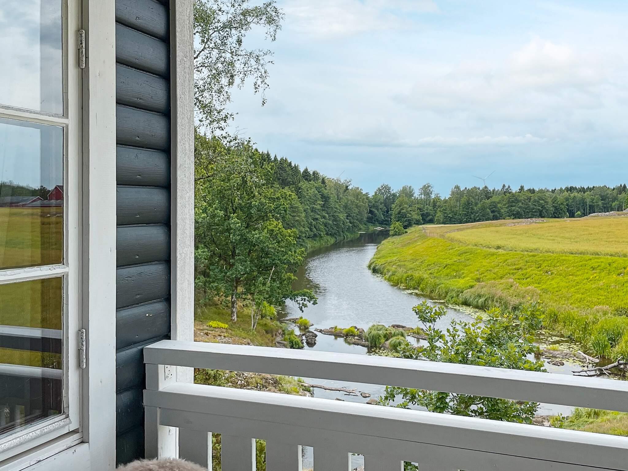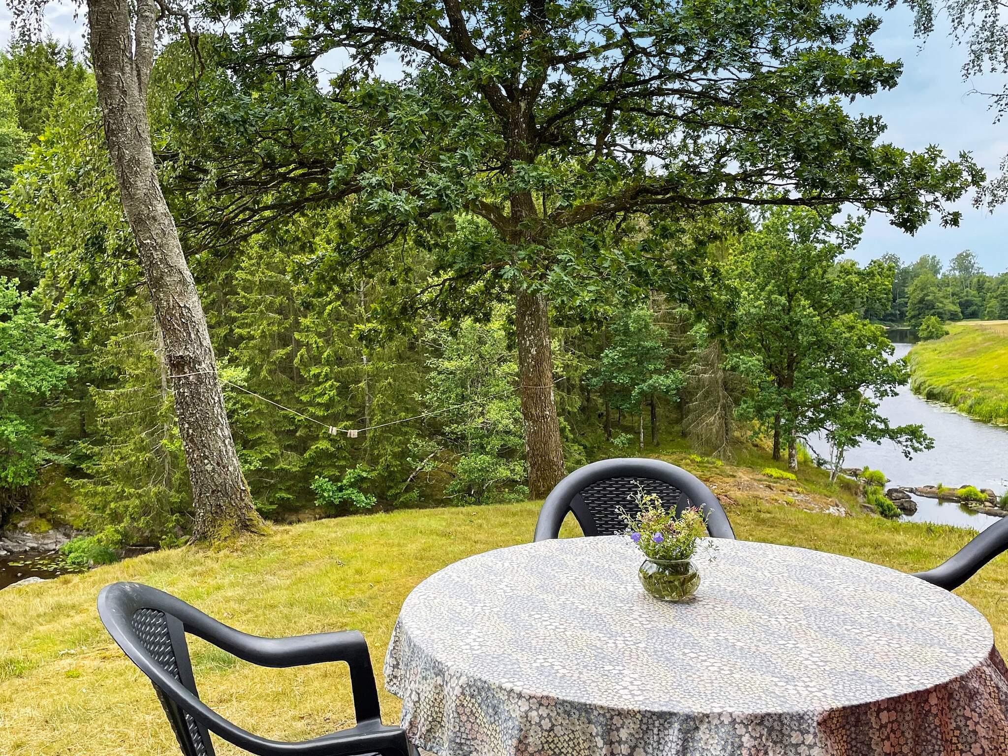 Rakt fram leder en dörr ut till husets lilla altan på baksidan och där är man helt ostörd för morgonen första kopp kaffe i morgonrocken med ån som porlar och träden som susar.