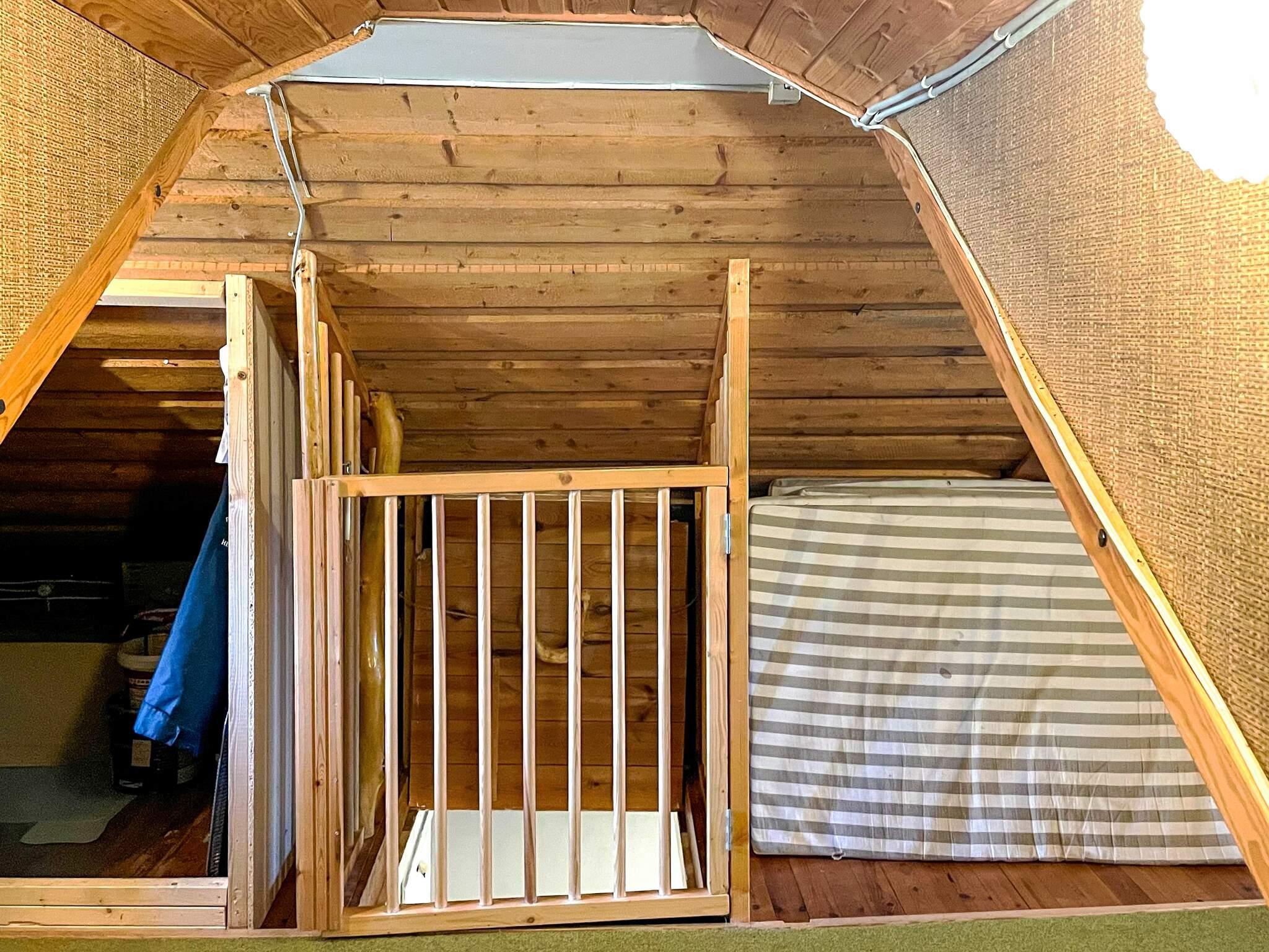 I trappen upp kommer man till sovloftet med två sovrum. Ett rum med två enkelsängar och ett rum med en dubbelsäng. Här uppe är det mer snedtak. Utanför huset på gården finns gott om utrymme för lek och avkoppling i solen. Det finns en klotgrill samt en större eldstad.