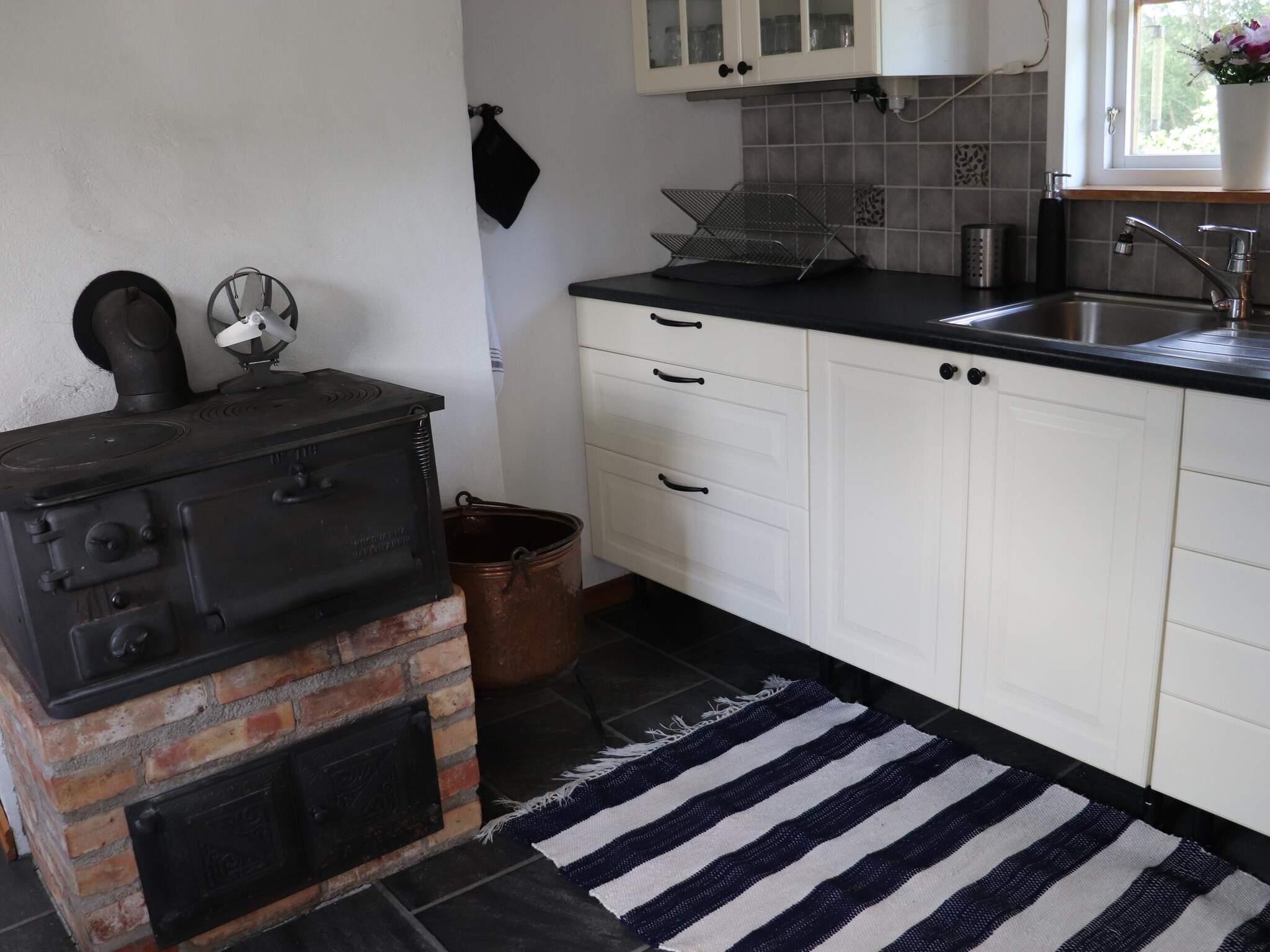 Køkken: El-komfur, køle-frys, mikroovn, brændekomfur, emhætte, kaffemaskine, vand fra brønd