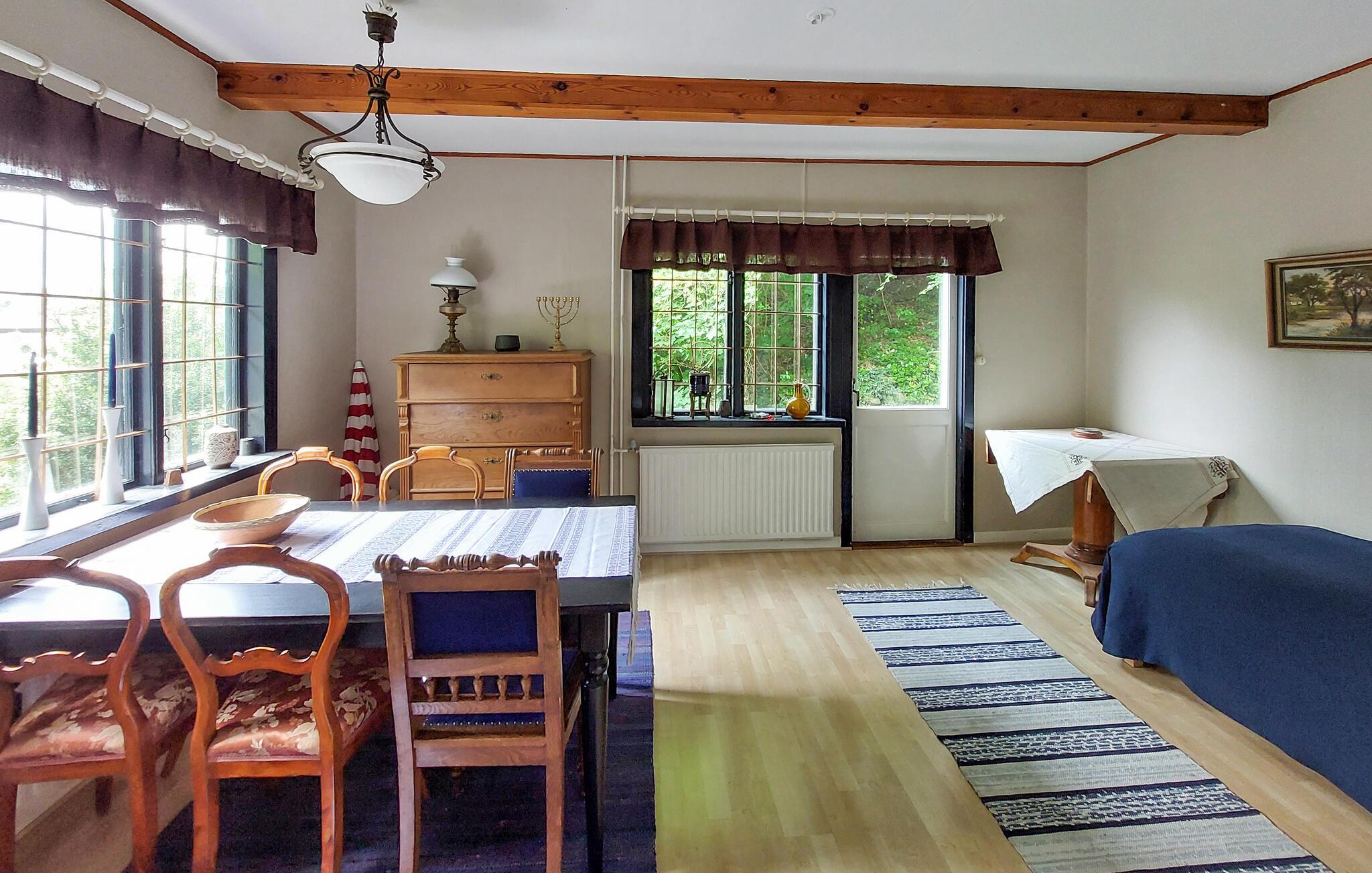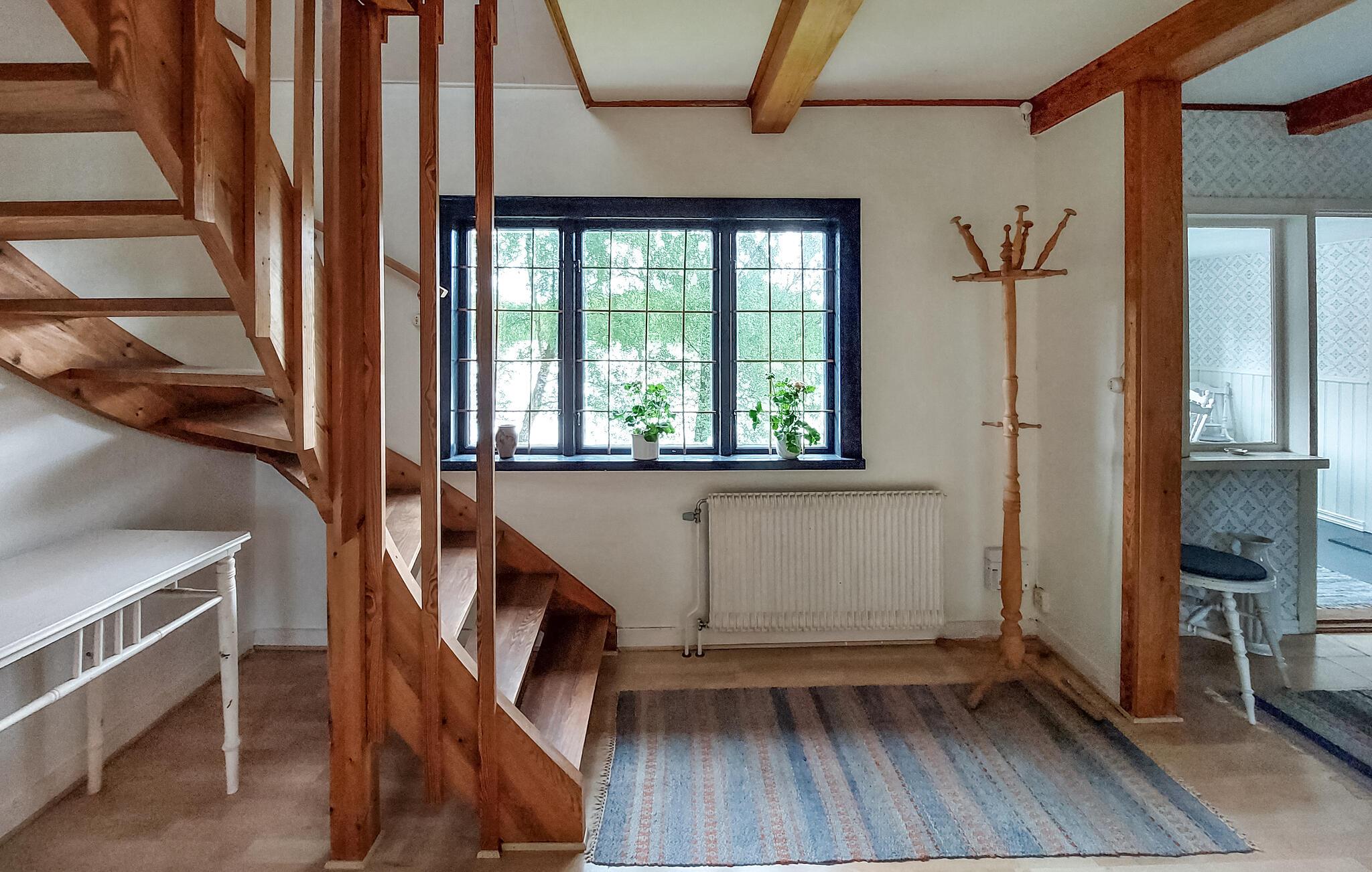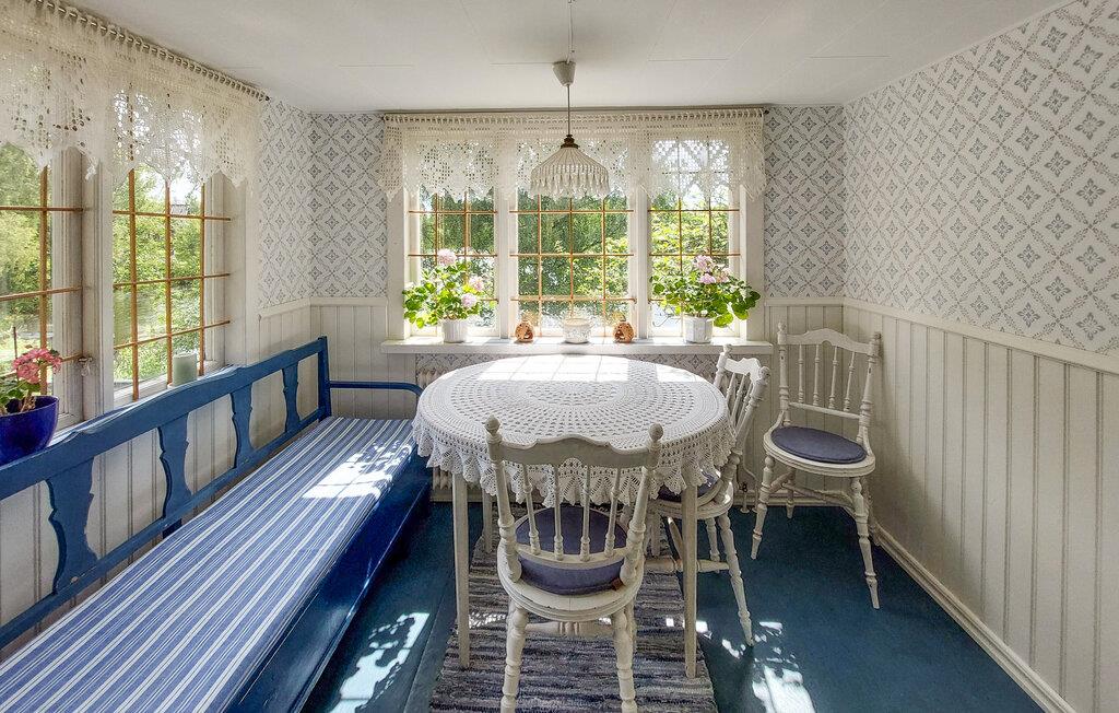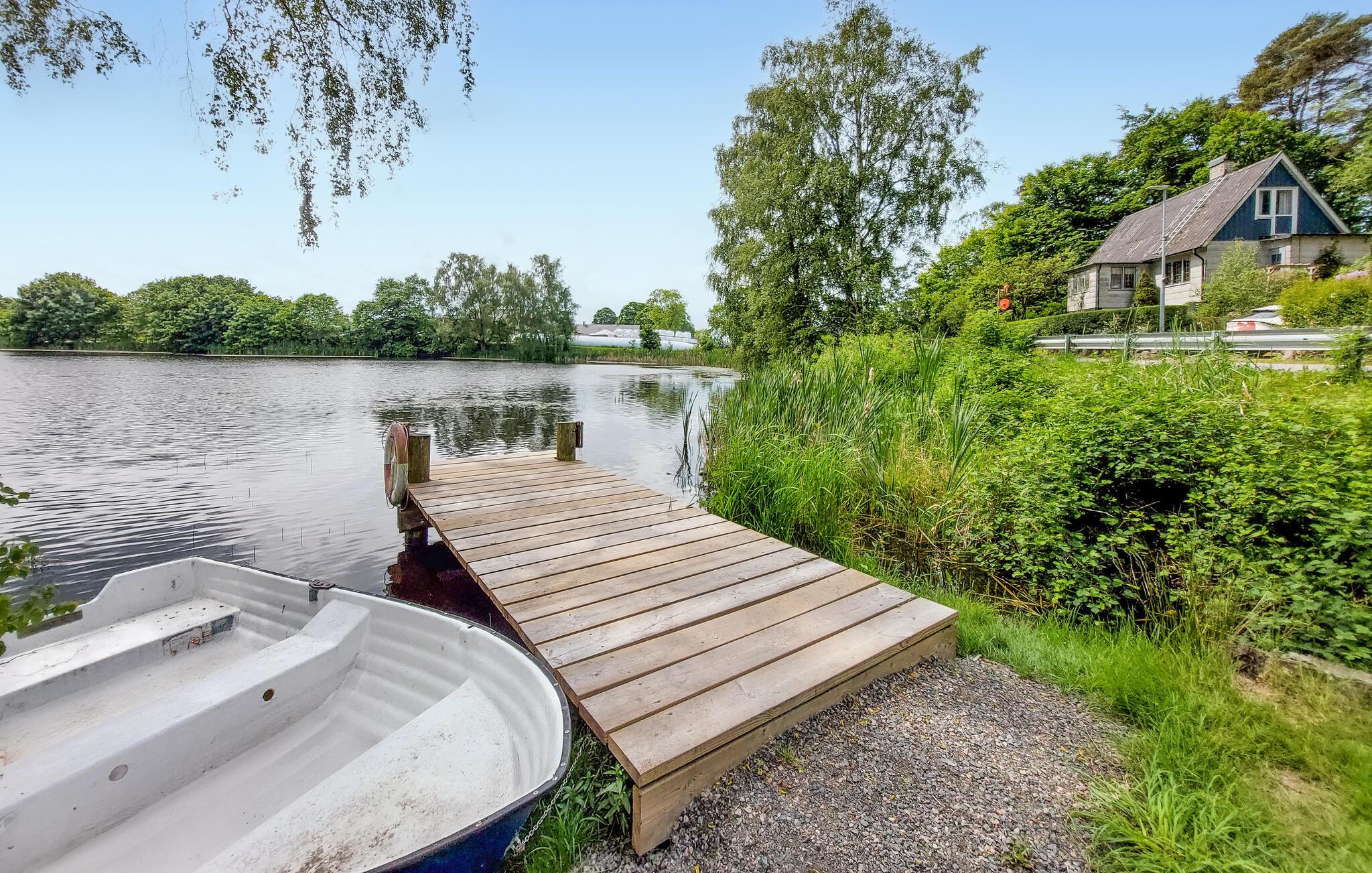 Oplev en idyllisk ferie i dette charmerende feriehus ved søen. Dette kærligt restaurerede hus fra starten af 1900-tallet kombinerer smukke detaljer fra fortiden med moderne faciliteter. Her kan I spise og slappe af i et lyst og indbydende interiør. Fremtryll lækre måltider i det rummelige køkken, nyd udsigten over søen, og brug de komfortable sofaer til at læse eller spille spil sammen. Den grønne naturgrund ligger mellem to søer – forfrisk jer med en svømmetur ved molen, nyd den fredelige atmosfære med en udendørs morgenmad, brug robåden og prøv lykken med at fiske. Tænd grillen og nyd freden og roen langt fra hverdagen. Udforsk det nærliggende Ängelholm, hvor I kan spille golf, shoppe og prøve regionale specialiteter på en fin restaurant. Vandr gennem Hallandsåsens natur, tag ture til sommerbyen Båstad, hav det sjovt med familien i Kungsbygget med sommerkælkning og klatring, og om vinteren kan I nyde skiløjperne på Hallandsåsen.
