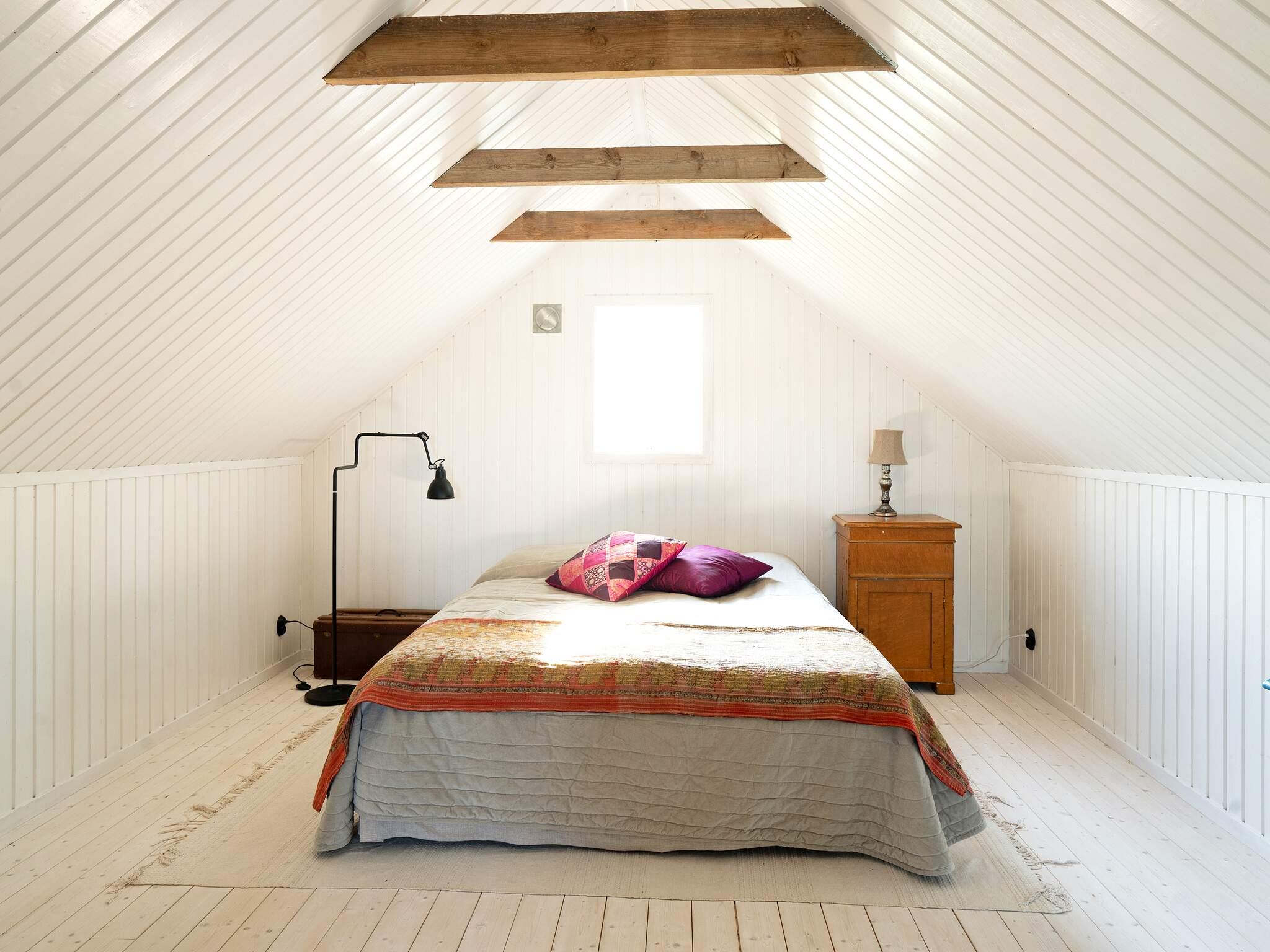 Rakt fram finns en altandörr ut till huset baksida. Här ligger solen på och det är en perfekt plats att ta morgonen första kopp. Intill finns ett fräscht badrum som är helkaklat. Rymligt duschutrymme med charmig inredning. En trappa upp ligger sovrummet som är ett stort rymligt plan med sneda tak, här sover ni gott i en dubbelsäng 160cm.