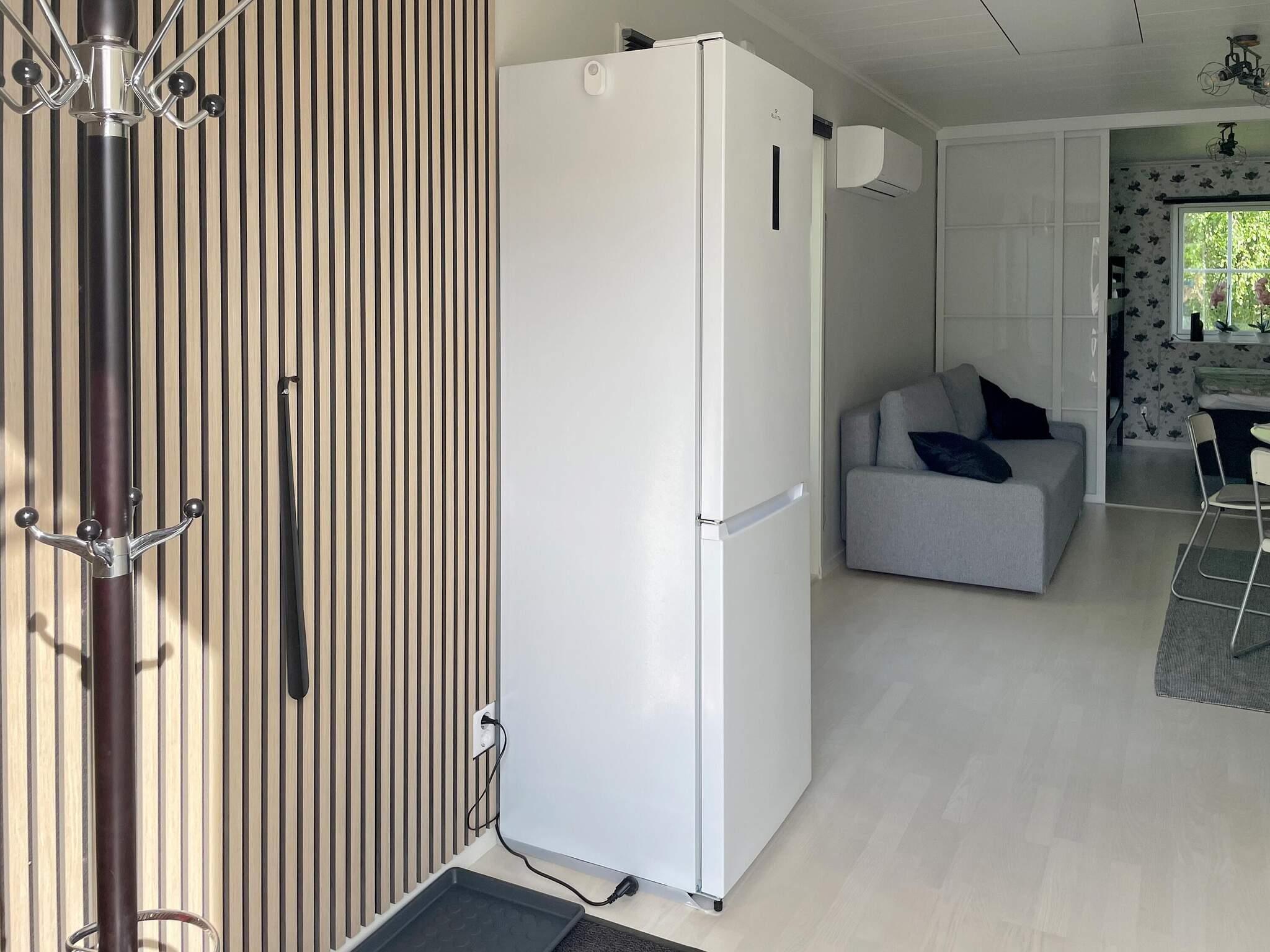 I husets entré finns klädhängare och bra utrymme för förvaring. Öppen planlösning i allrummet med köks del för egen matlagning, matbord att samlas kring och bäddbar soffa att mysa i framför tv:n. Skjutpartier avgränsar till sovrumsdelen med en dubbelsäng och en våningssäng. Badrummet med dusch, wc och tvättställ också välplanerat och rymligt. Från allrummet finns en altandörr ut på terrassen med havsutsikt. Trädecket som är ihopbyggt med ägarens hus ger en fin inramning på två av husets sidor och vid entren. Det finns ytterligare en uteplats med parasoll på husets framsida för den som vill variera sig med sol och skugga de varmaste dagarna. På baksidan av huset som ligger mot havet finns också tillgång till en stor gräsyta där lek och aktiviteter är möjliga.