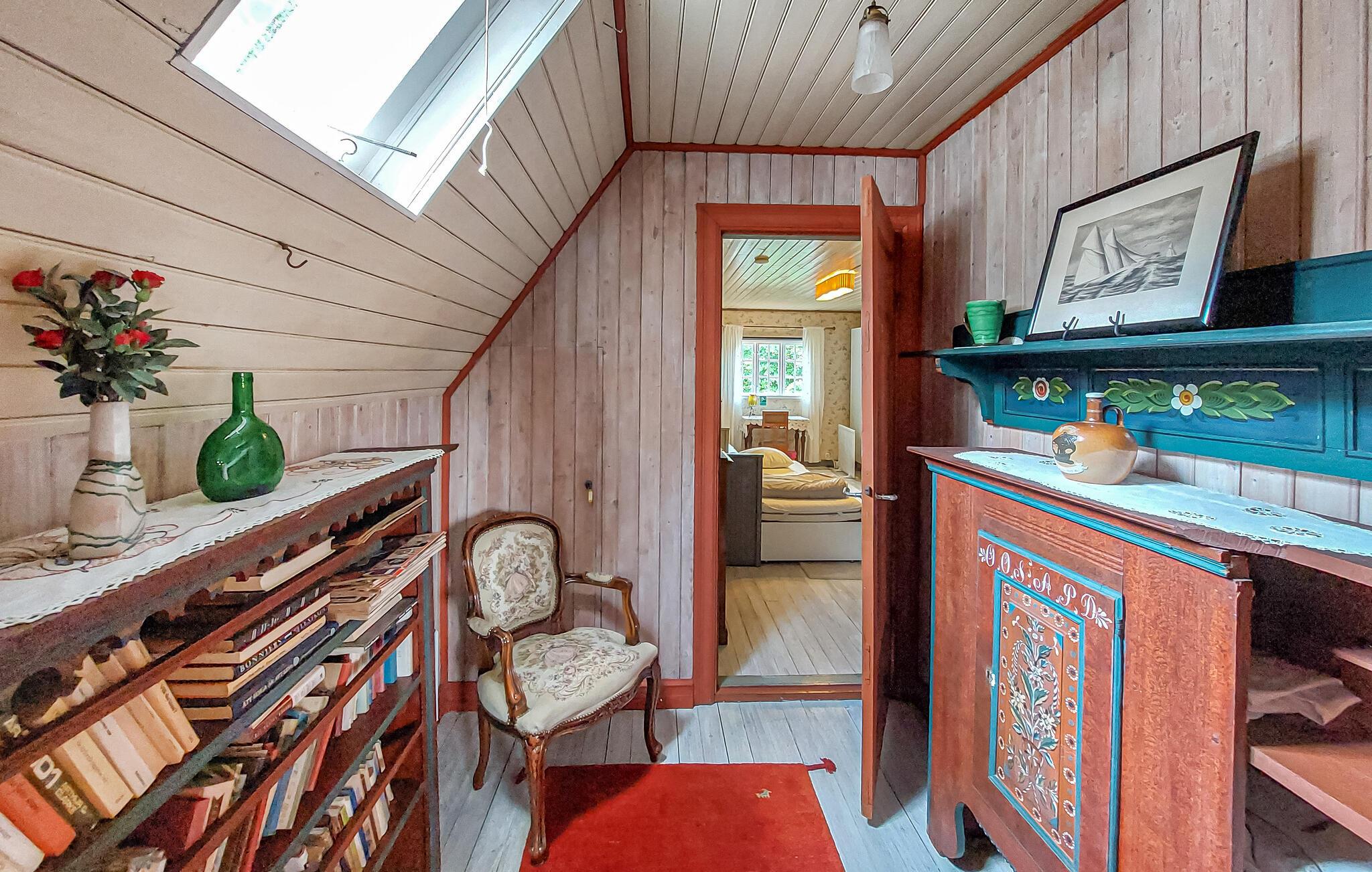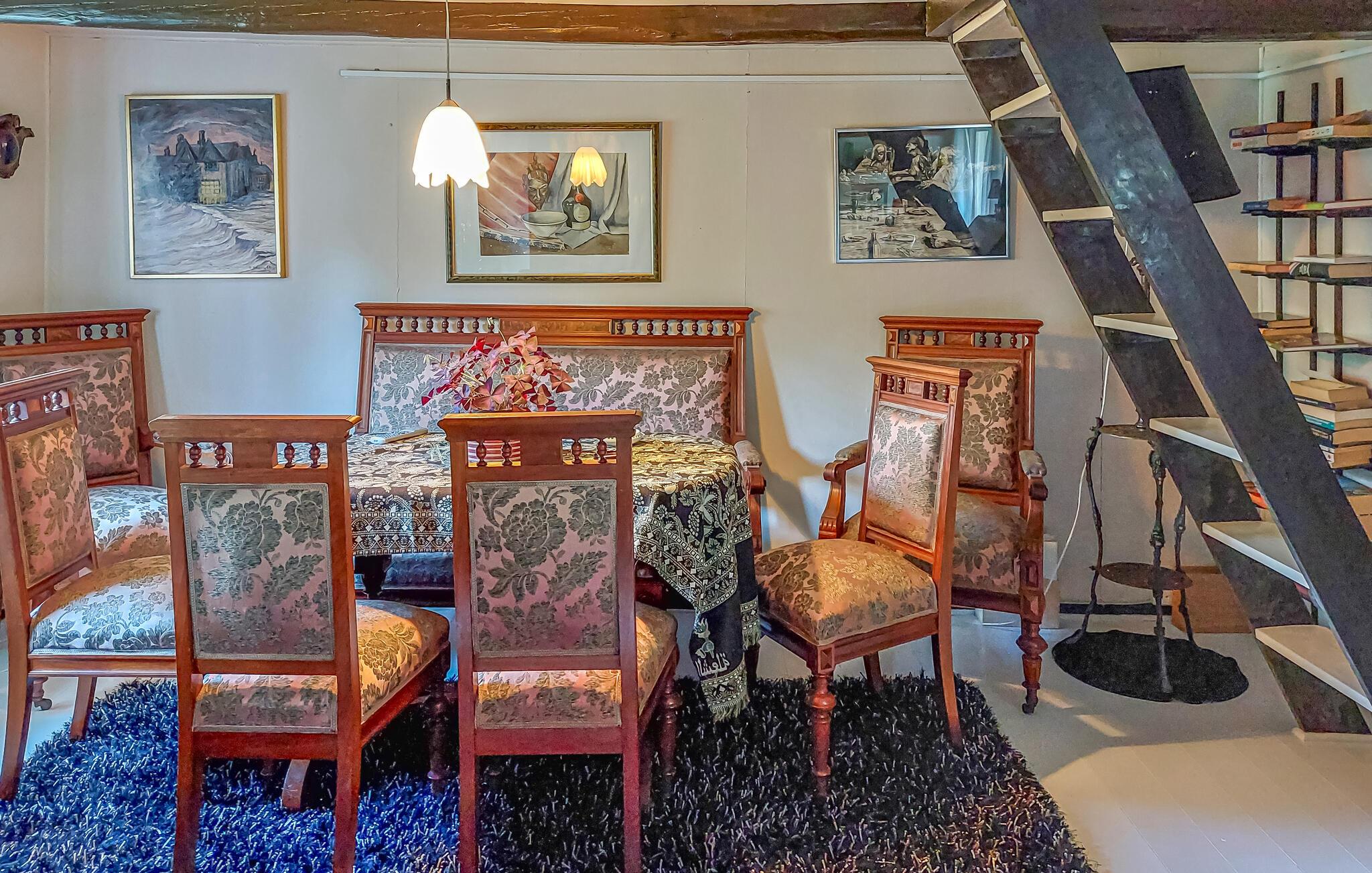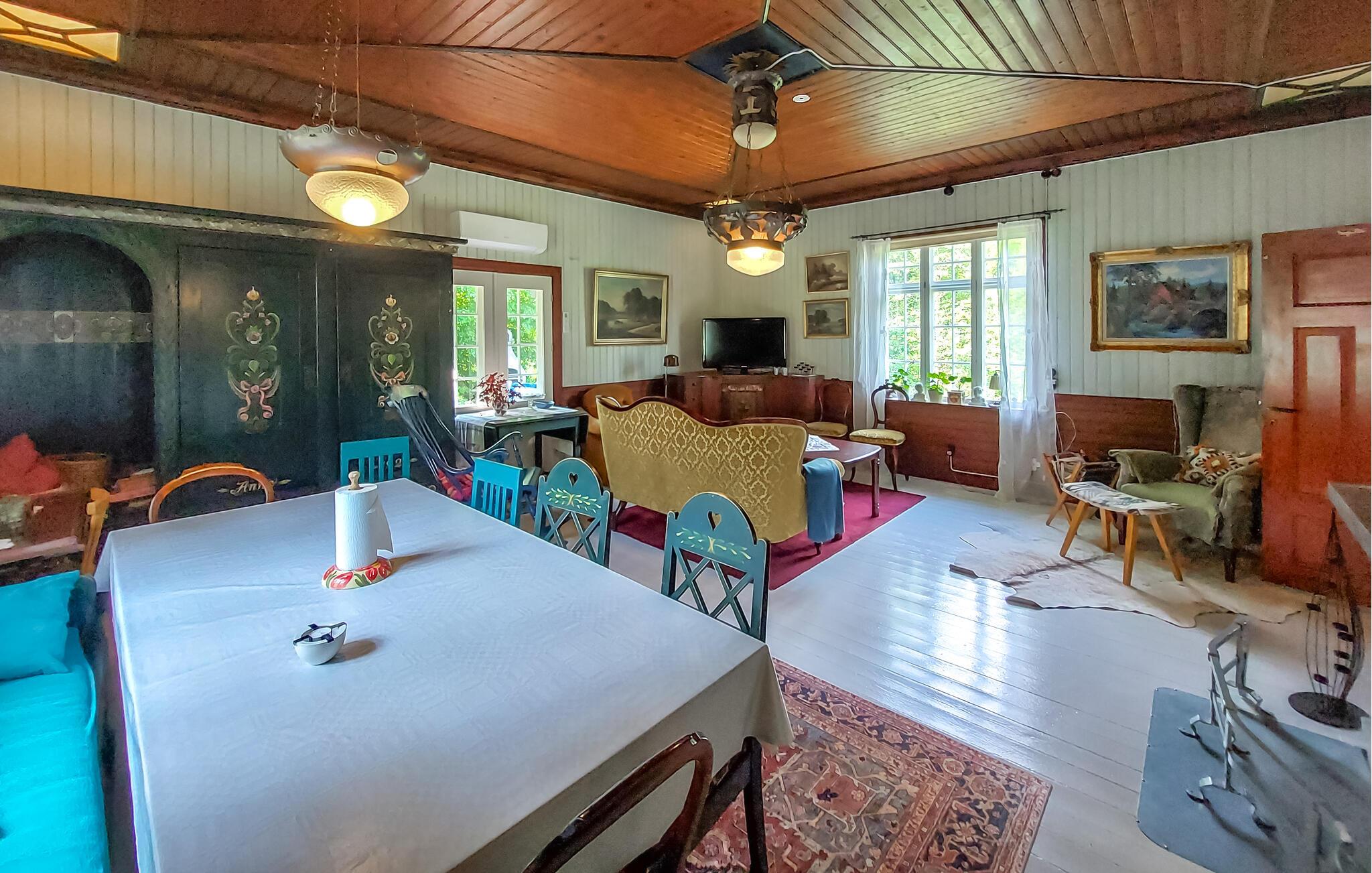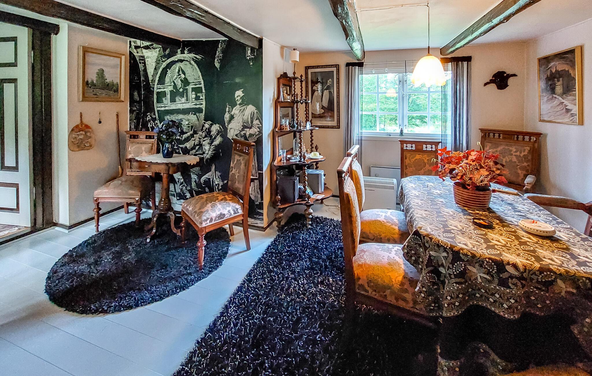 Den autentiske atmosfære i dette idyllisk beliggende arkitekttegnede hus lægger op til at slappe af og lade op. Et varmt trælook, rustikke møbler og en imponerende pejs skaber en hyggelig atmosfære, hvor I hurtigt vil finde jer selv i ferietilstand. Uanset om I lytter til god musik, bliver inspireret af kunstværkerne på væggene eller laver mad sammen – her sætter I tempoet for jeres dag.
