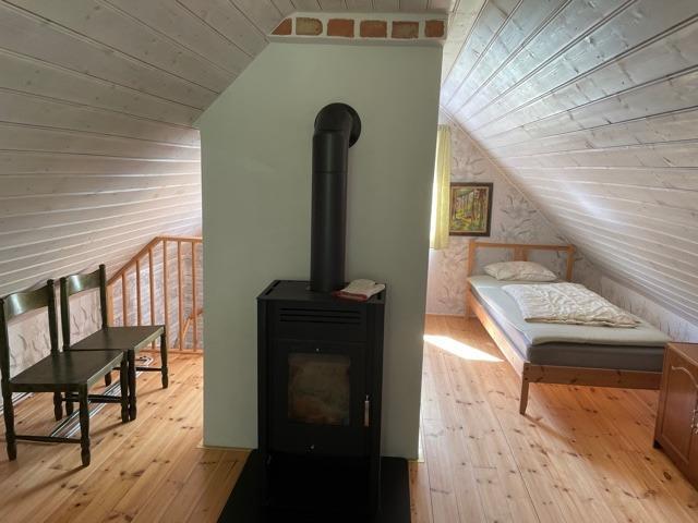 Dejlig varme på begge etager, fordi der både er luftvarme og brændeovn oppe og nede.