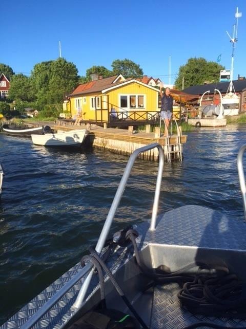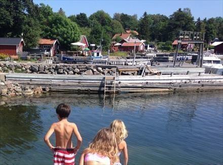 Direkte ved huset findes en lille badebro – perfekt til en forfriskende morgenbadning eller hyggelige soltimer. Man ankommer med bil til Blidö, hvor bilen parkeres, og derefter går turen videre med færge eller taxibåd til øen. Indkøbsmuligheder findes på naboøen Blidö (ca. 30 min med færge) eller på Rödlöga.