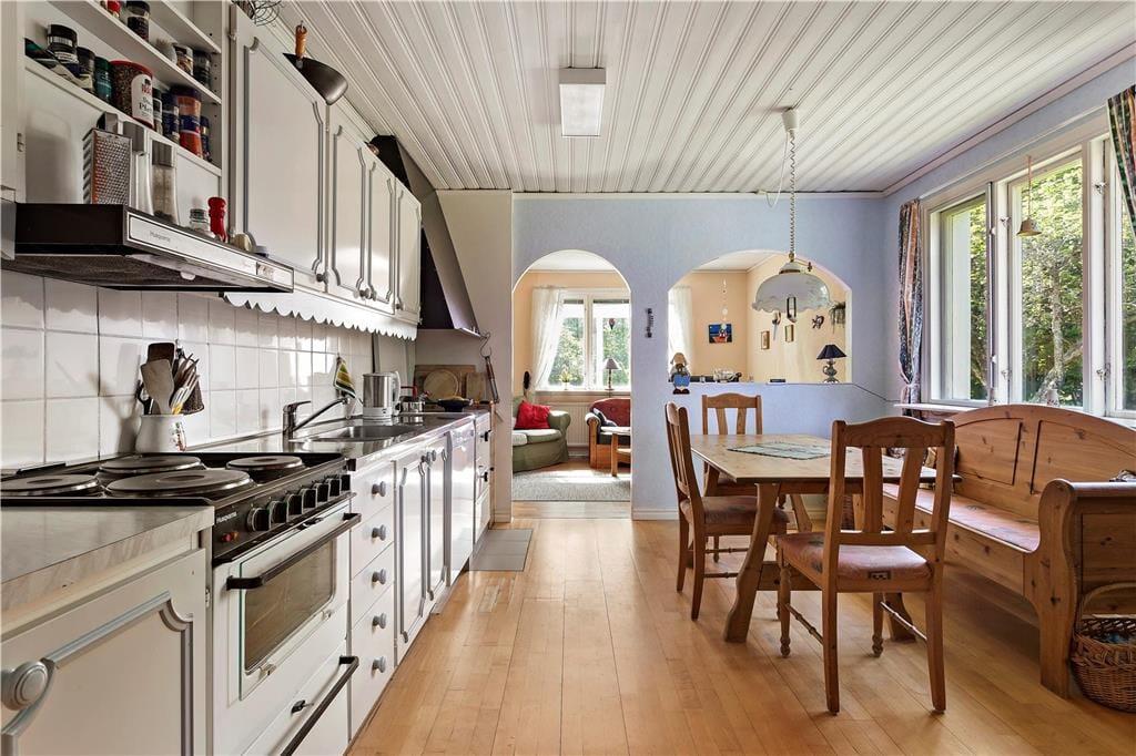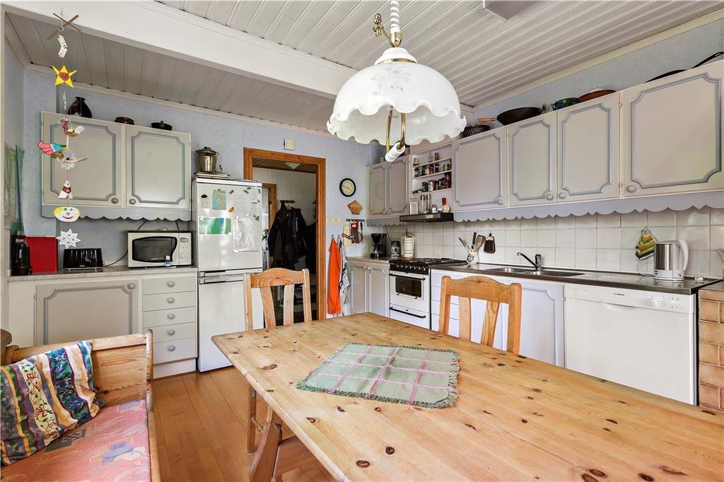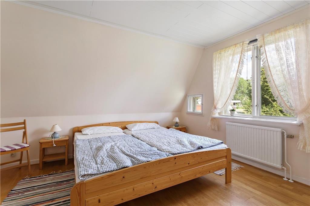 Det store feriehus blev bygget i 1934 og senere blev en tilbygning opført. Med sine 138 m² er her god plads til seks personer. I stueetagen er et stort køkken-alrum med spiseplads, el-komfur, gammeldags brændekomfur, køleskab, mikroovn og opvaskemaskine. Fra køkkenet er der videre adgang til en hyggelig stue med sofaområde, tv, dvd-, video- og stereoanlæg. I stueetagen er der derudover et toilet, et soveværelse med en dobbeltseng og et bryggers med vaskemaskine, tørretumbler, fryser, sauna og bruser. På 1. salen er en lille gang med læsehjørne, samt to yderligere soveværelser, heraf et med dobbeltseng og et med to enkeltsenge. Sommerhuset har koldt og varmt vand og kan opvarmes med el. Derudover er der en overdækket veranda med havemøbler. Gæster kan også gøre brug af grill, kano, robåd, syv cykler, en barnerejseseng og en gynge.