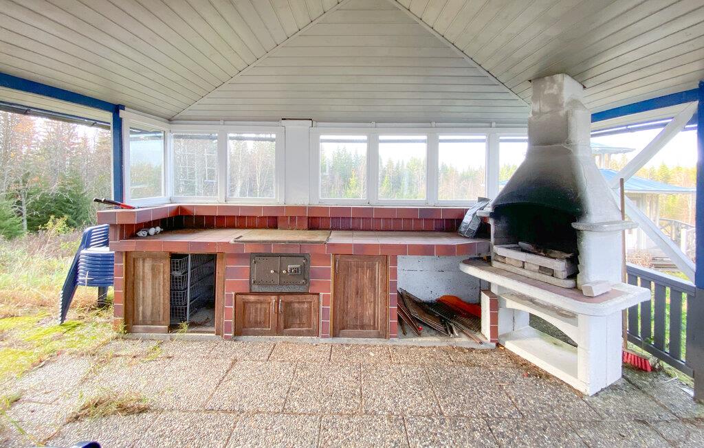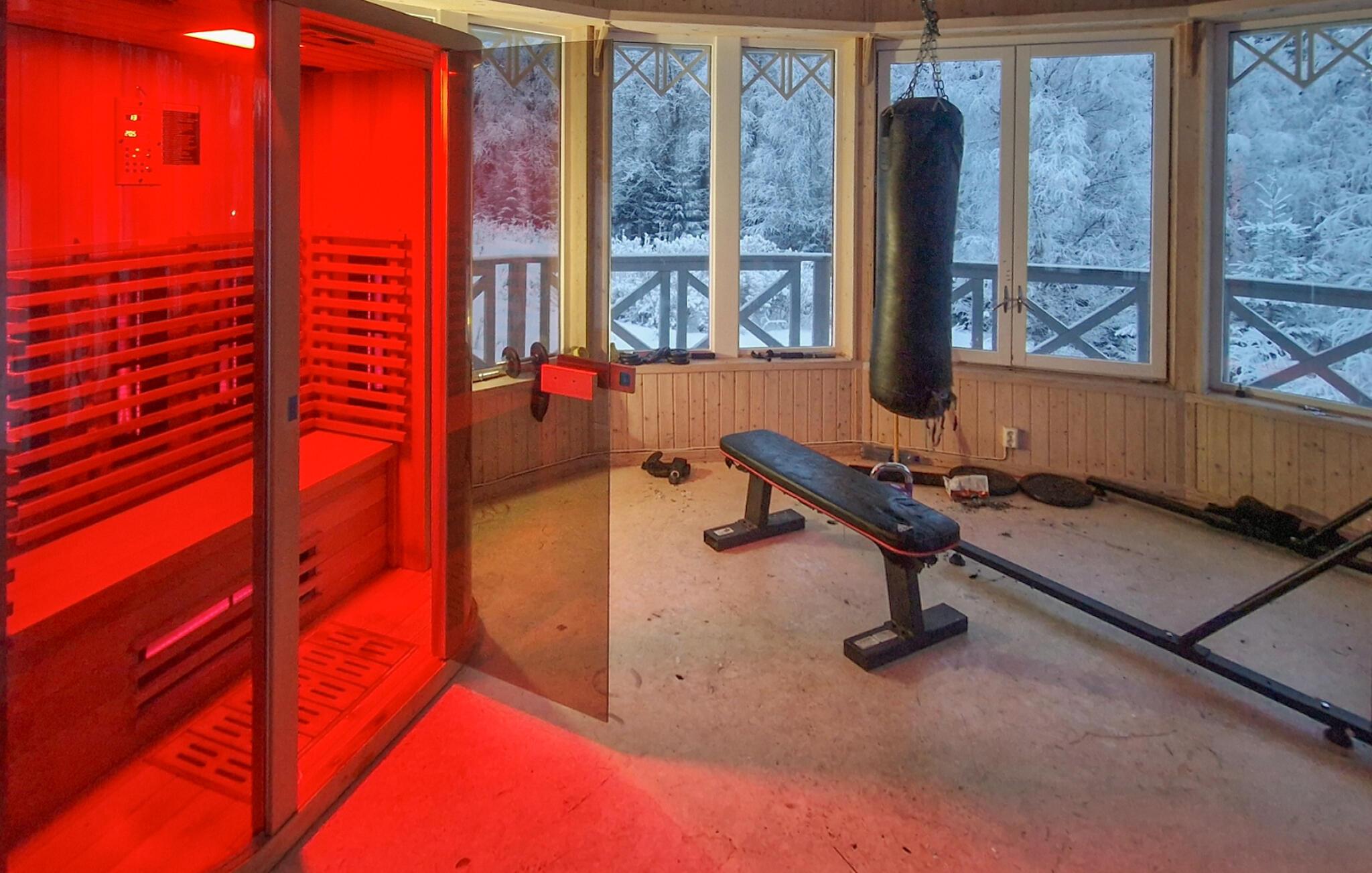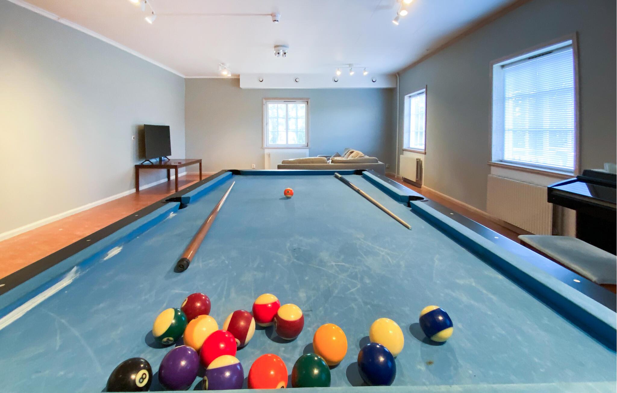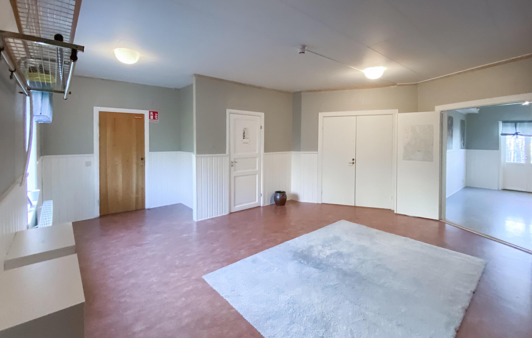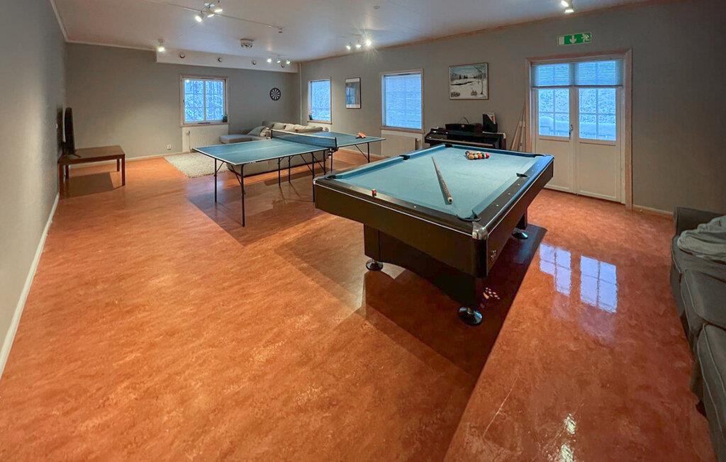 Denne rummelige hytte, beliggende i roen i de svenske skove, tilbyder jer en vidunderlig pause fra hverdagen. På verandaen kan I nyde udsigten over baghaven og den omkringliggende natur - ideel til at tilbringe tid sammen med familie eller venner. De mange soveværelser gør boligen perfekt til familiesammenkomster eller grupperejser. Indenfor finder I en stor spisestue, et veludstyret køkken og et poolbord til sociale aftener. Fitnessrummet lægger op til at holde jer aktiv selv på ferie.