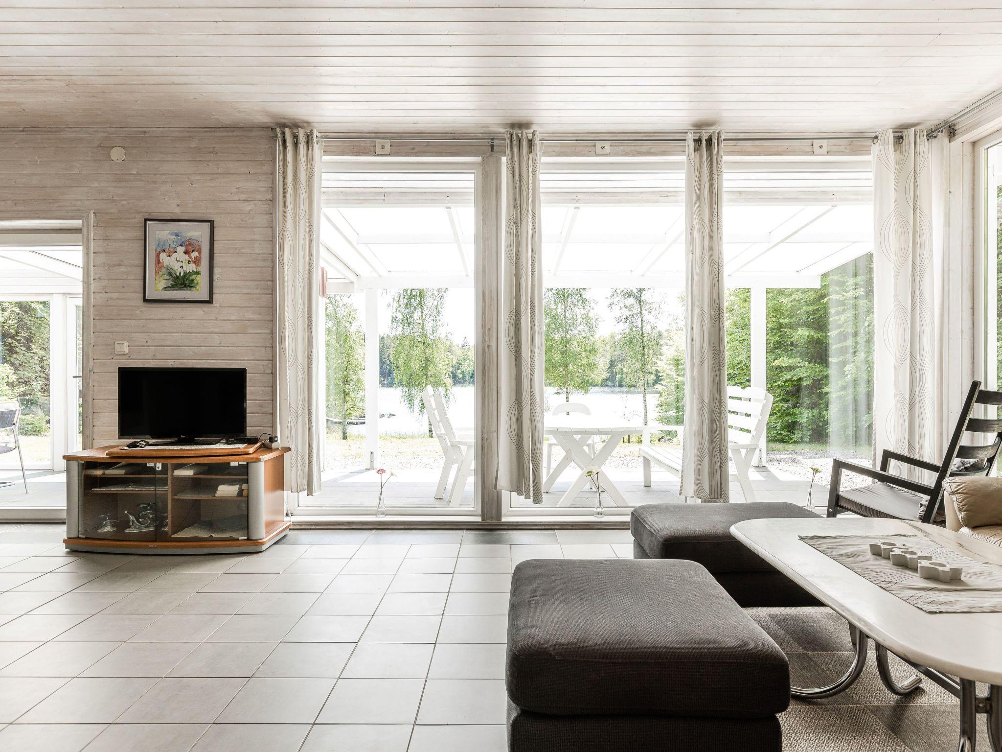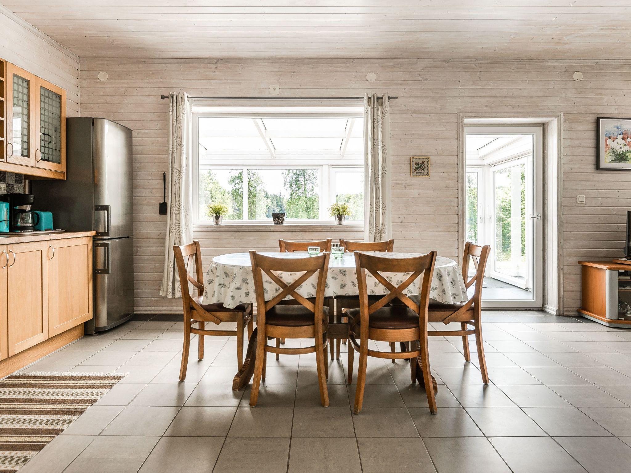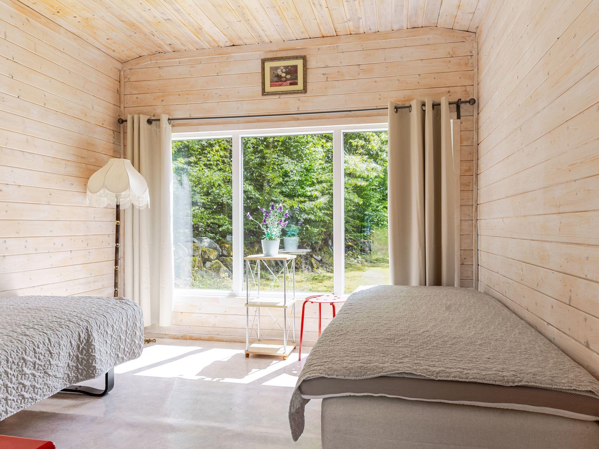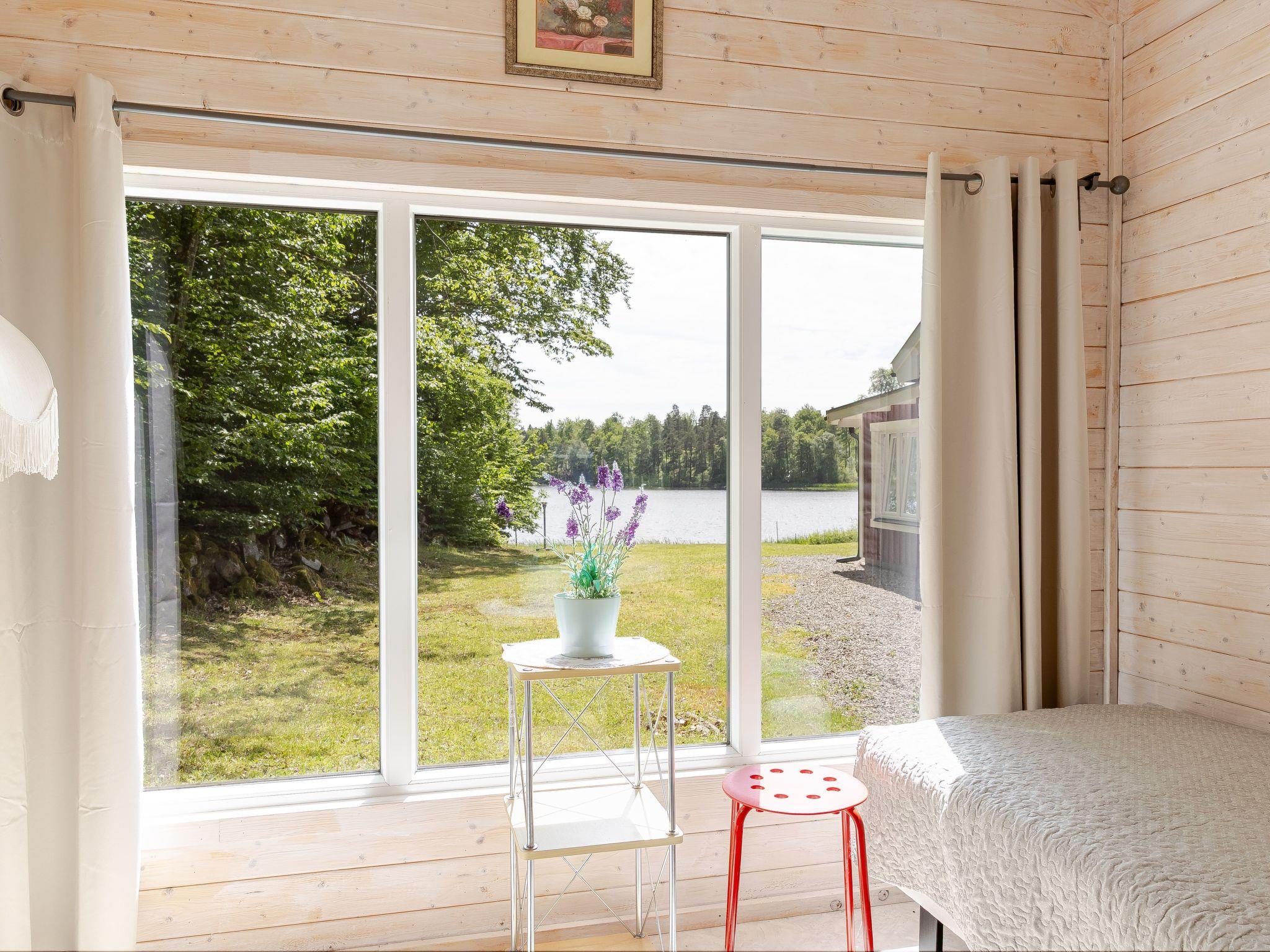 "Erikstorp 145", 3-room house 88 m2. Object suitable for 6 adults. Beautiful and cosy furnishings: living/sleeping room with 1 double sofabed, Scandinavian wood stove and satellite TV. Exit to the veranda. 1 room with 1 double bed. 1 room with 2 beds. Open kitchen (oven, 4 ceramic glass hob hotplates, microwave, freezer, electric coffee machine) with dining table. Shower/WC, Sauna. Electric heating. Wooden floors. View of the lake. Please note: one double bedroom is outside the apartment. Non-smokers only. Freezer approx. 100 l. Only allowed to use the owners wood for the fireplace.