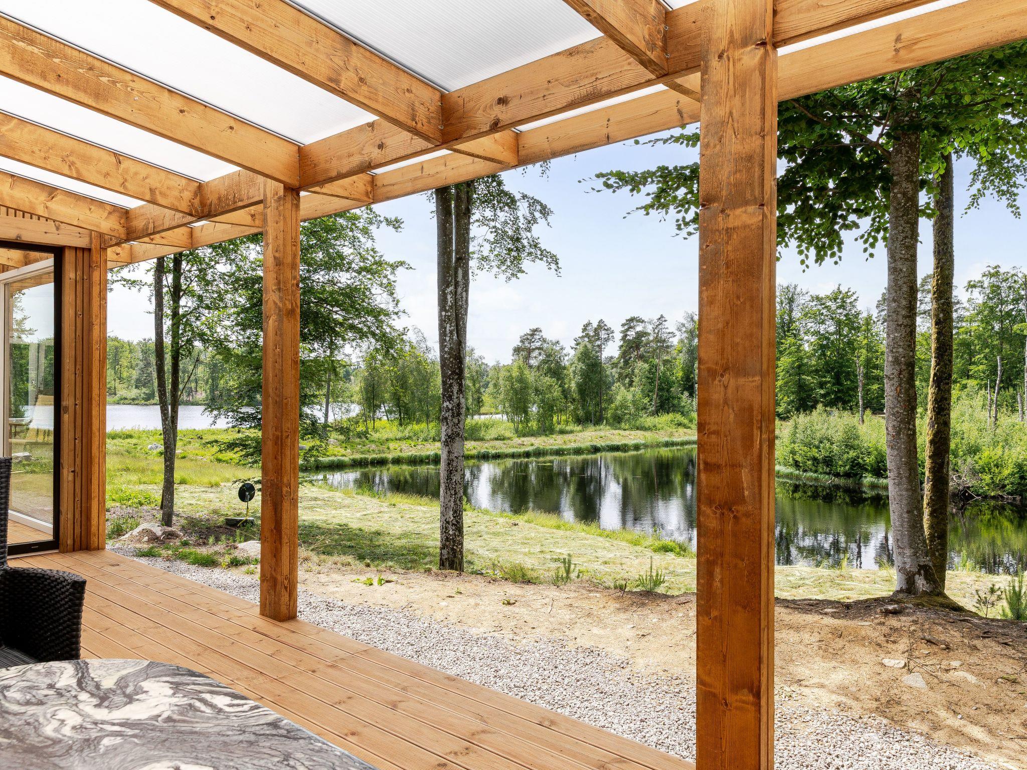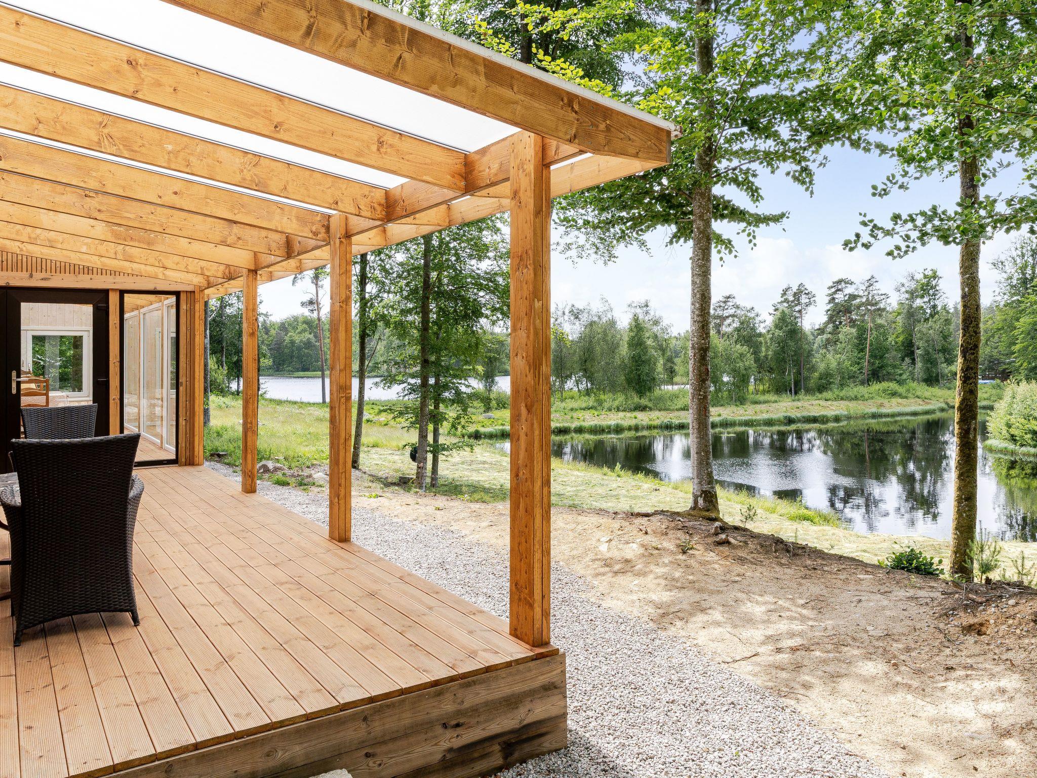 Very modern, beautiful house "Erikstorp 149", built in 2024. 10 km from the centre of Olofström, 5 km from the centre of Gränum, 10 km from the centre of Mörrum, 100 m from the lake, direct access to the beach. Private: natural state property 500 m2, garden (not fenced) with trees. Garden furniture, barbecue. Available: boat (extra). 500 m long motor access (via unmade road). Parking (for 2 cars) on the premises. Supermarket 10 km, restaurant 10 km, bar 10 km, bakery 10 km, bus stop 4.2 km, sandy beach 1 km, indoor swimming pool 10 km. Fishing permit is not neeeded, only allowed to use the boat motor that can be booked as an additional service.