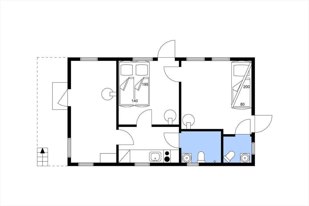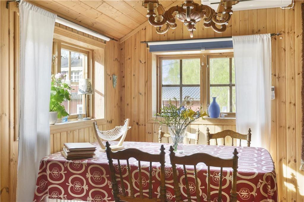 Det hyggelige feriehus, som ligger knap 25 m fra udlejers hus, er ca. 60 m² stort og har tre rum, et tekøkken, et badeværelse med bruser og toilet og et separat gæstetoilet. Samtlige rum i huset er smagfuldt indrettet i skandinavisk stil med træbeklædte vægge og kan bruges som kombineret stue og soveværelse. Alle værelser er tilgængelige udefra. Det største af de tre rum er udstyret med en hyggelig spiseplads, brændeovn, tv og stereoanlæg samt en dobbelt sovesofa. Det næststørste rum, hvorfra der også er adgang til gæstetoilettet, er indrettet med en køjeseng, to kommoder samt et spisebord med stole og en brændeovn - brænde til brændeovnen ligger til fri afbenyttelse. Mellem disse to værelser er der et tredje værelse, som også er indrettet med en dobbelt sovesofa og udstyret med et klædeskab og endnu en brændeovn. Tekøkkenet er udstyret med køleskab med fryser, samt en dobbelt elektrisk kogeplade. Fra tekøkkenet kommer man også ind i det rummelige badeværelse med bruser, toilet og håndvask. Huset har rindende varmt og koldt vand og kan opvarmes via elradiatore, med varmepumpe og med brændeovnene. For de mindste gæster er der en gynge og en sandkasse i haven. Gæsterne har desuden gratis internetadgang (WLAN) og kan gøre brug af både havemøbler, grill og robåden.