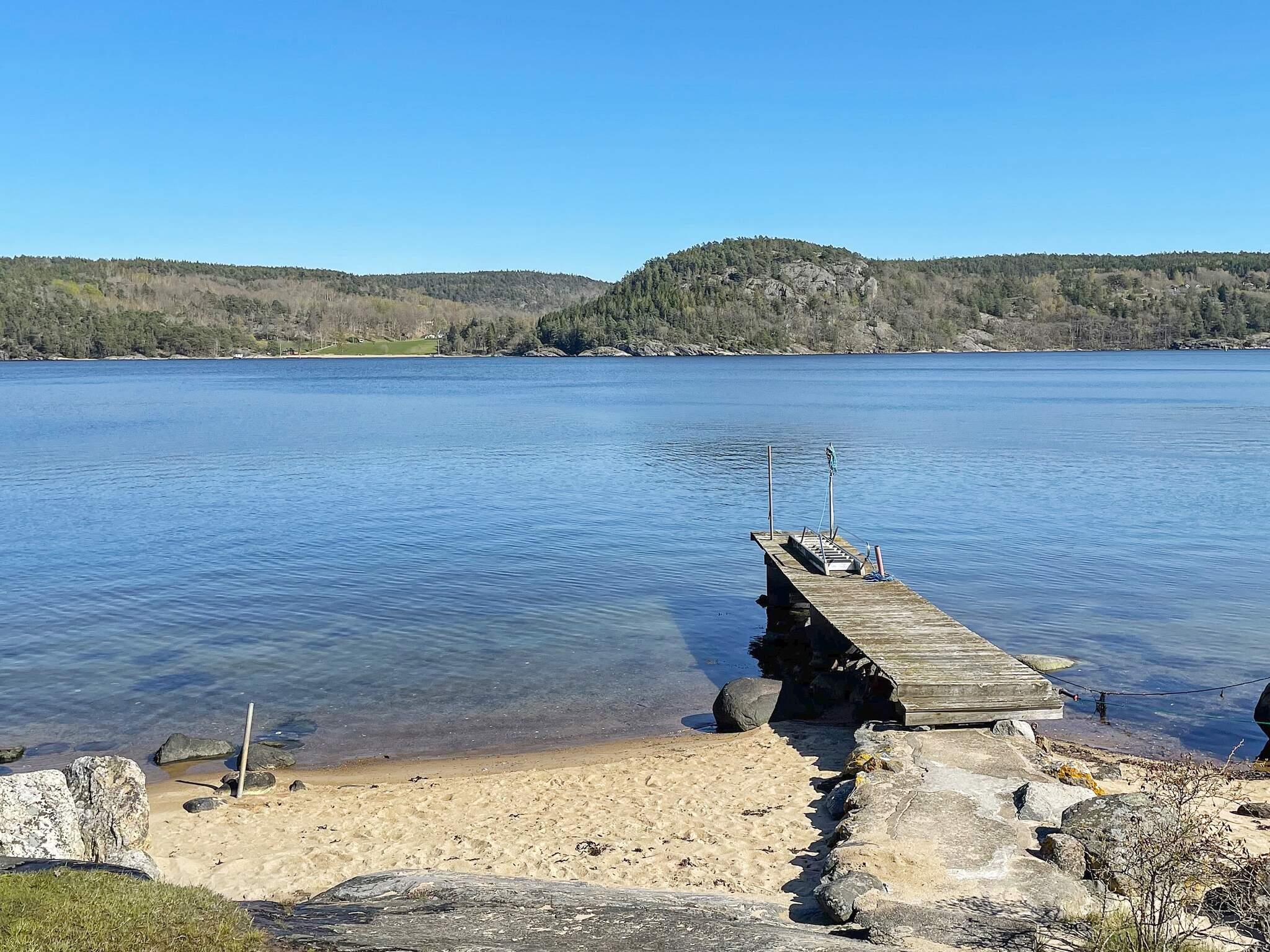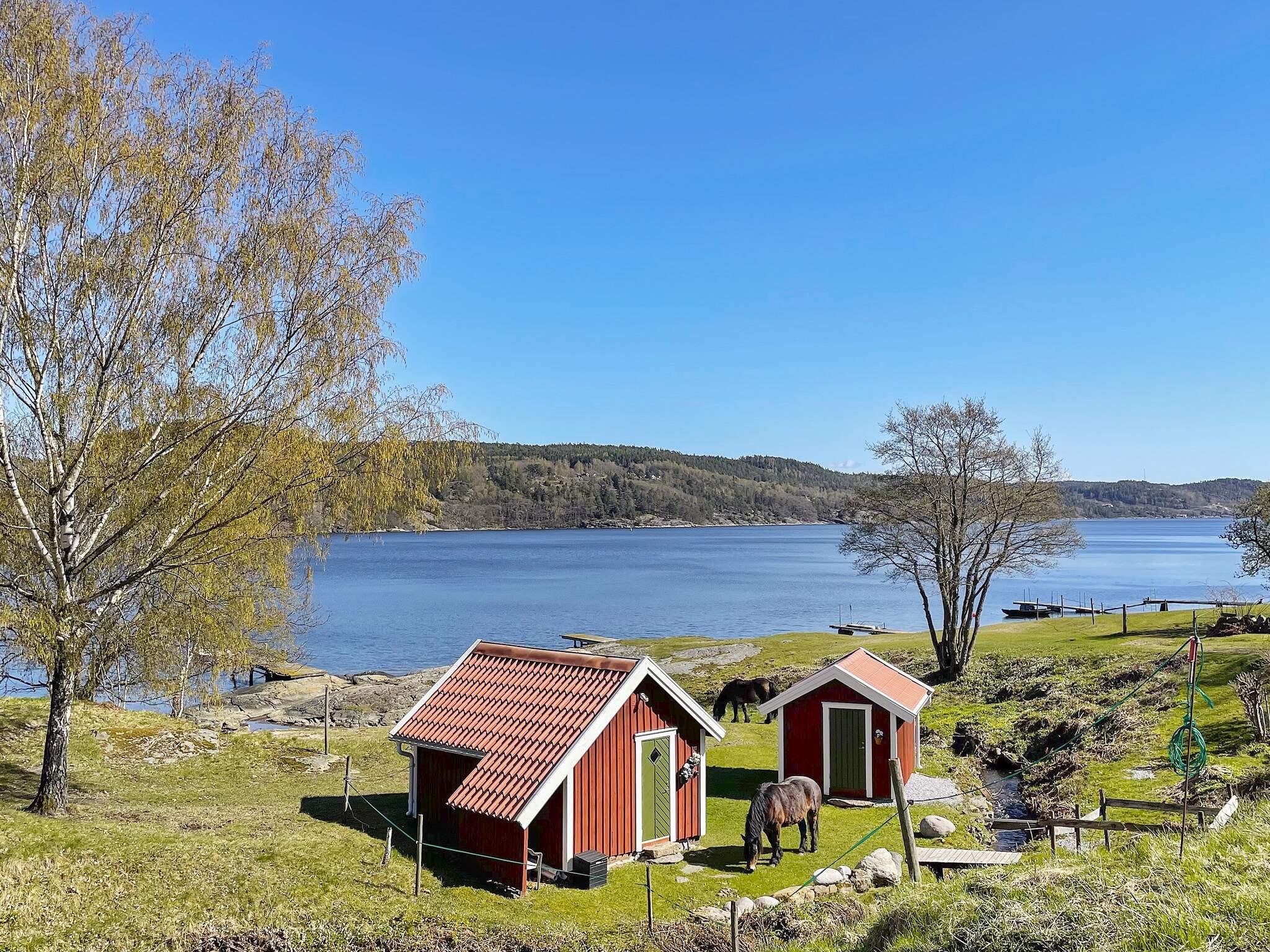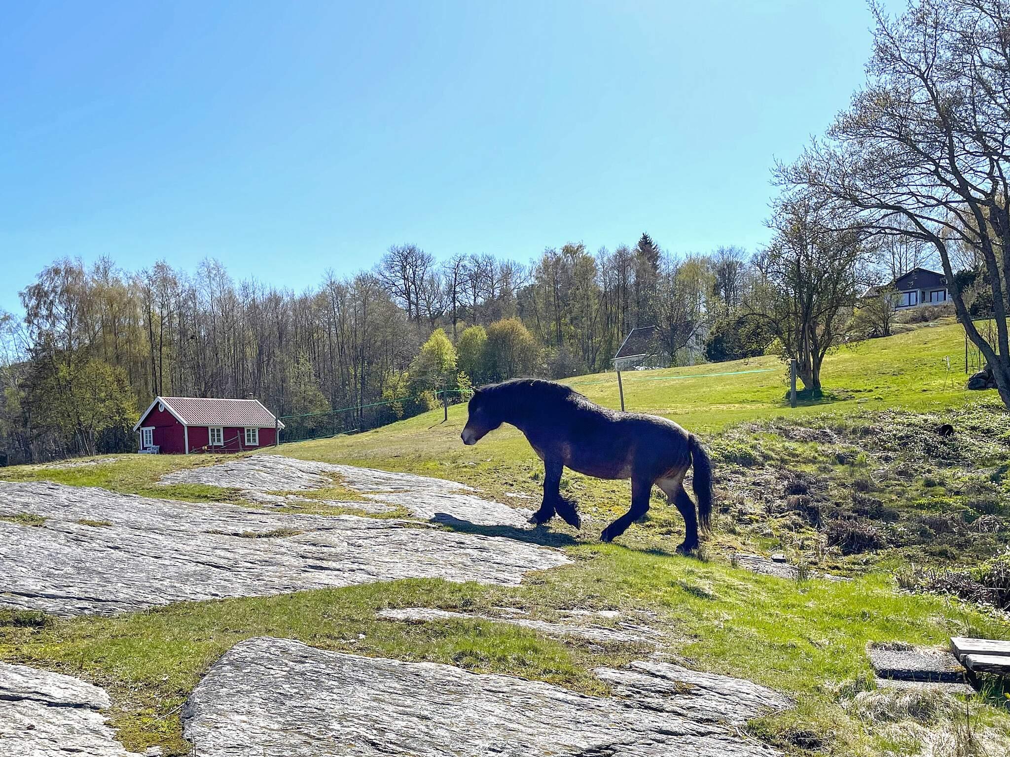 För att komma ner till den mysiga stranden med sand, gräsmatta, klippor och brygga – ta en kort promenad och passera hagen med hästar.