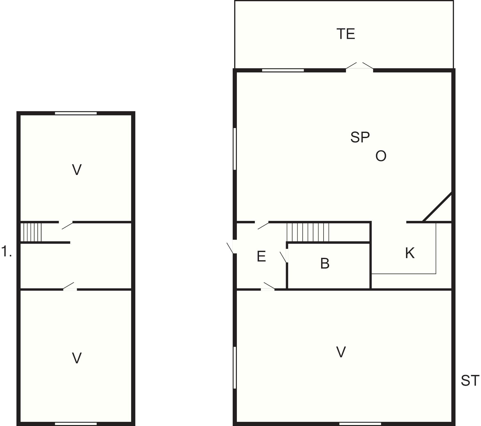 Innanför de vackert blå dubbeldörrarna i hallen är det full takhöjd till övervåningen med två sovrum med två enkelsängar i vardera rum. Den branta trappan upp med ett rep att hålla sig i för säkerhets skull leder dig dit. I hallen finns också badrummet med toalett och dusch där varmvattenmängden är begränsad.